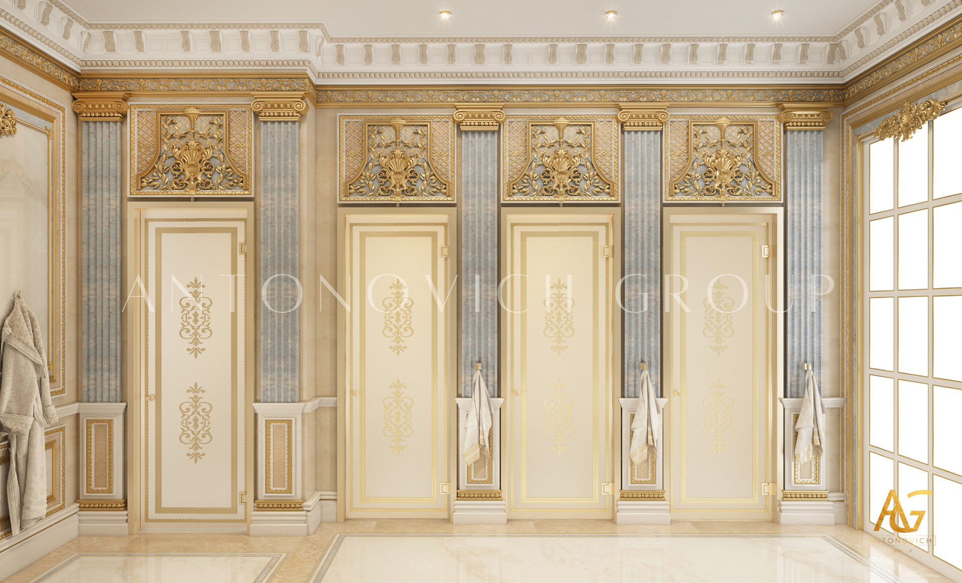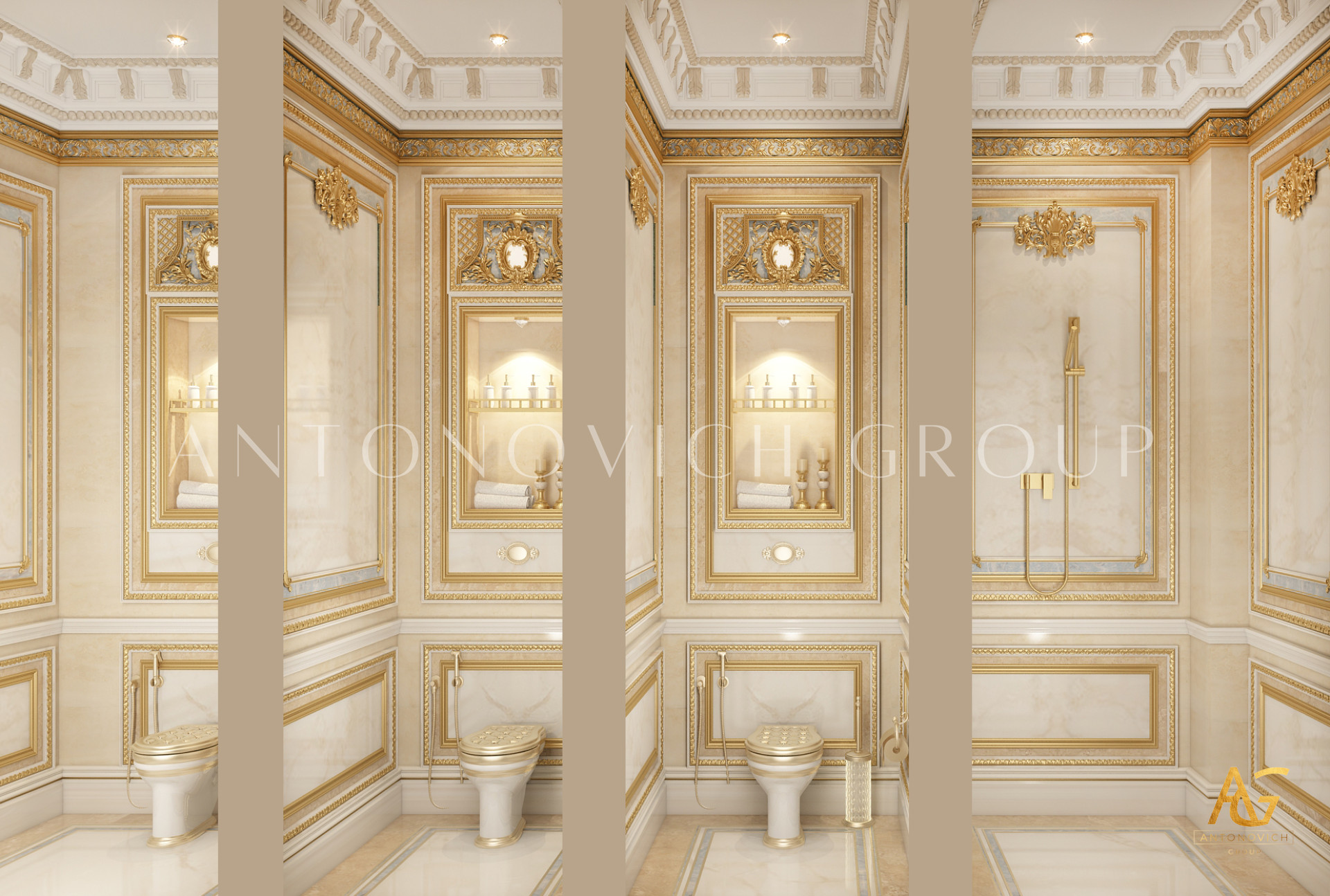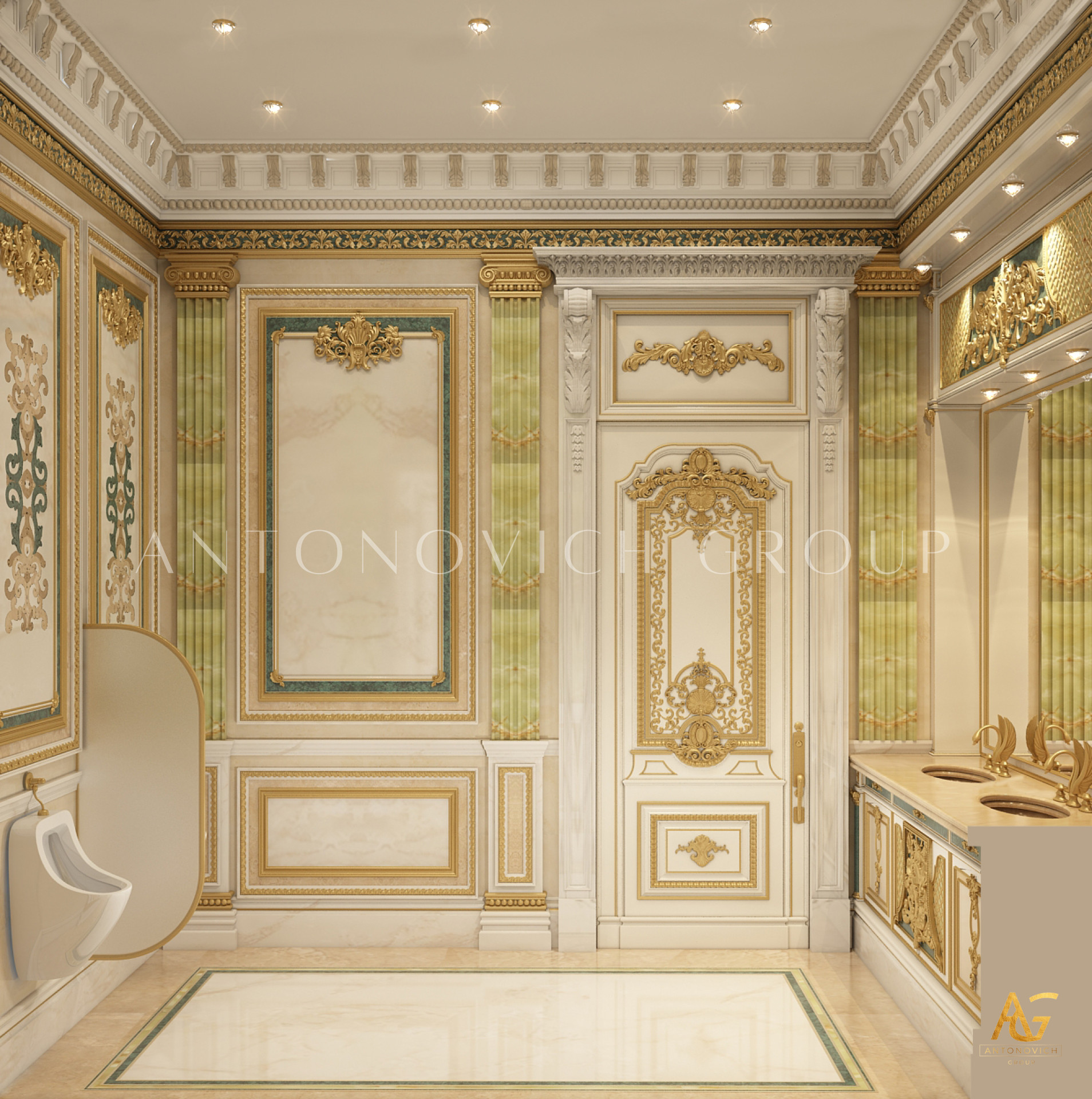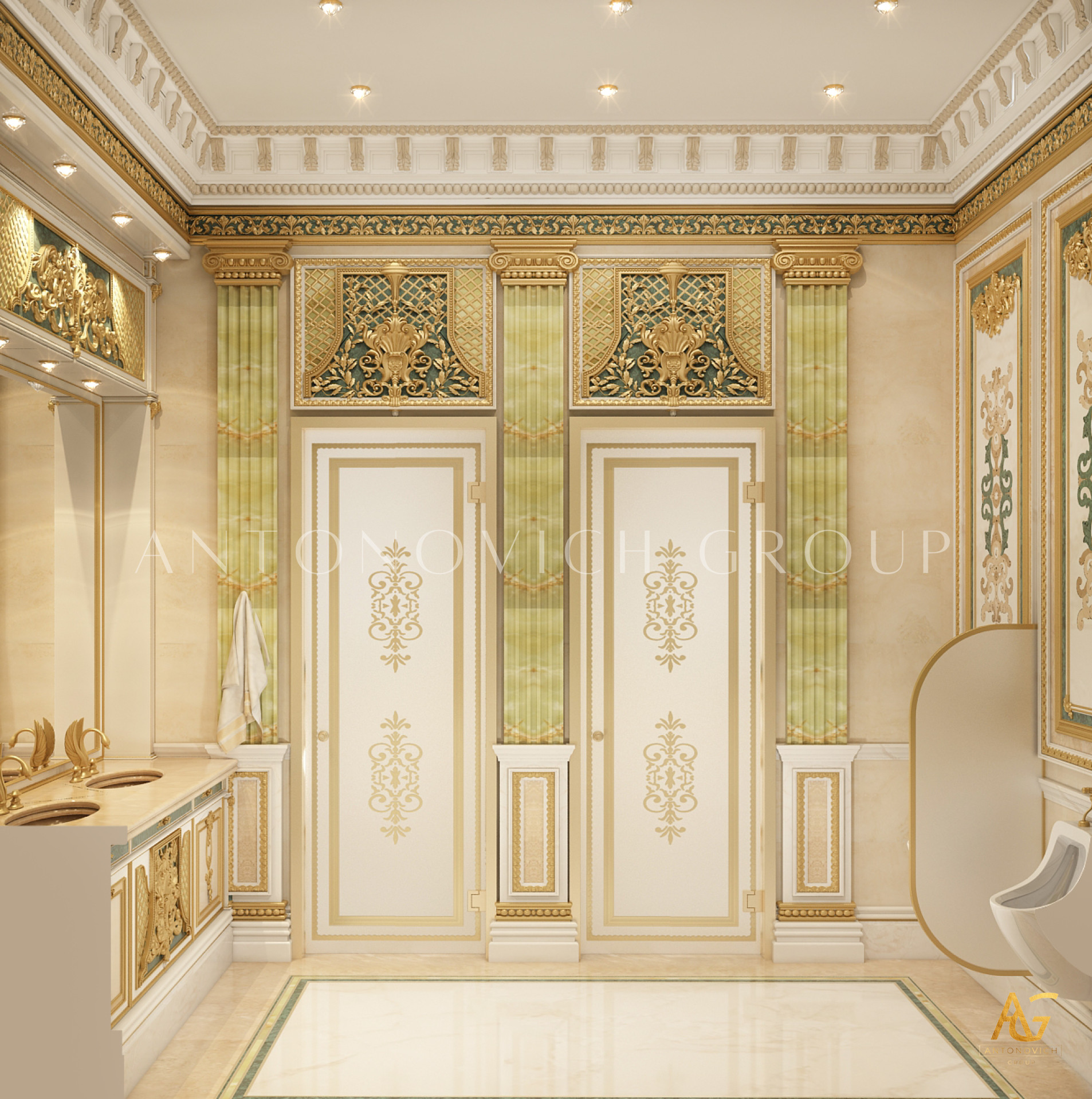 The interior of the bathroom, perhaps the second dream after the interior of the bedroom, the design of which is created exclusively for the absolute comfort of owners. This stunning in its beauty version of the design of a large bathroom has become the realization of the dreams of our customers about its exclusive interior in the Art Nouveau style. Designers of the interior design studio Luxury Antonovich Design offered a quite interesting solution in terms of interior layout. Since the large area of the bathroom, which was allocated according to the design project of the elite house, allowed to improvise with space. We proposed to make a clear division of the interior into two zones. And as a way to delimit space a luxurious partition with the original decor was used. In general, the bathroom interior (decor of walls and floors) is dominated by natural marble. This material makes the interior not only beautiful in its natural harmony, but also durable, as well as prestigious. The partition of marble is decorated with geometric ornament of polished brass. This gives the interior charm and shine. Space, where the bathroom itself is located has the effect of a beautiful infinity. This remarkable effect, designers of the interior design studio Antonovich Design achieved by using lighting accents. Walls and ceilings in a certain order adorned by the lines of LED lighting. This makes a visual effect of the infinity of the bathroom space. With all the conciseness of modern style, the designers managed to bring into this style very bright and expressive notes.