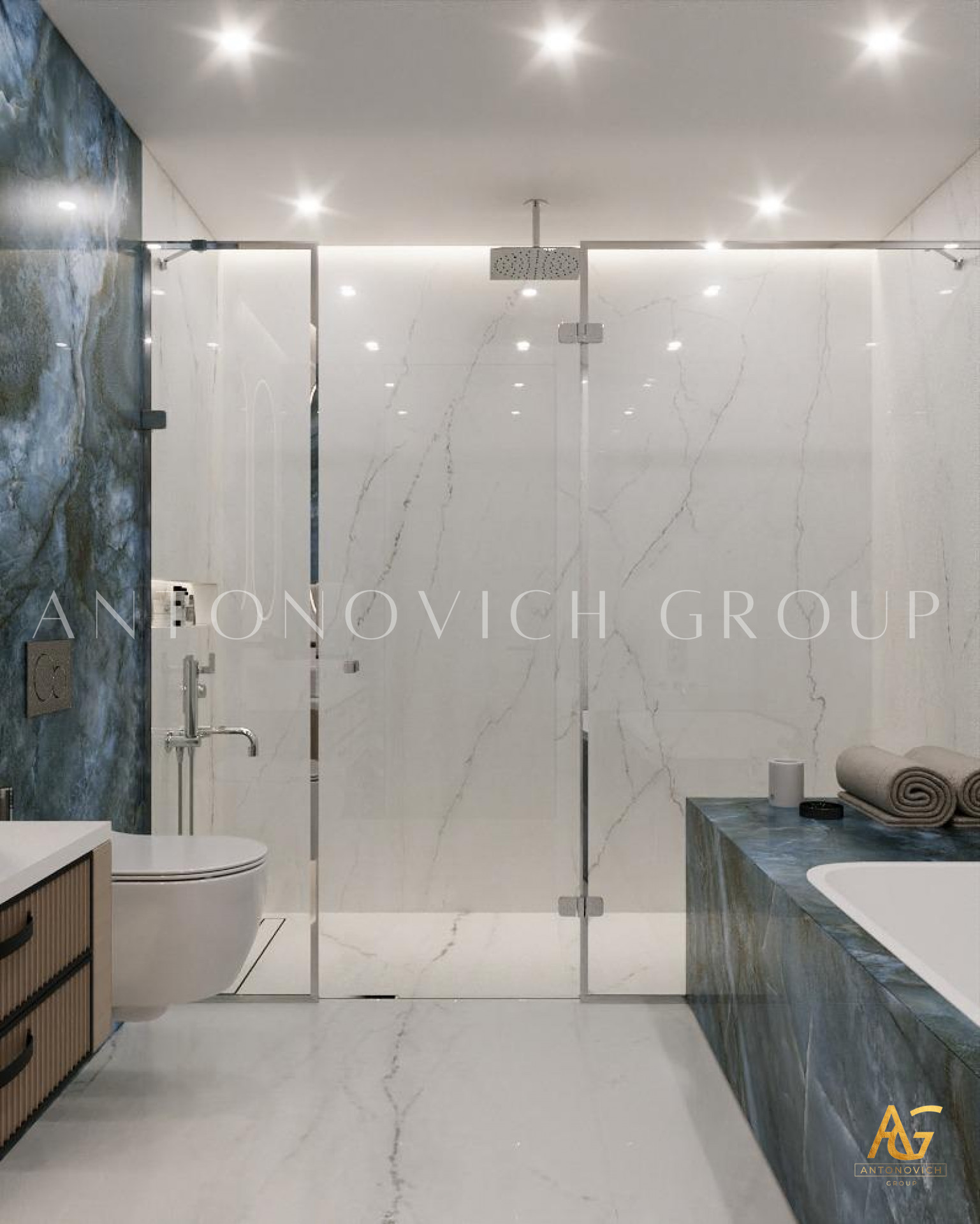 Antonovich Group's modern bathroom interior designs with high-end marbles and sanitary solutions epitomize the fusion of beauty and functionality. These spaces transcend the mundane, transforming into luxurious havens that reflect the occupants' tastes and desires. With a keen eye for aesthetics, a commitment to innovation, and an unwavering dedication to creating exceptional living spaces, Antonovich Group sets a new standard for modern bathroom design – where each element is a symphony of luxury, comfort, and sophistication.