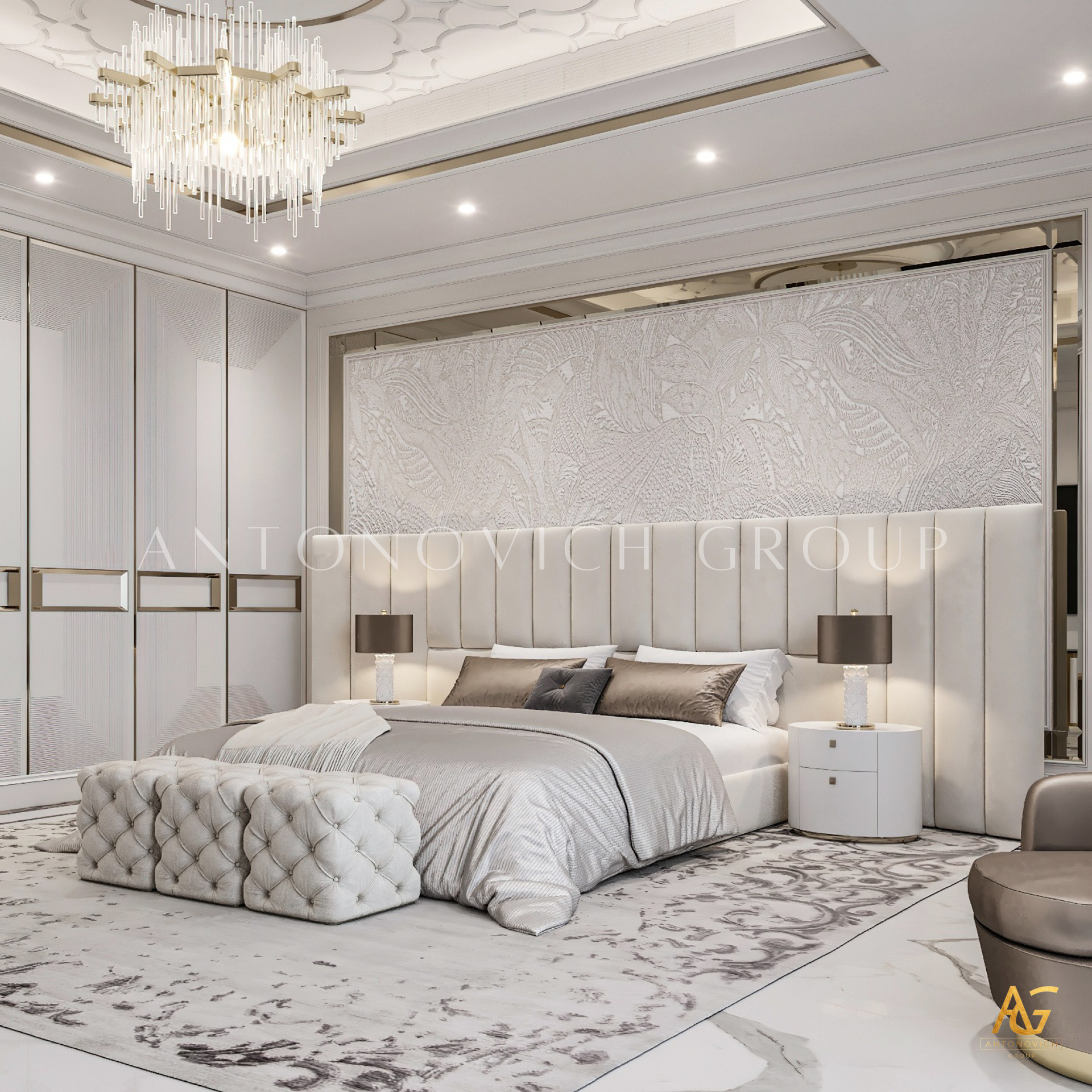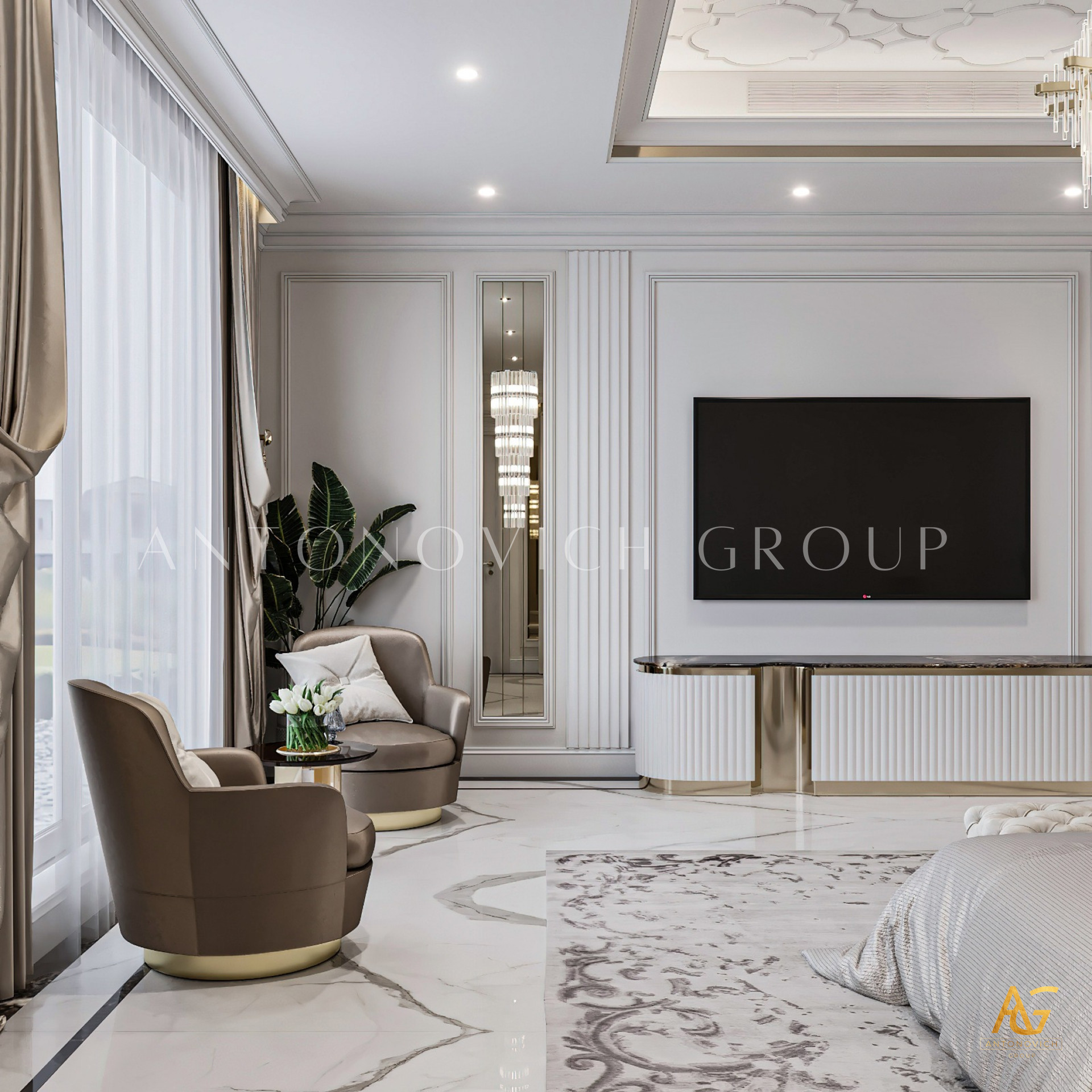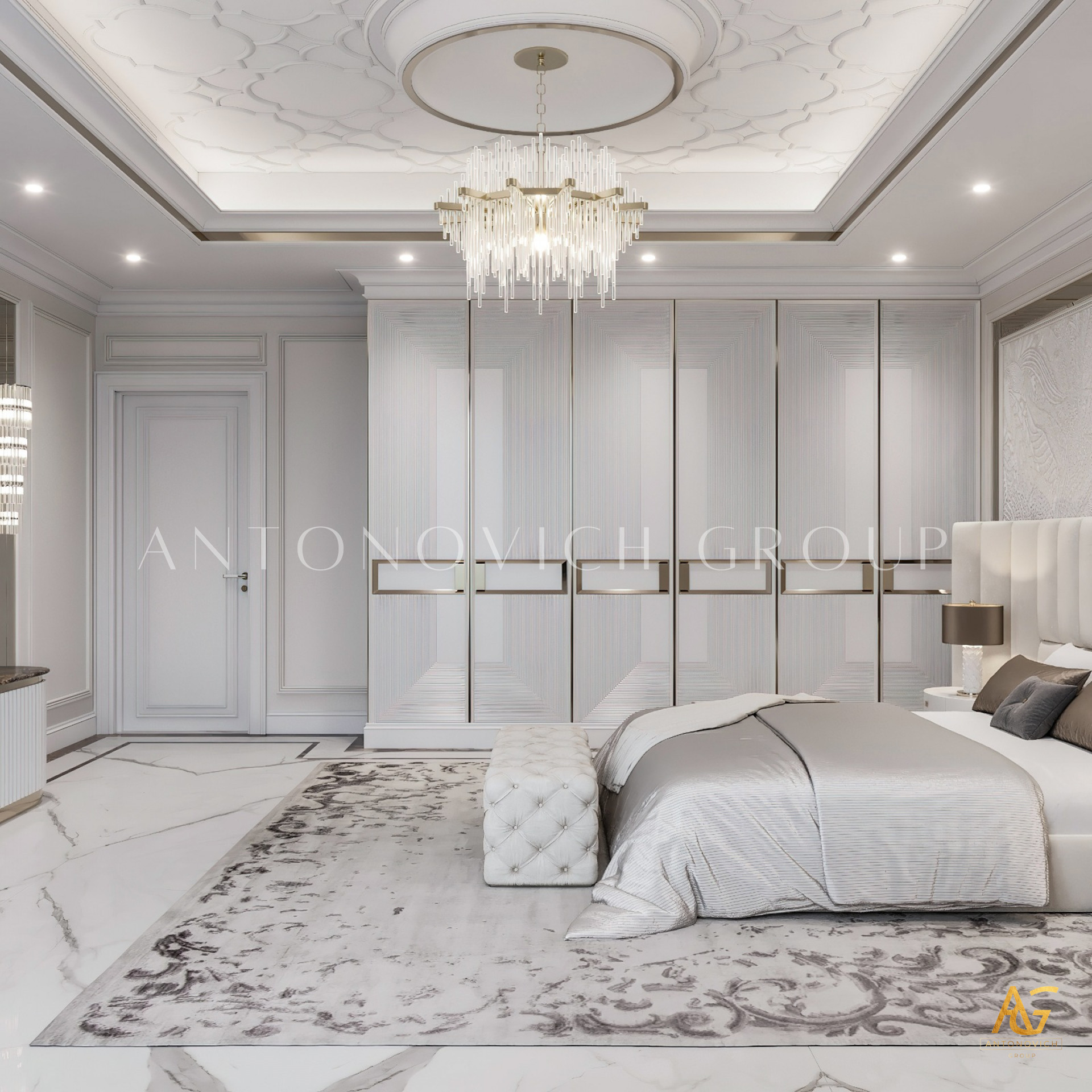 Antonovich Group believes that every piece of furniture should be a statement in itself. In a white and gold-themed bedroom, the choice of furnishings plays a crucial role in achieving the desired aesthetic. Luxurious bed frames with intricate gold detailing, ornate bedside tables, and plush seating arrangements exude opulence while maintaining comfort and functionality.
