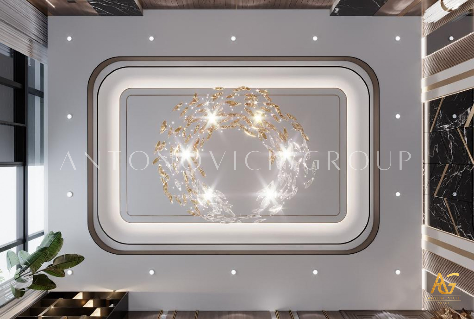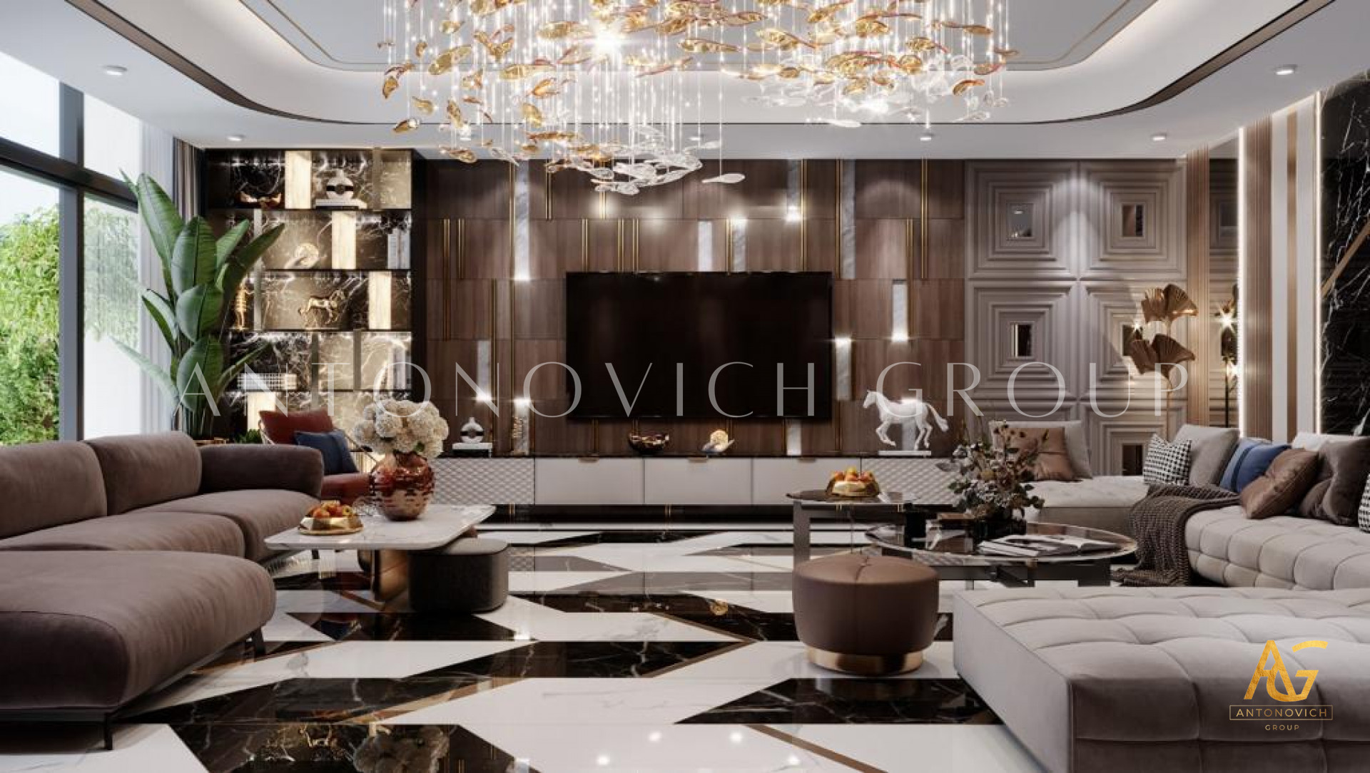 A spacious and classy living room interior design by Antonovich Group. Every piece of furniture and decorations is filled with elegance and style with full of class and sophistication. Our interior designers who have been very expert in selecting each and every material that fills in the full interior mood have carefully selected the finest quality and premium class materials that perfectly fit the interior mood of the living room which is being required.