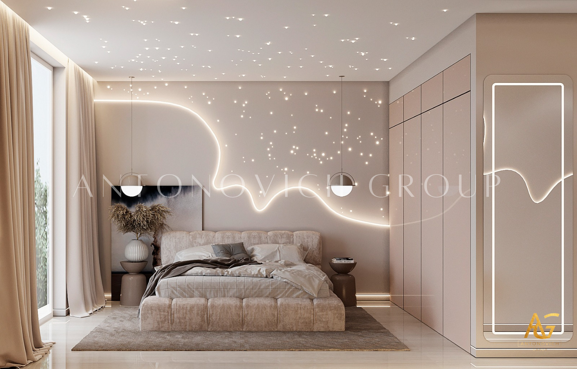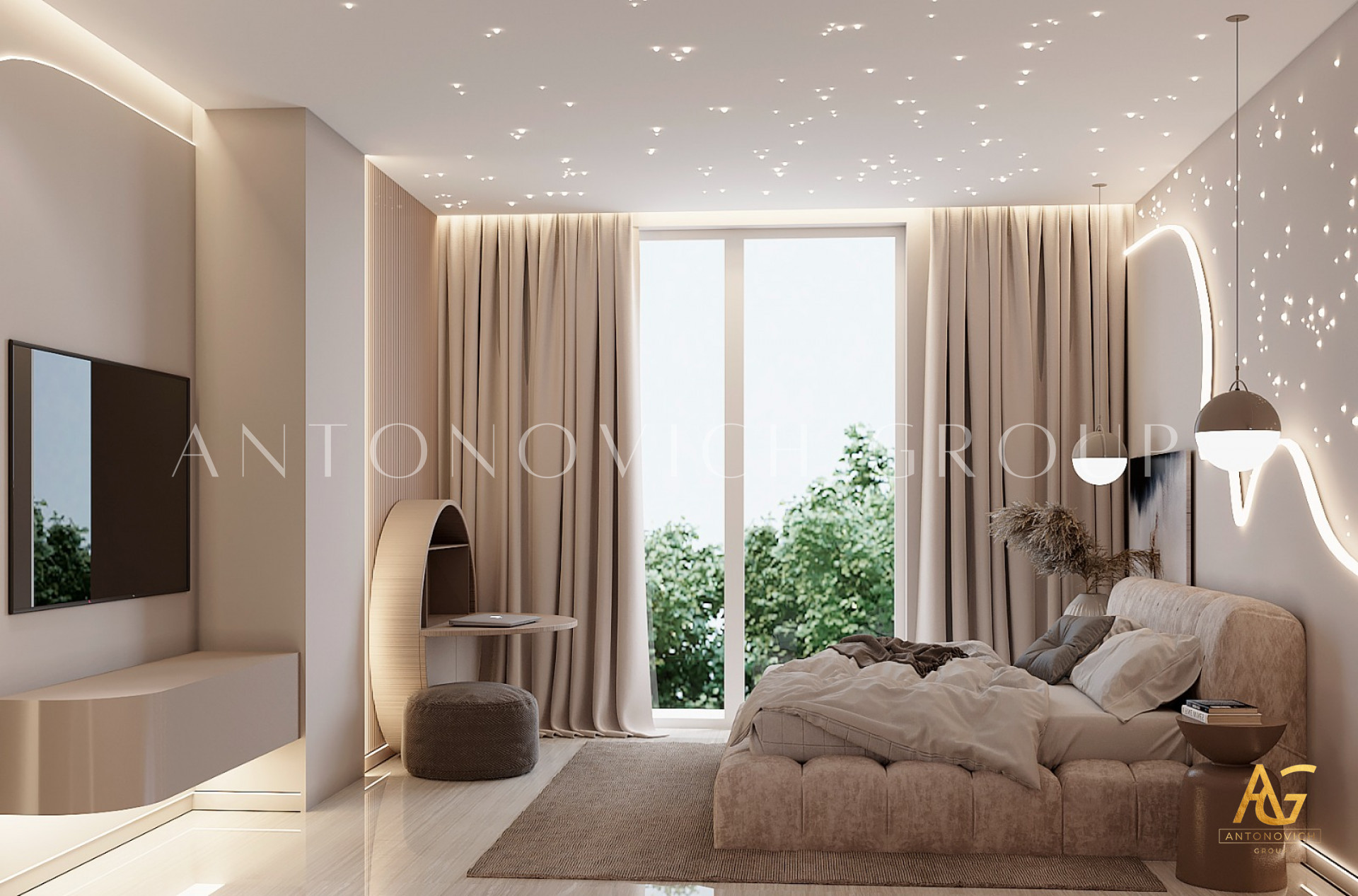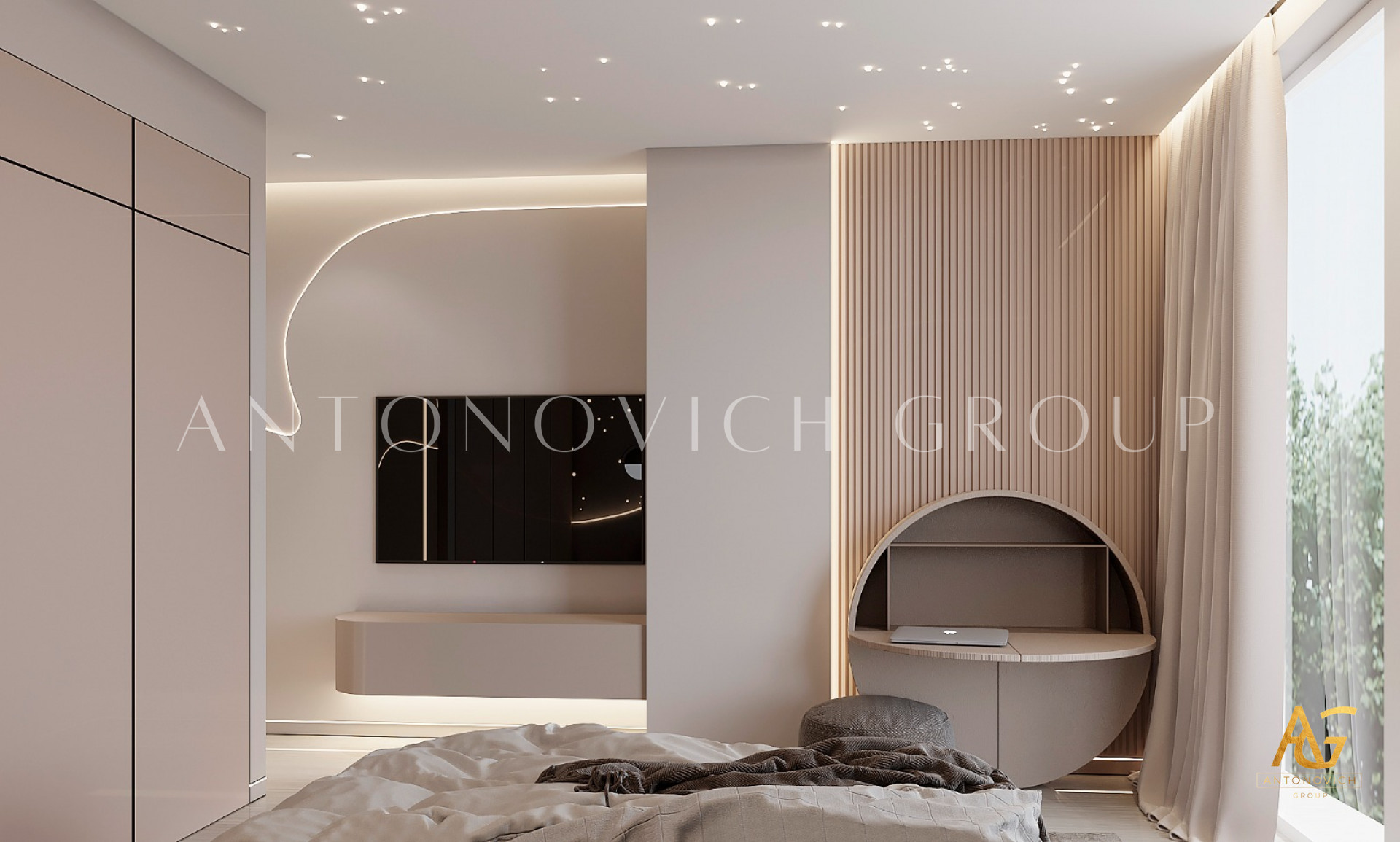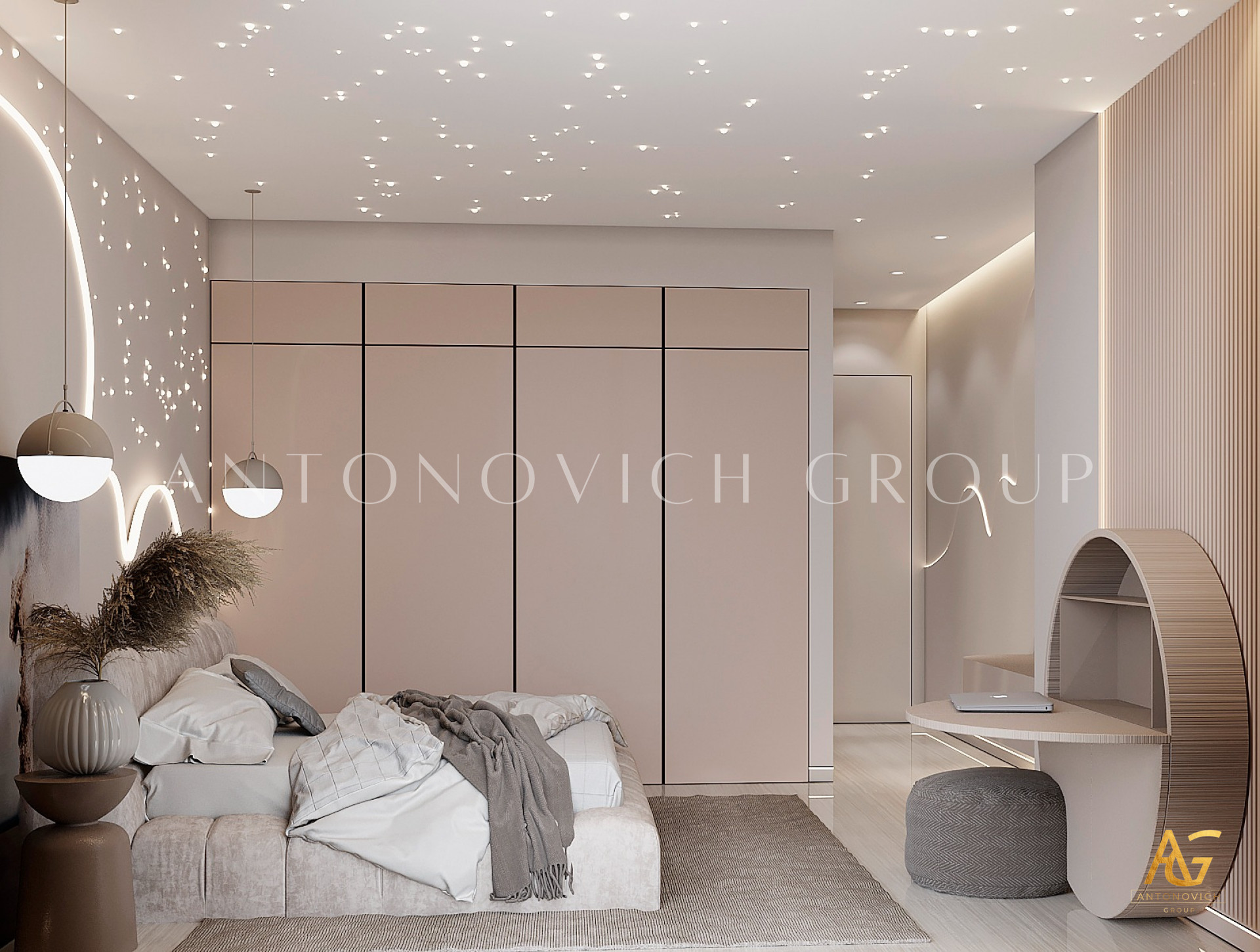 Bespoke furniture pieces, crafted by Antonovich Group, adhere to the principles of aesthetic modern minimalism. Streamlined bed frames, modular storage units, and sleek study desks contribute to a cohesive design that emphasizes simplicity without compromising on style. The careful selection of multifunctional furniture ensures that each piece serves a purpose while contributing to the overall aesthetic.