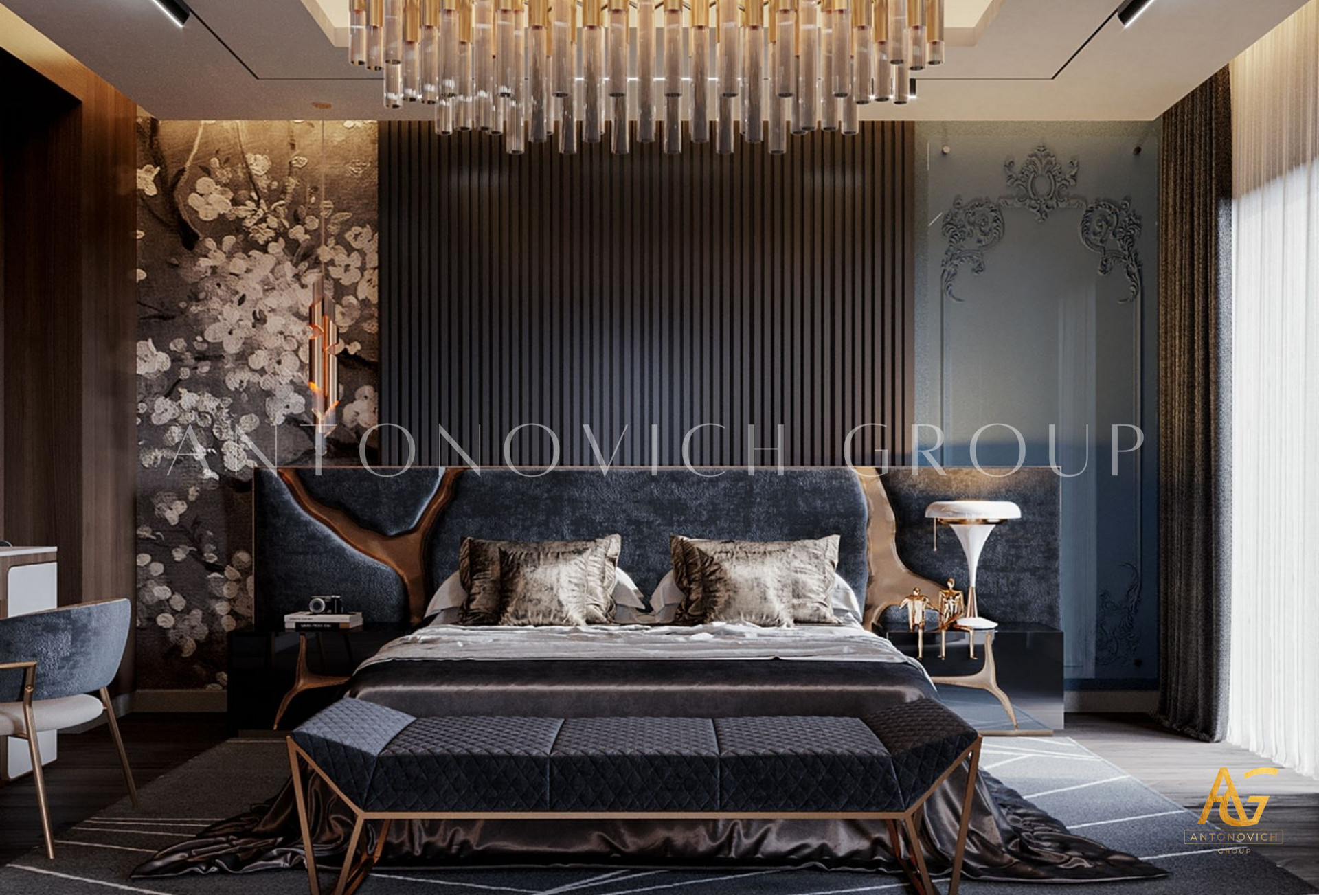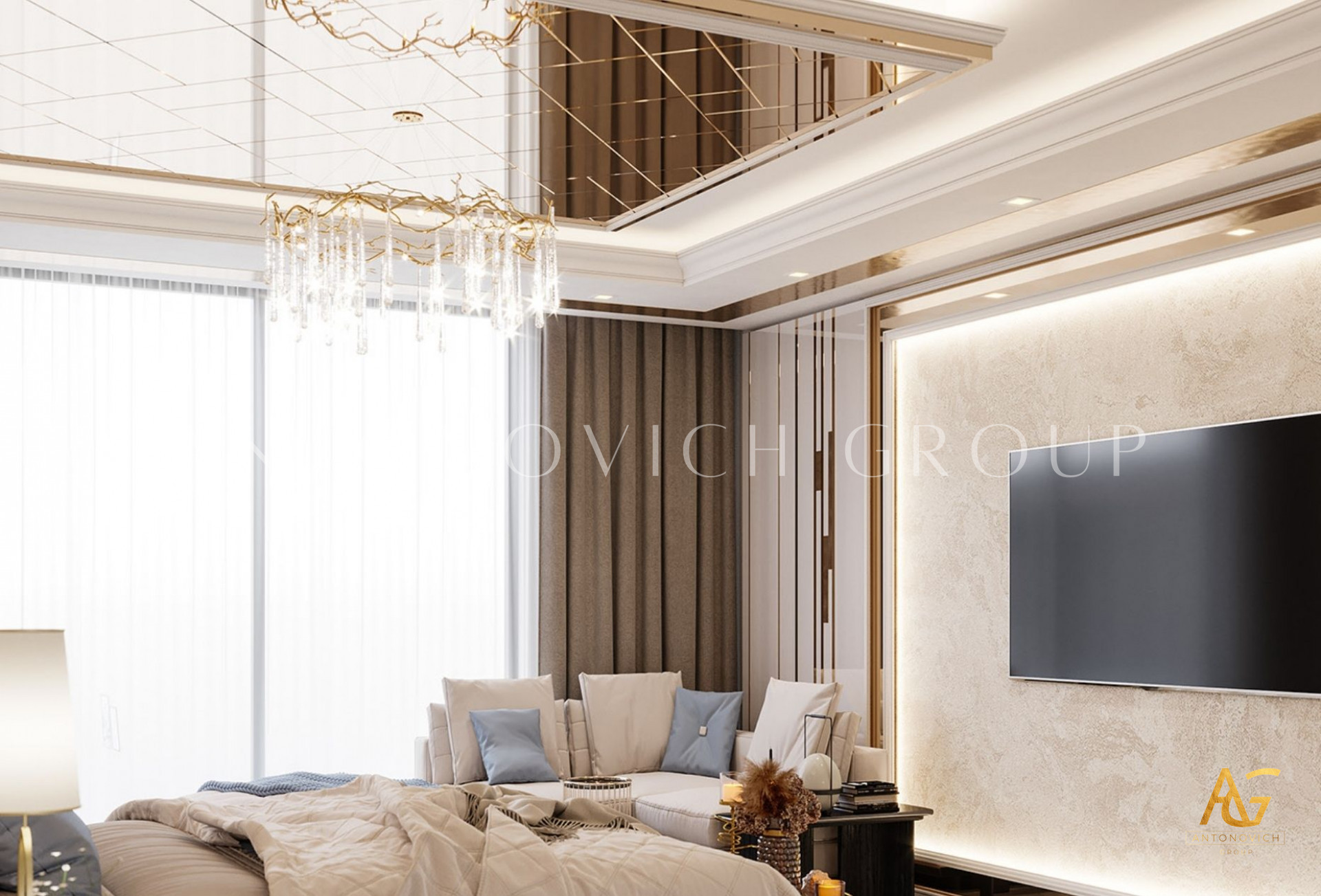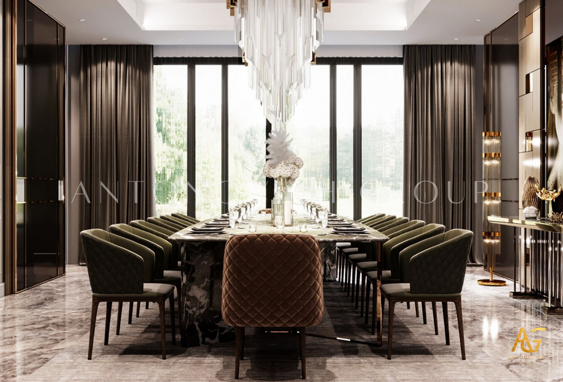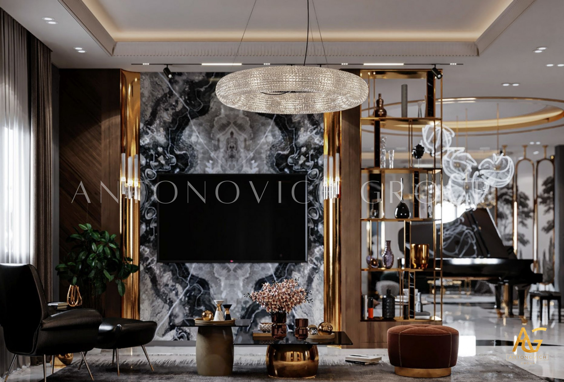 One of the nicest aspects of this luxury Dubai villa design plans is the overlooking high-ceiling. The arrangement is fantastic, as you can see from the second story. To complete the overall wonderful atmosphere of the luxury Dubai villa design plans, stunning furniture designs, beautiful accents, and high-quality materials were employed. Everything was put together to create a sumptuous atmosphere that is really stunning. In the completion of this luxury Dubai villa design plans, Luxury Antonovich Design examined two things: defining the overall aesthetic of the space and determining the primary places for furniture arrangement.
