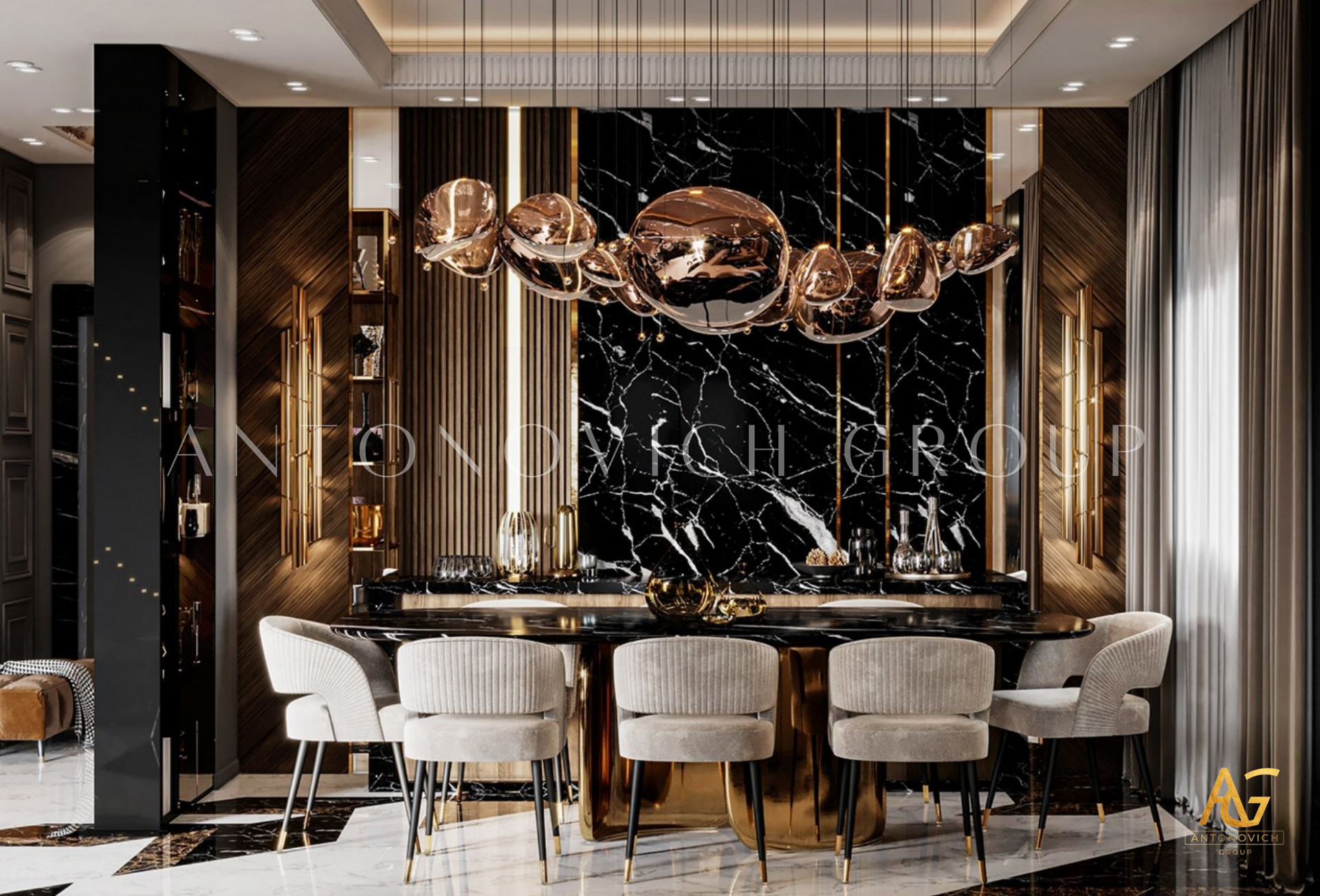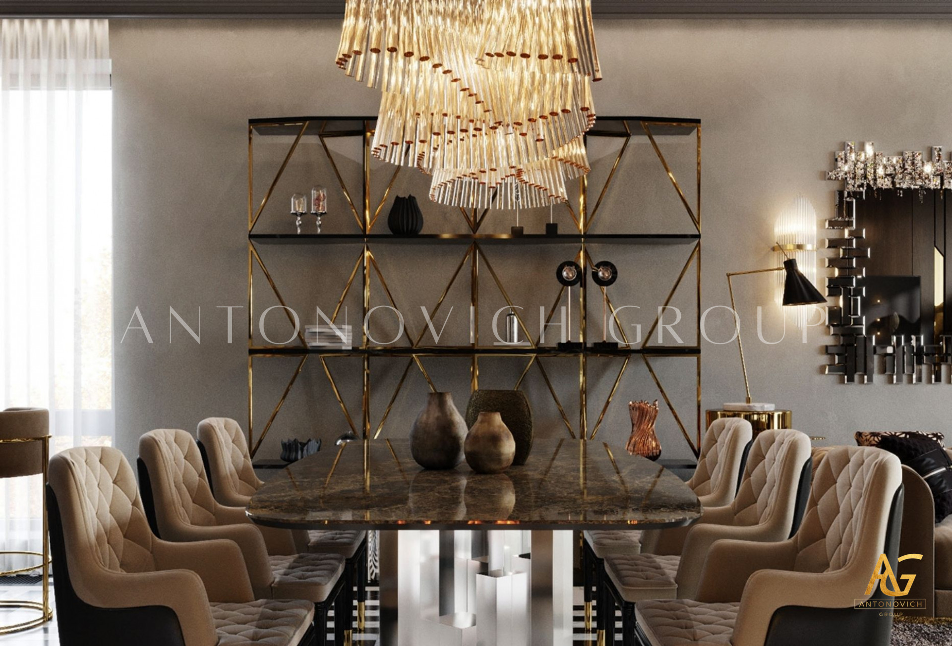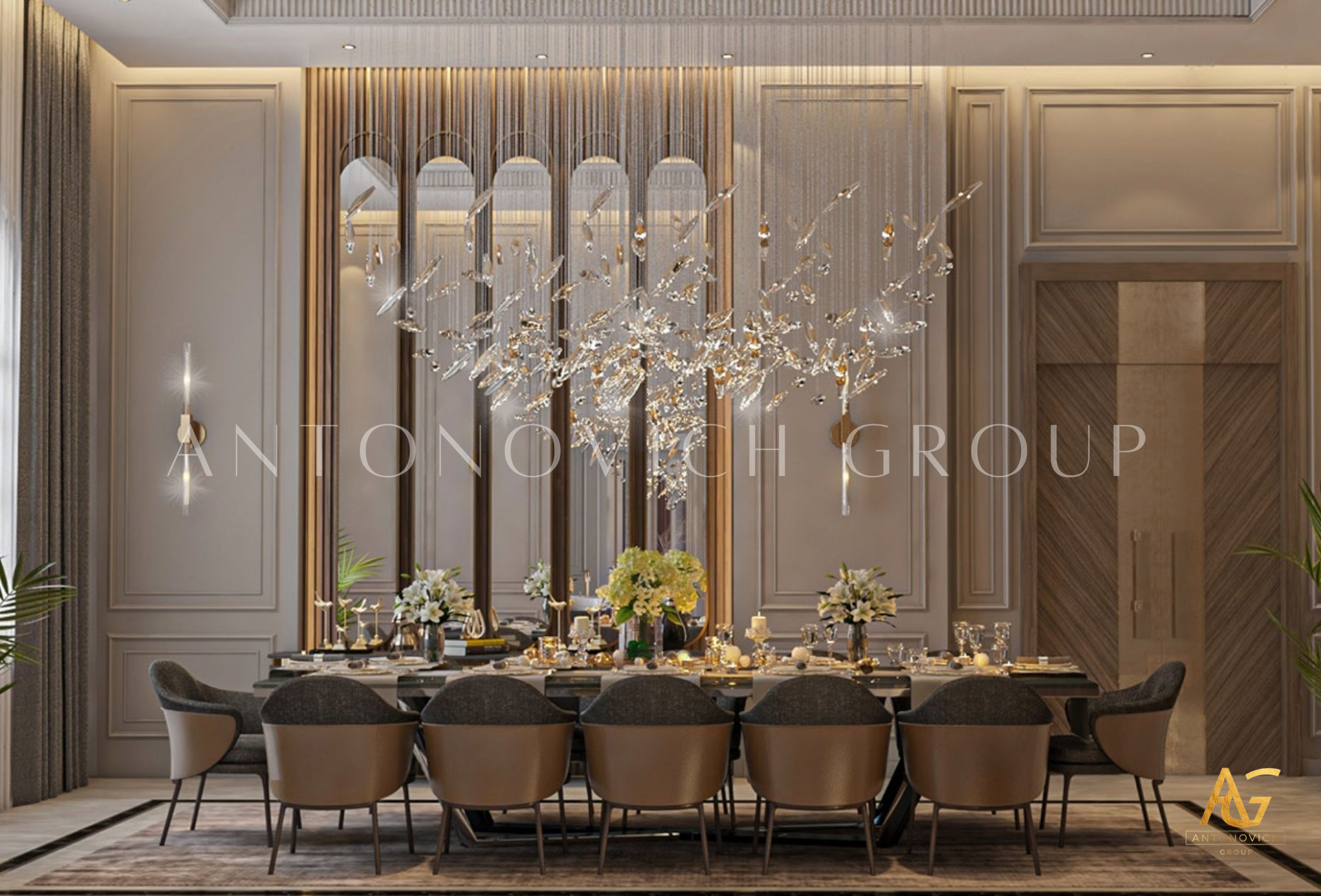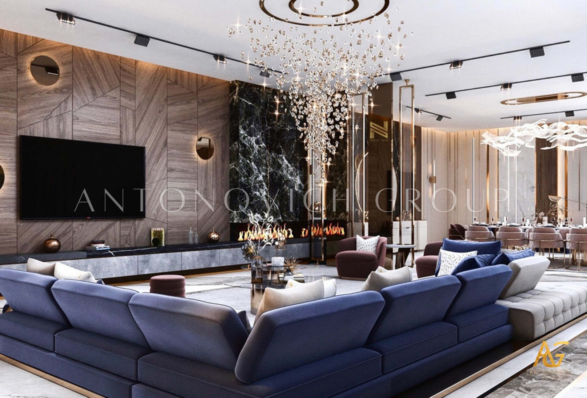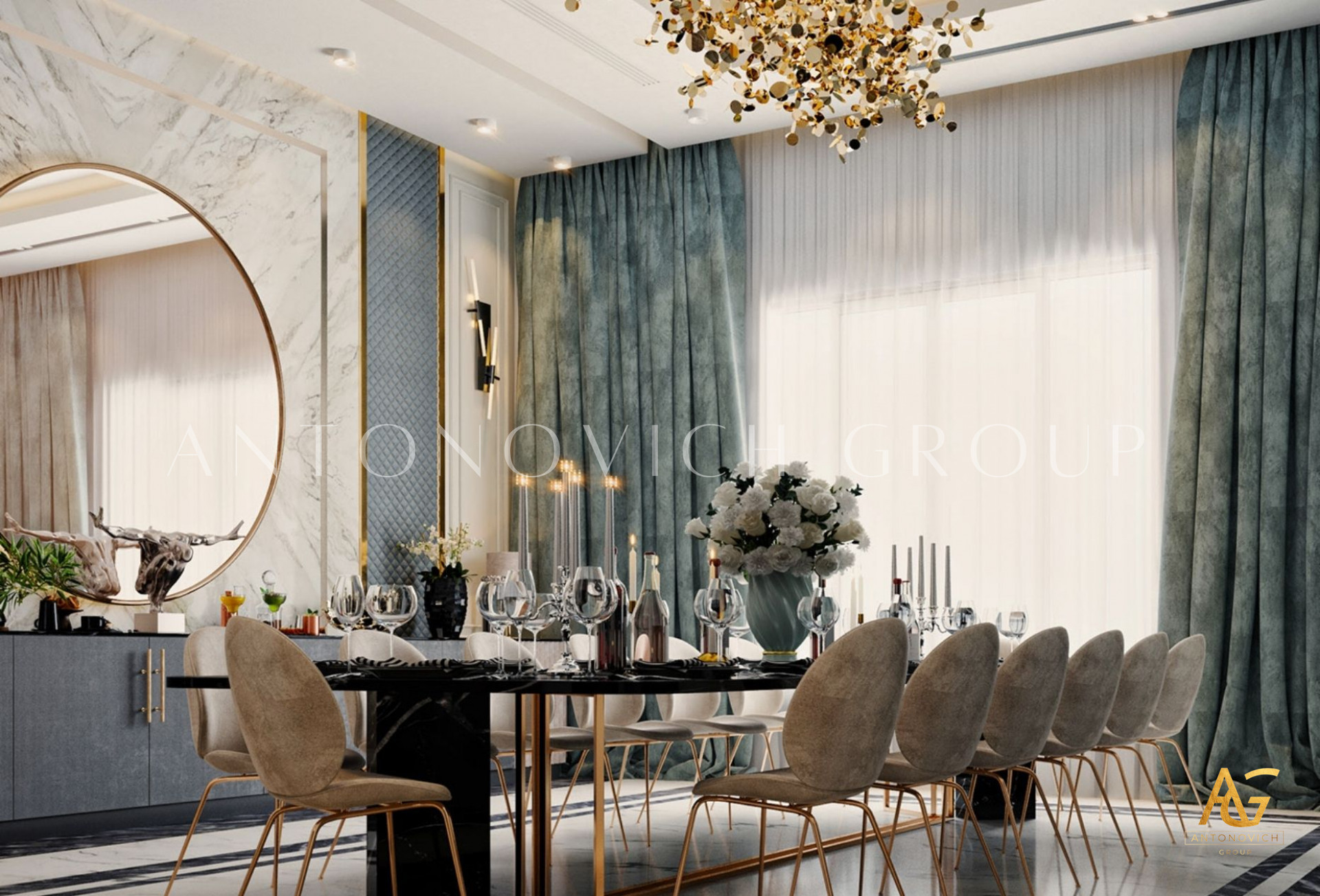 Luxury Antonovich Design created it in a modern style with practical features and bright colors. After the Dubai villa design plans was completed, the customers were pleased with the results. Theyve transformed their bland high-rise into a warm and inviting house thats not just well-designed but also comfy and lavish! The living area is only a few steps away from the large dining room. Because of the tall, big windows, fitting the entire luxury Dubai villa design plans and the kitchen has been wonderful. The luxury home interior design Dubai chose to make things better.