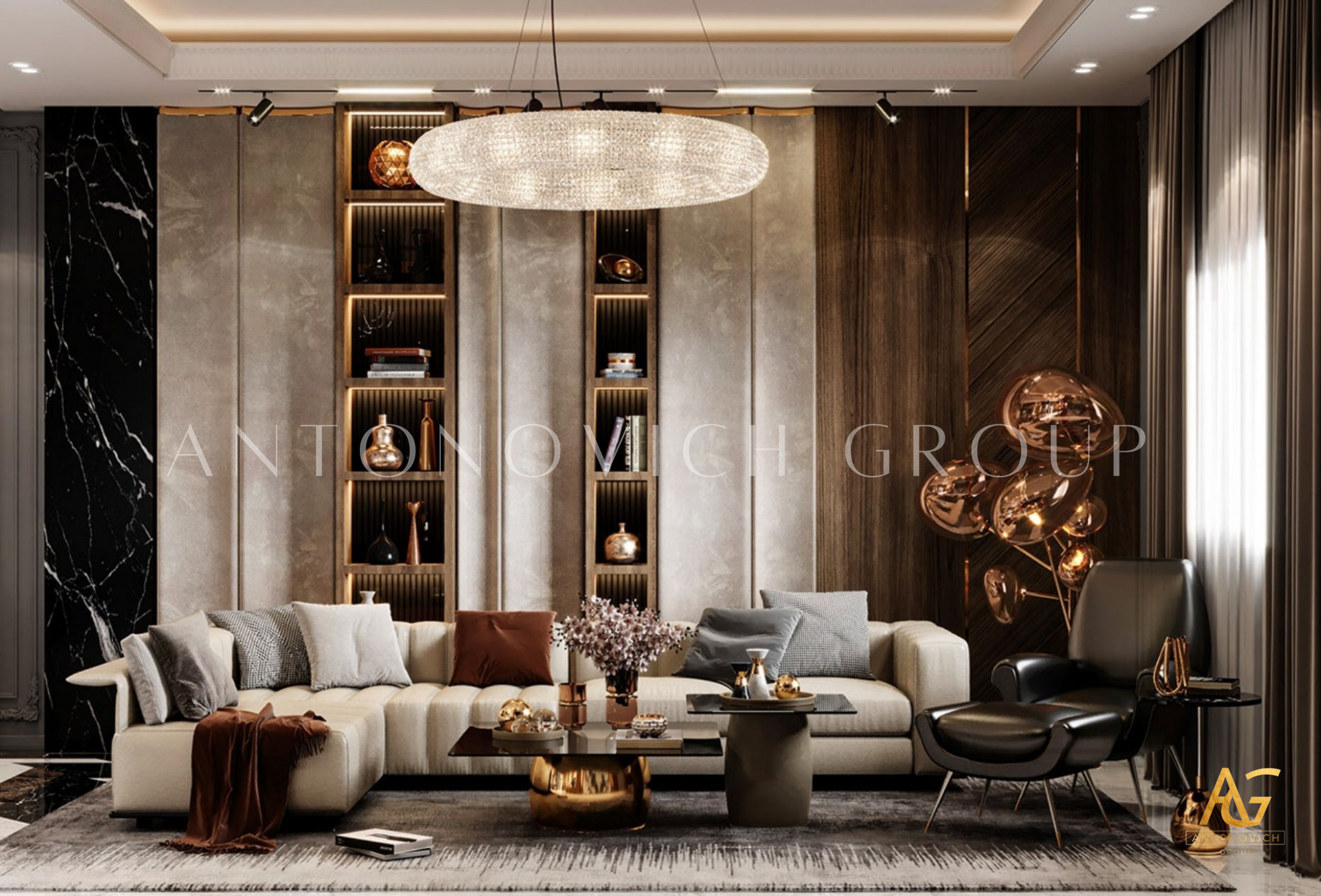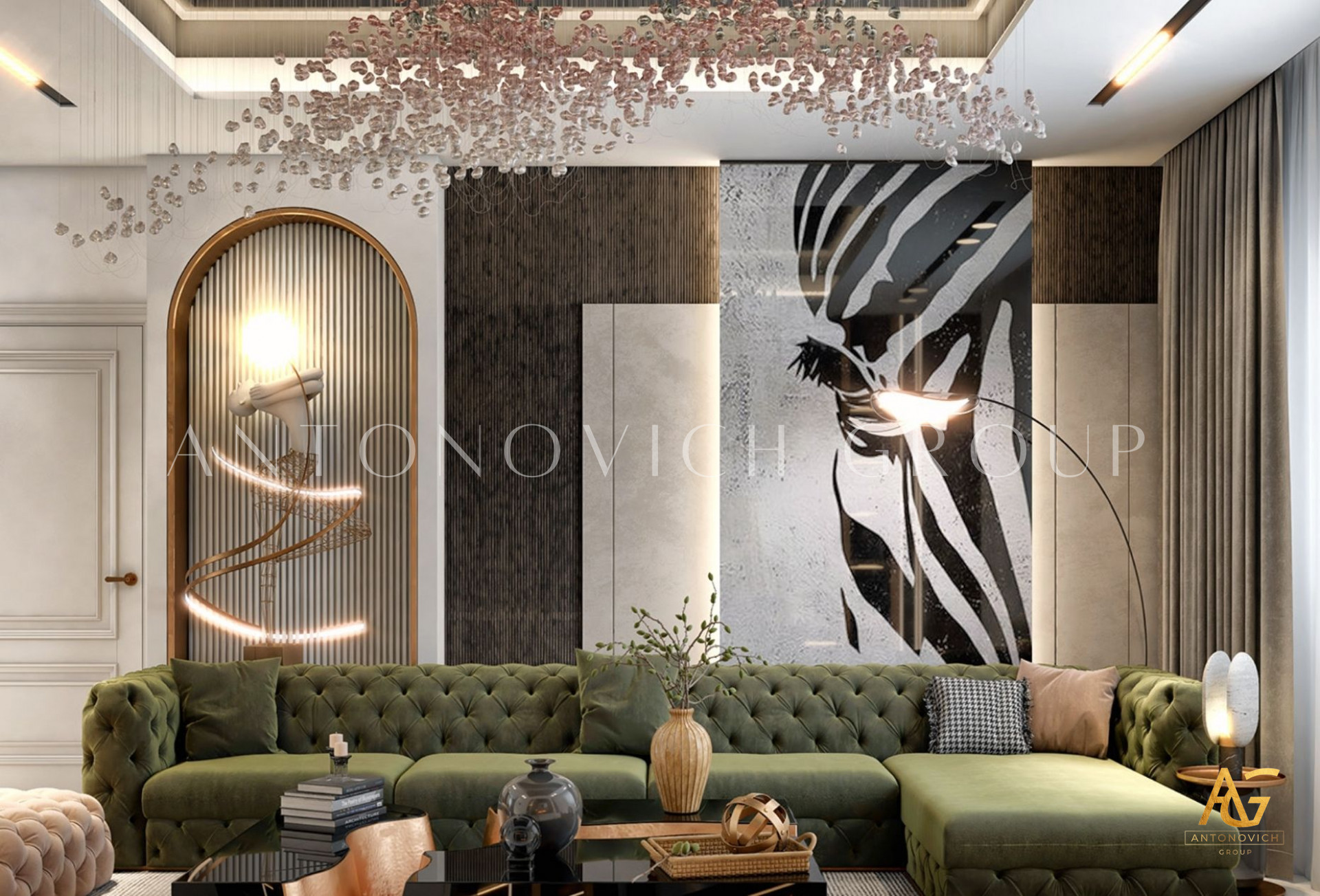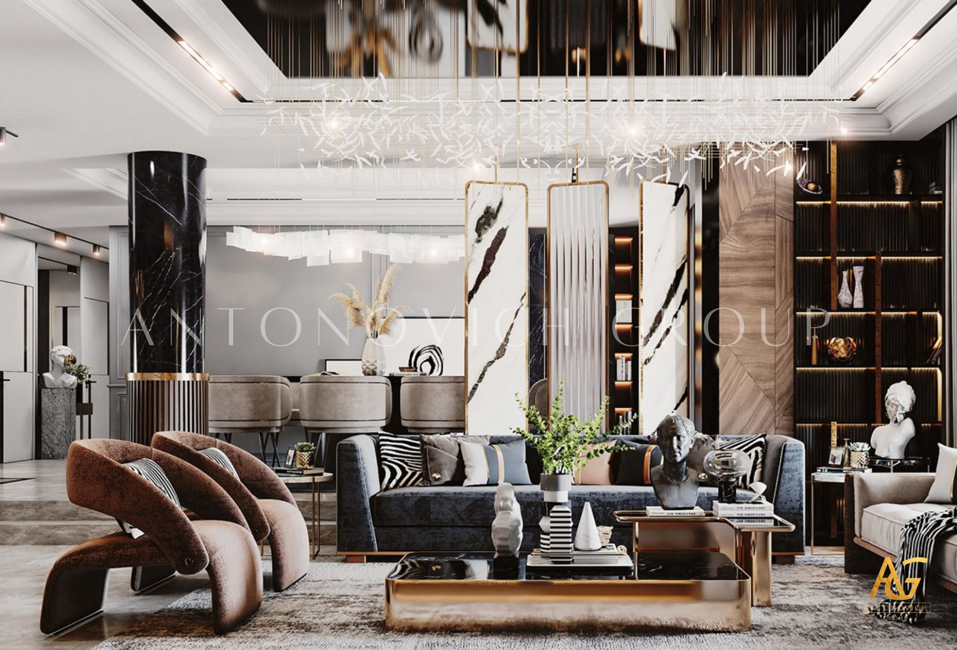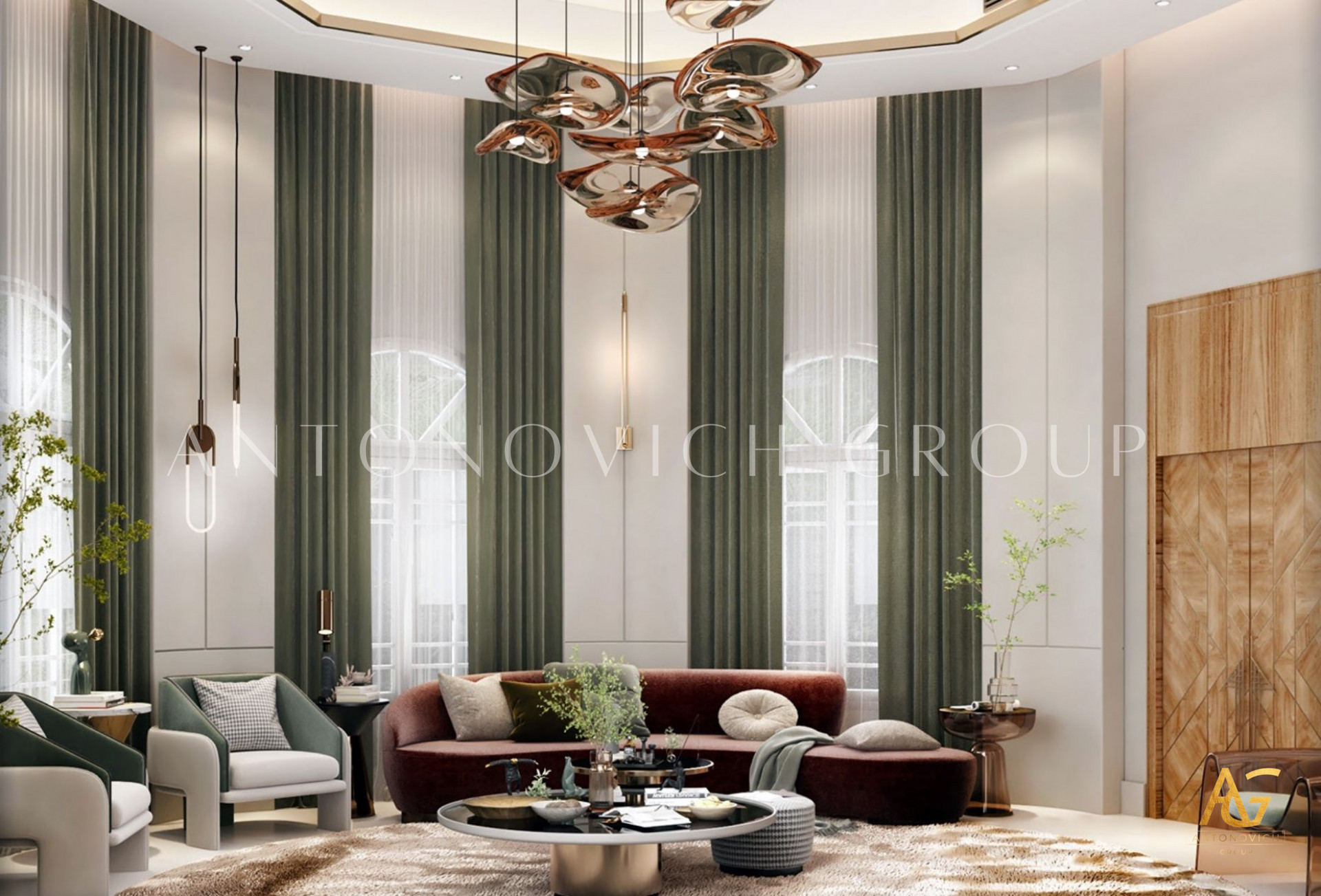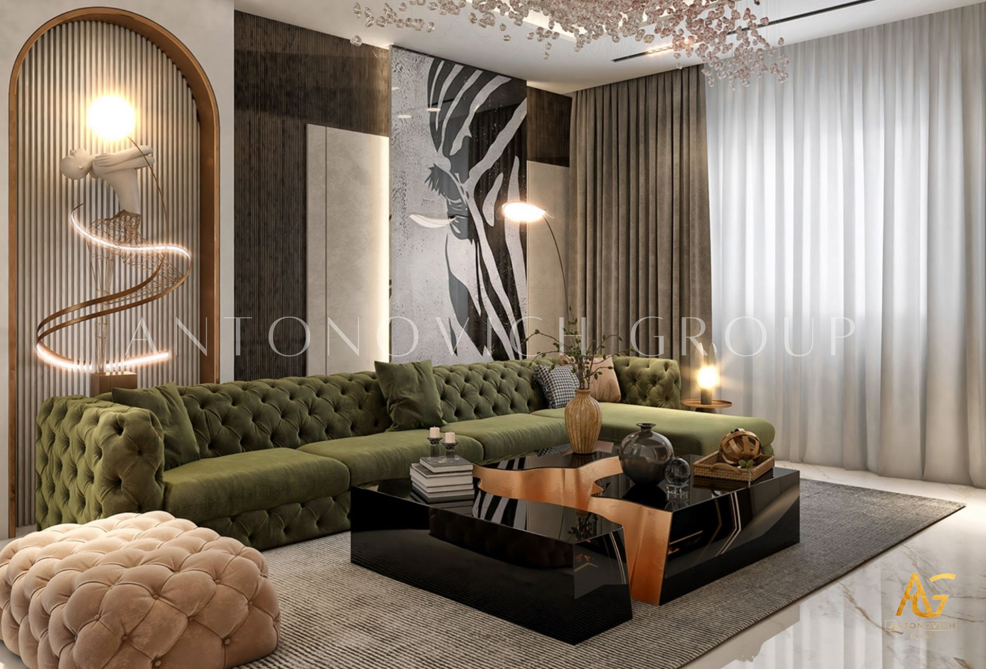 Luxury Antonovich Design created it in a modern style with practical features and bright colors. After the Dubai villa design plans was completed, the customers were pleased with the results. Theyve transformed their bland high-rise into a warm and inviting house thats not just well-designed but also comfy and lavish! The living area is only a few steps away from the large dining room. Because of the tall, big windows, fitting the entire luxury Dubai villa design plans and the kitchen has been wonderful. The luxury home interior design Dubai chose to make things better.
