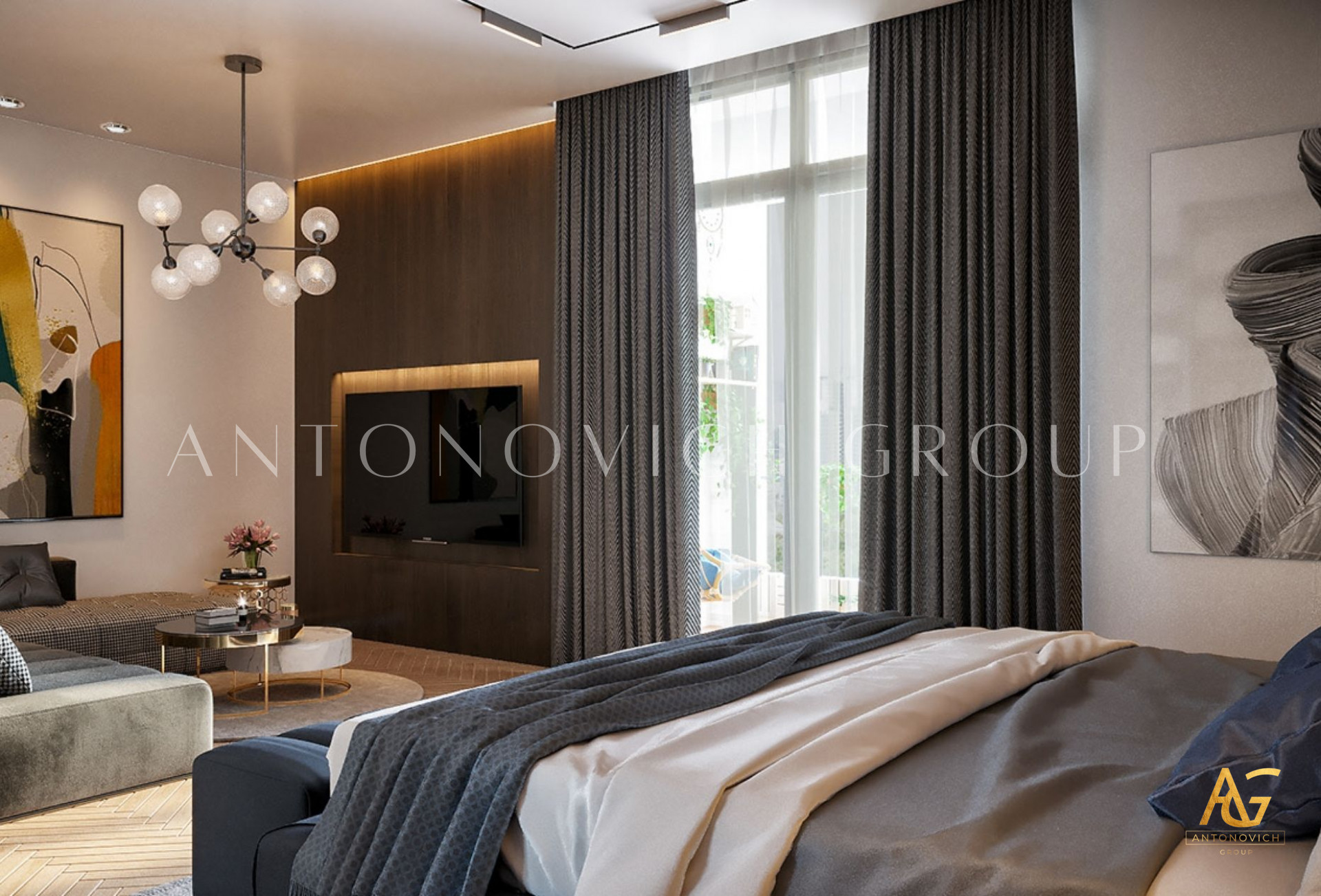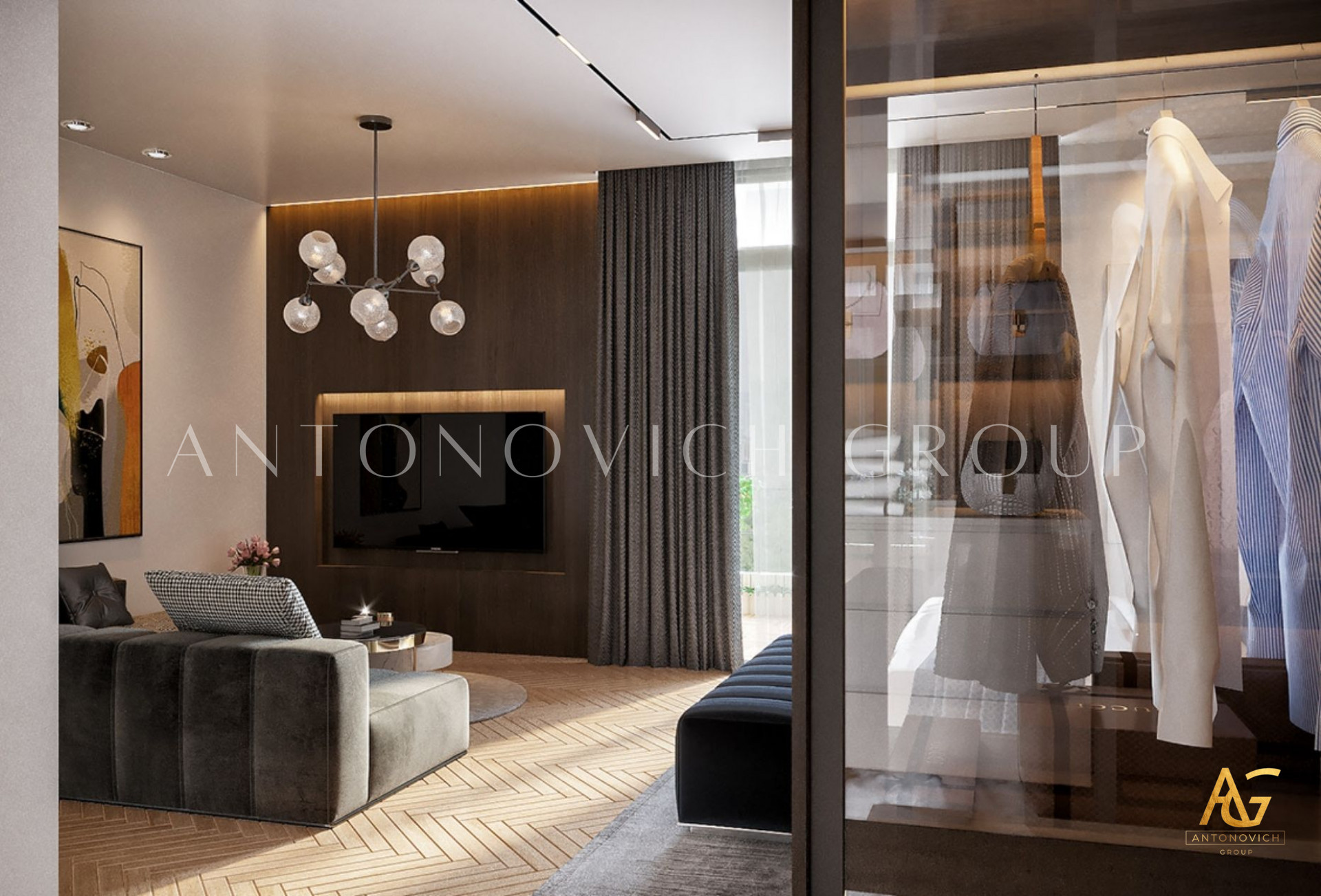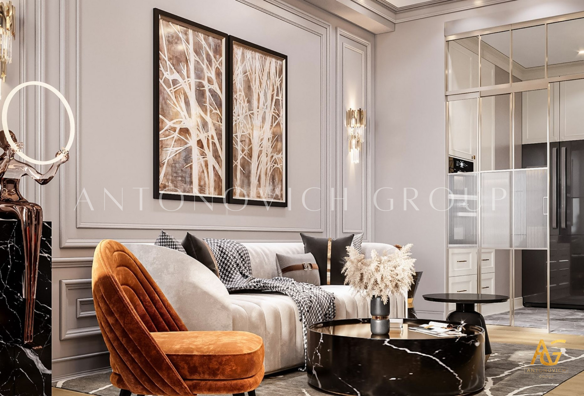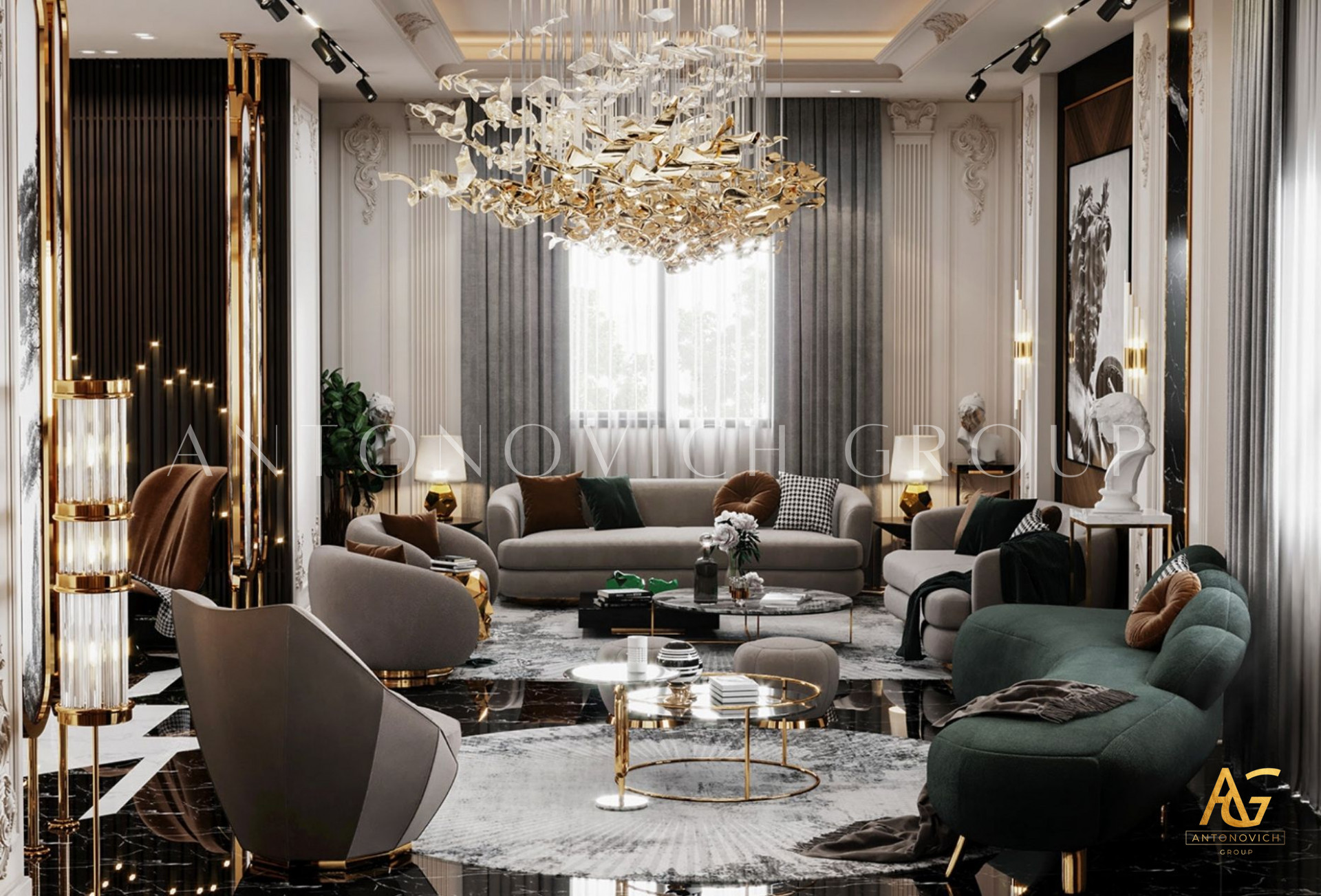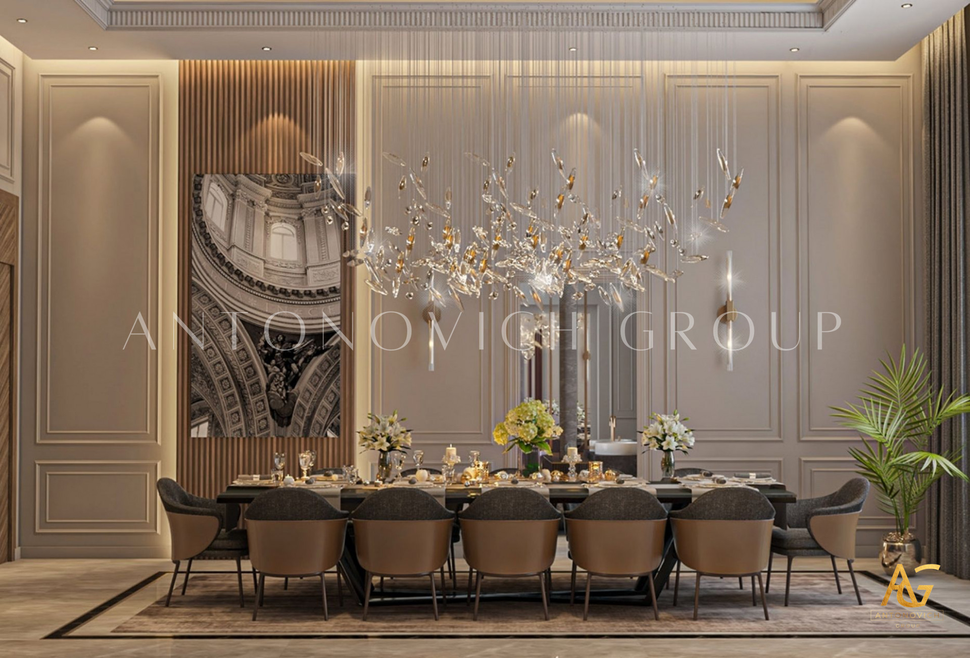 Luxury Antonovich Design created it in a modern style with practical features and bright colors. After the Dubai villa design plans was completed, the customers were pleased with the results. Theyve transformed their bland high-rise into a warm and inviting house thats not just well-designed but also comfy and lavish! The living area is only a few steps away from the large dining room. Because of the tall, big windows, fitting the entire luxury Dubai villa design plans and the kitchen has been wonderful. The luxury home interior design Dubai chose to make things better.