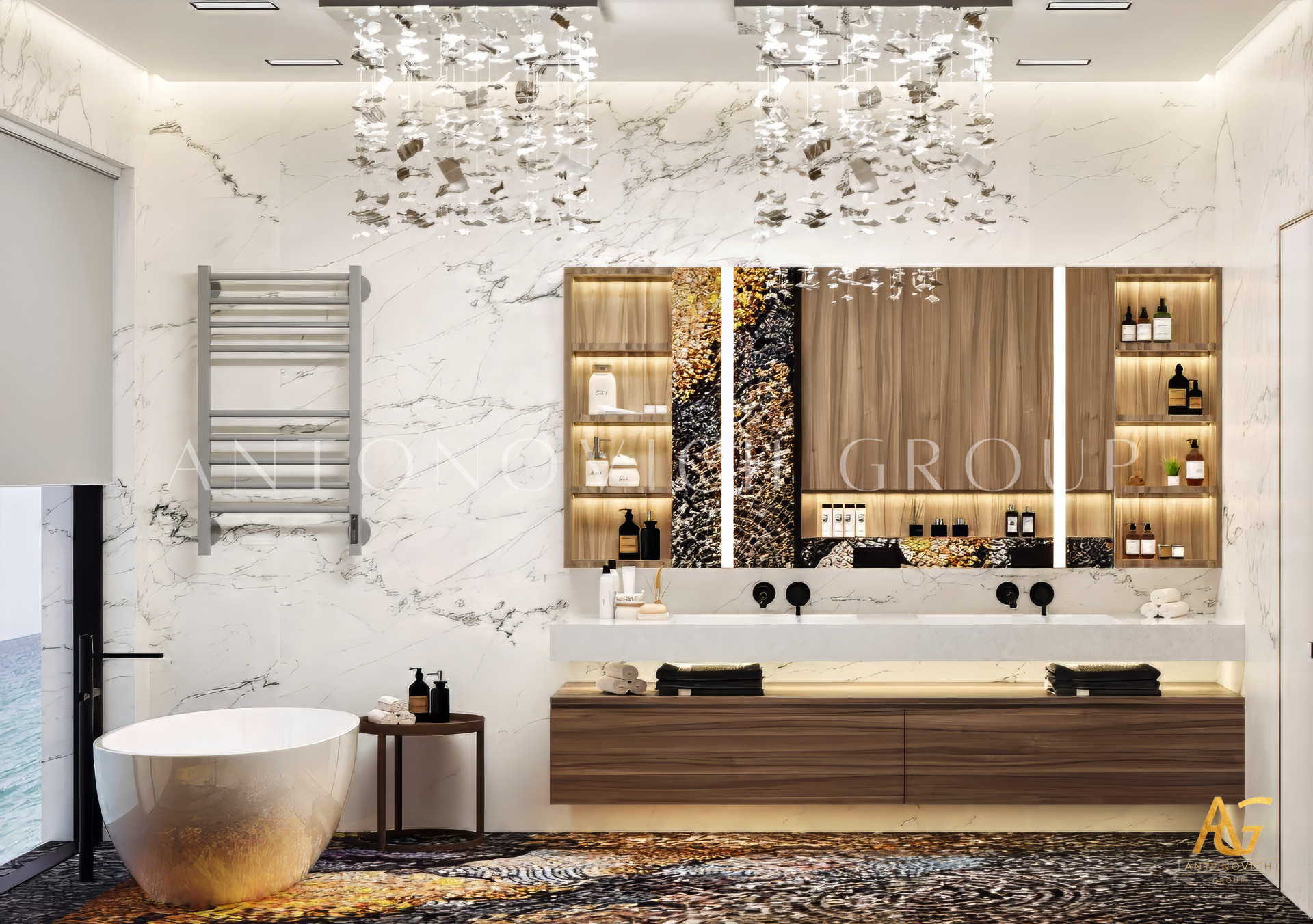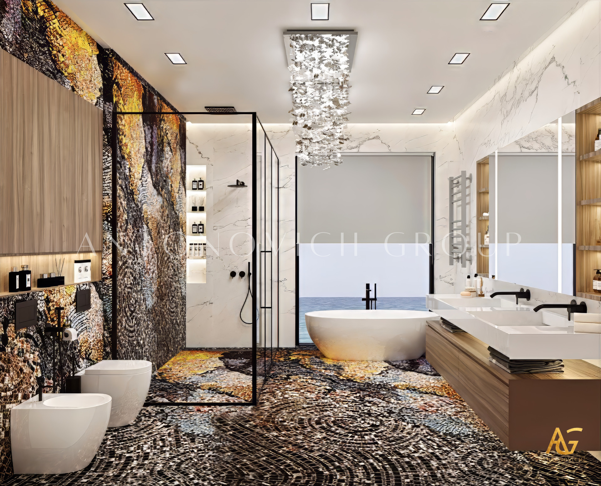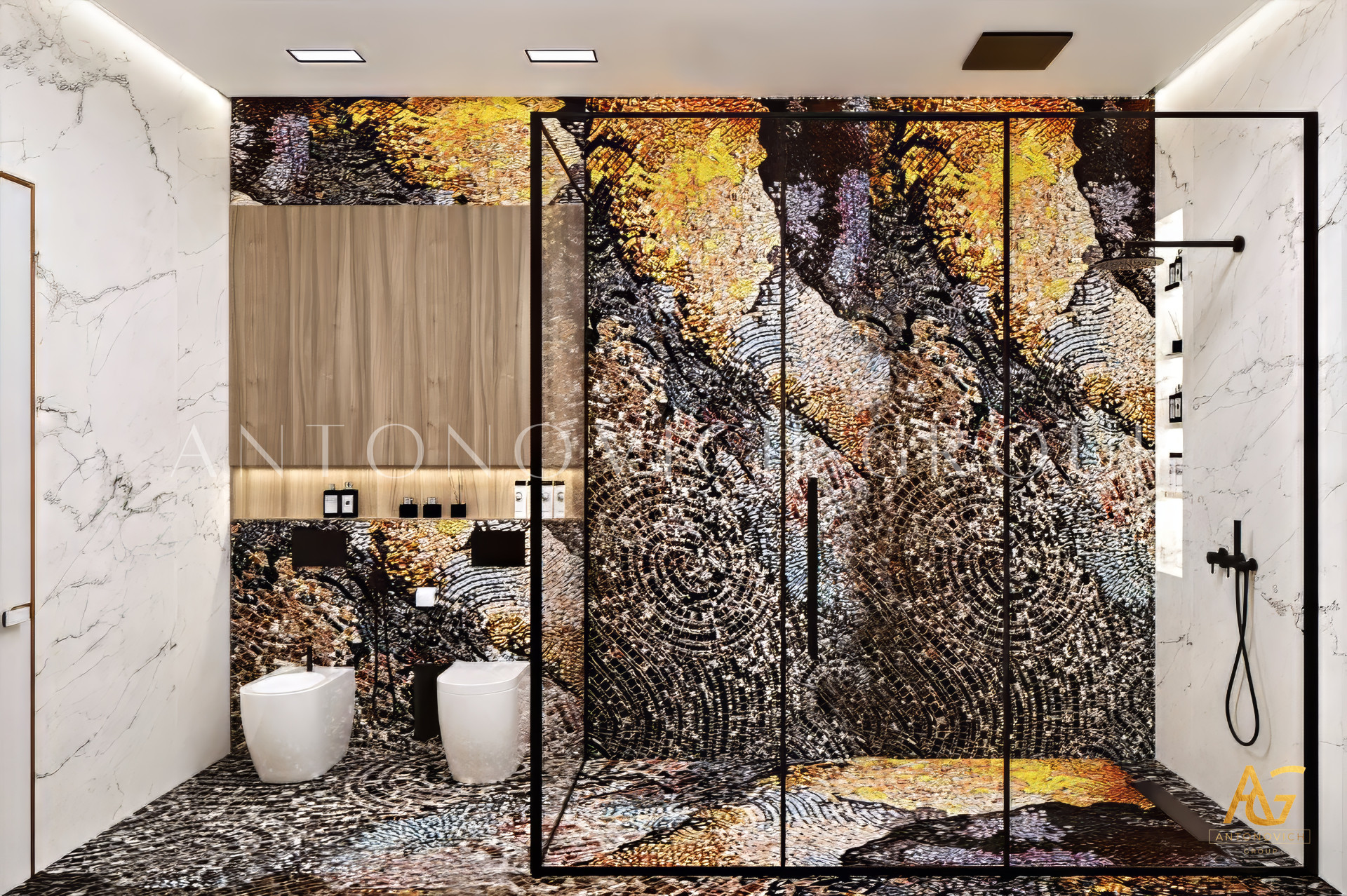 This luxury bathroom interior designs hues are very well-designed. The gold decors are very attractive. The bathtub is equally impressive. It matches the decor in color. A fantastic door completes the luxury bathroom interior design. The colors are vibrant and the designs are intricate. The wall decor is also artistically crafted to provide a luxurious ambiance. The ceiling and floors in the luxury bathroom interior design are likewise gorgeous and historic. Its a one-of-a-kind design! The curves and patterns are superb and they all look uniform with each other without looking very disturbing.