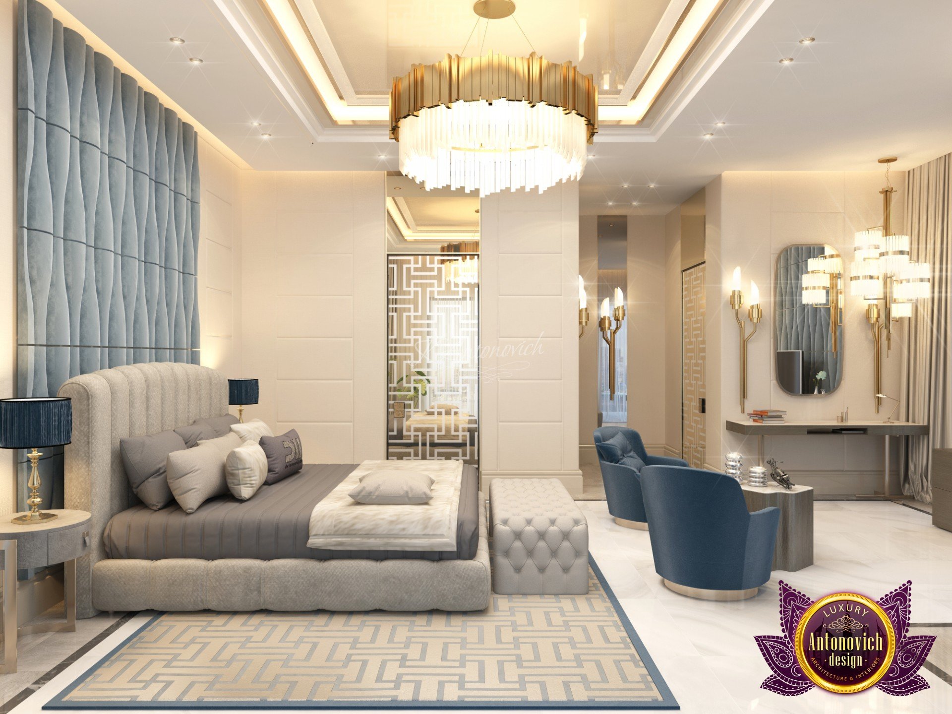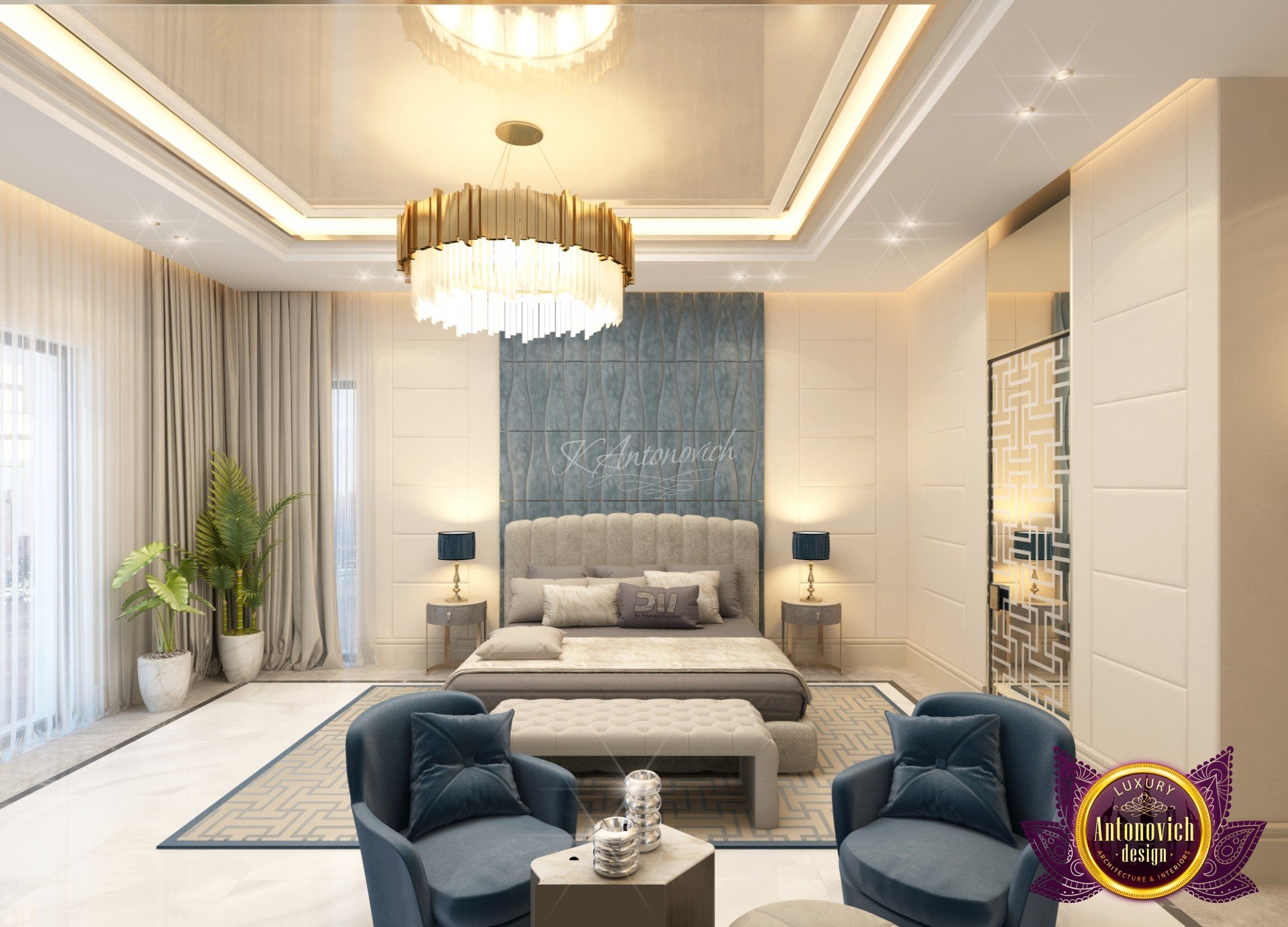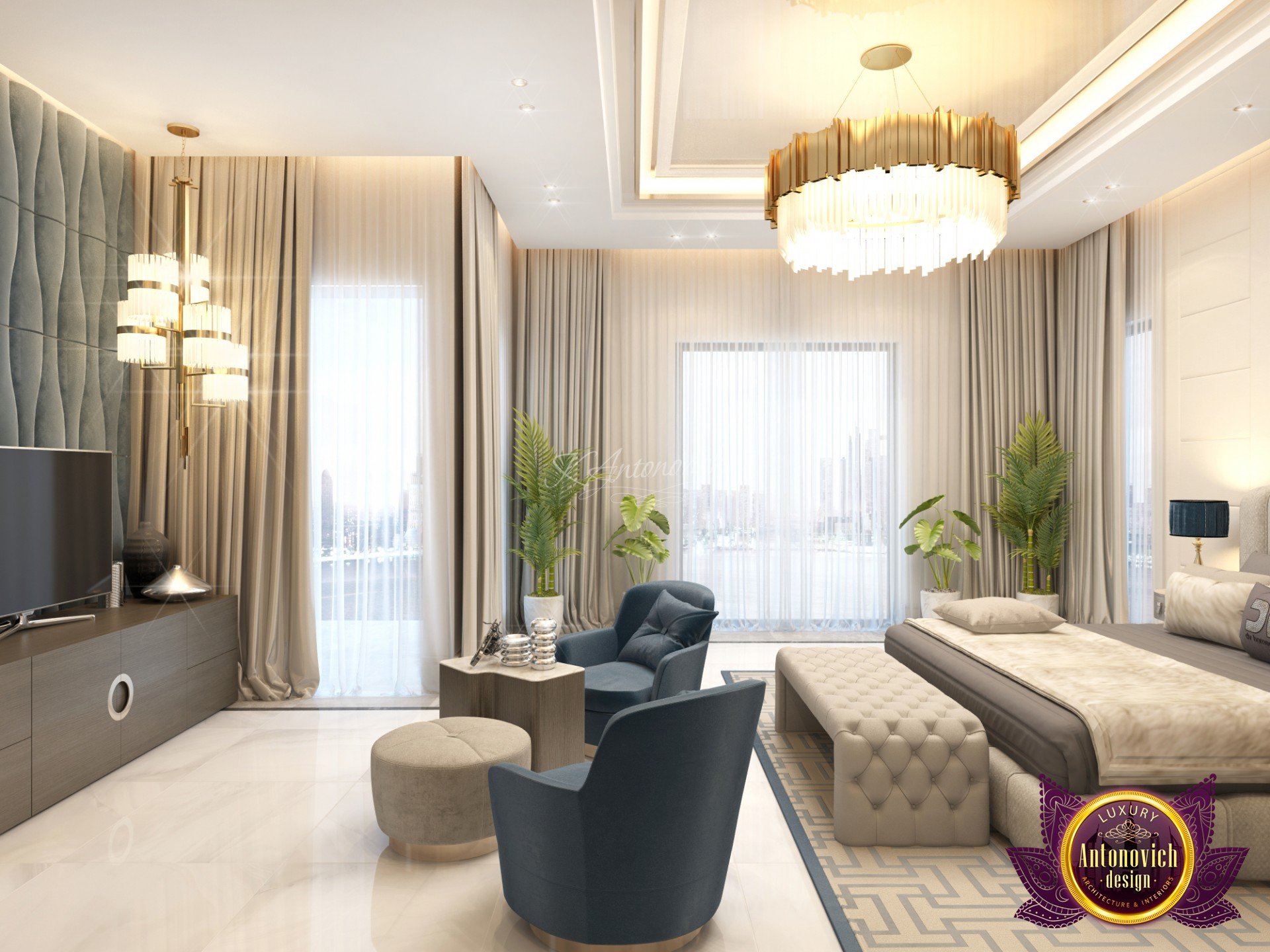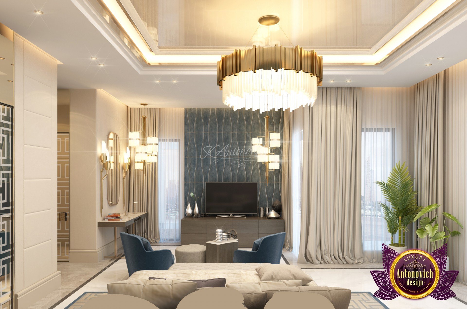 Draping in gold. This is what this luxury bedroom interior design stands for! The luxury color of the room is very much alive with the colors that Luxury Antonovich Design has selected for the glamourous finish of the luxury bedroom interior design. The beautiful chandelier is one of the highlights of this extravagant room. The beautiful finish is such an amazing creation. The cool and interesting shape is very unique.