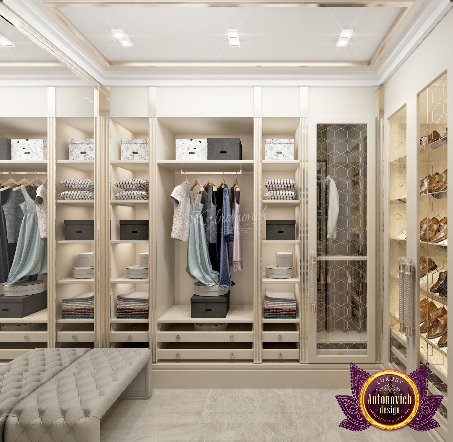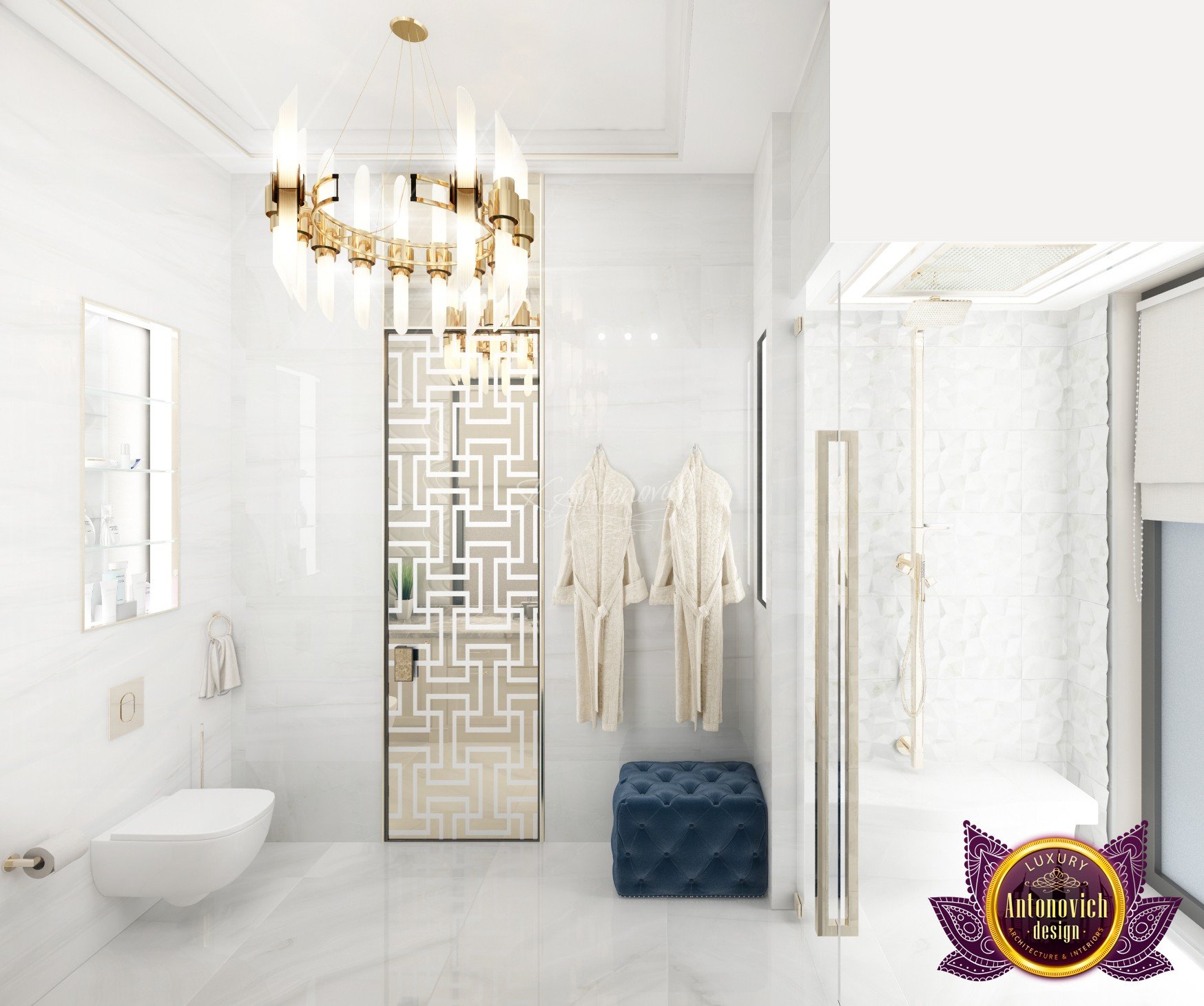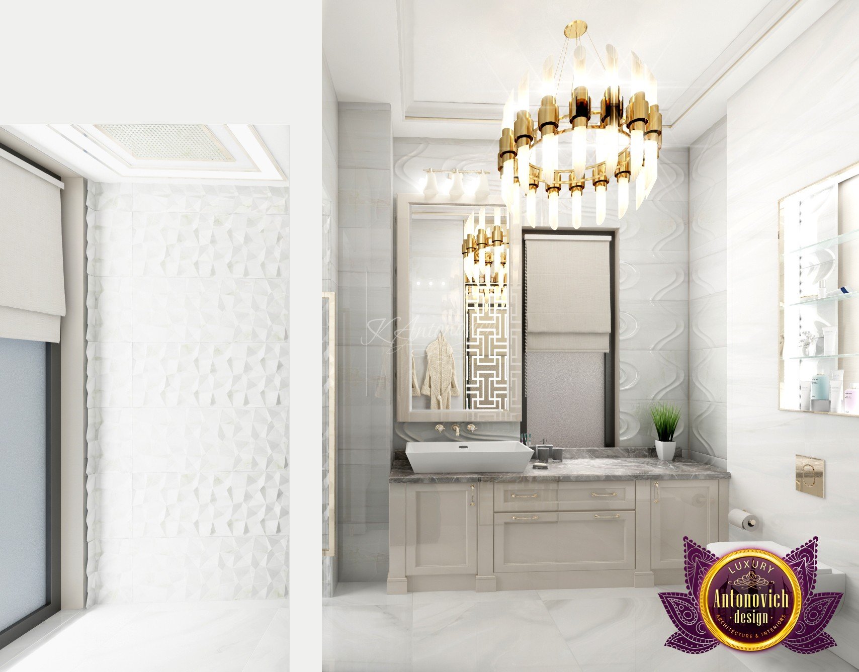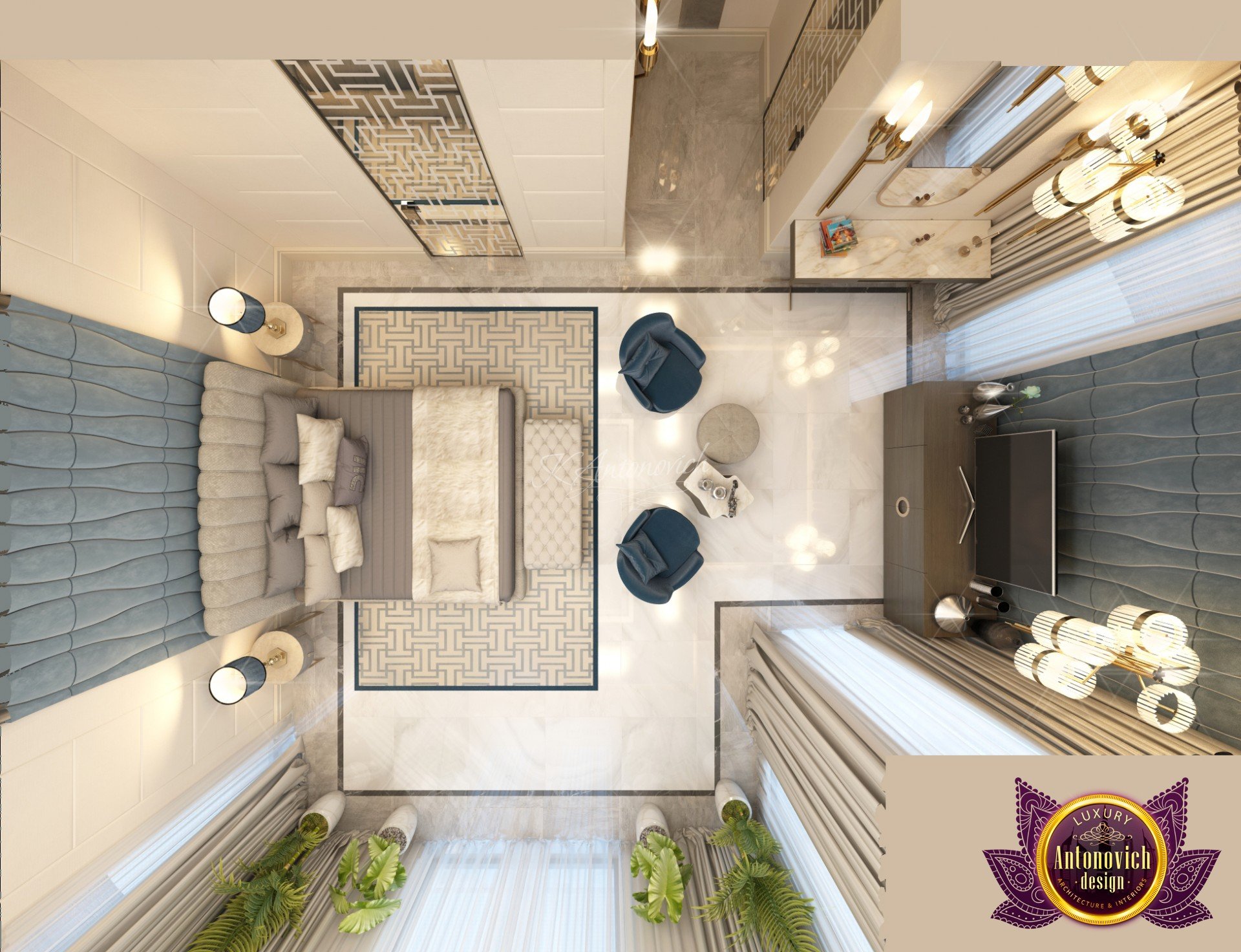 Draping in gold. This is what this luxury bedroom interior design stands for! The luxury color of the room is very much alive with the colors that Luxury Antonovich Design has selected for the glamourous finish of the luxury bedroom interior design. The beautiful chandelier is one of the highlights of this extravagant room. The beautiful finish is such an amazing creation. The cool and interesting shape is very unique.