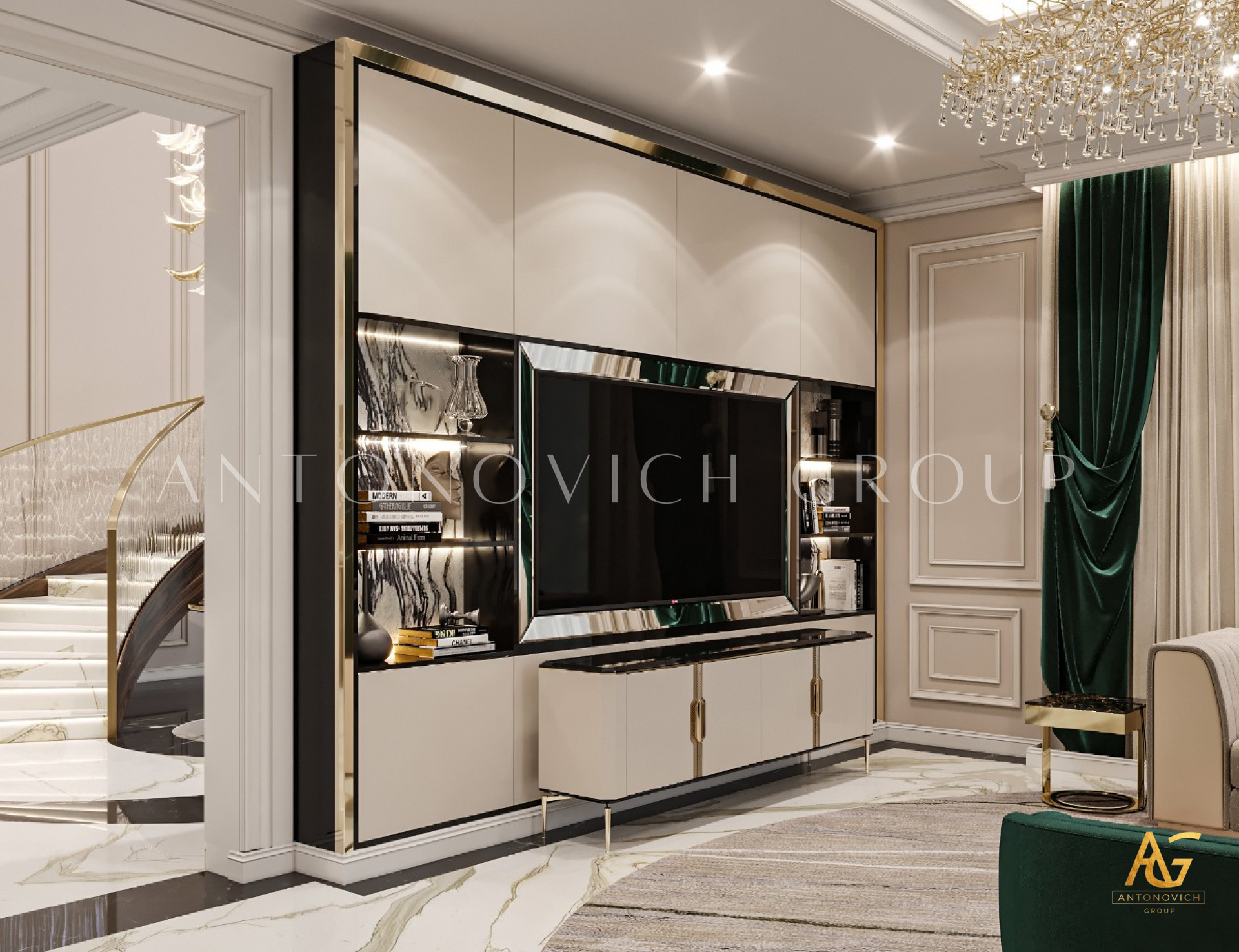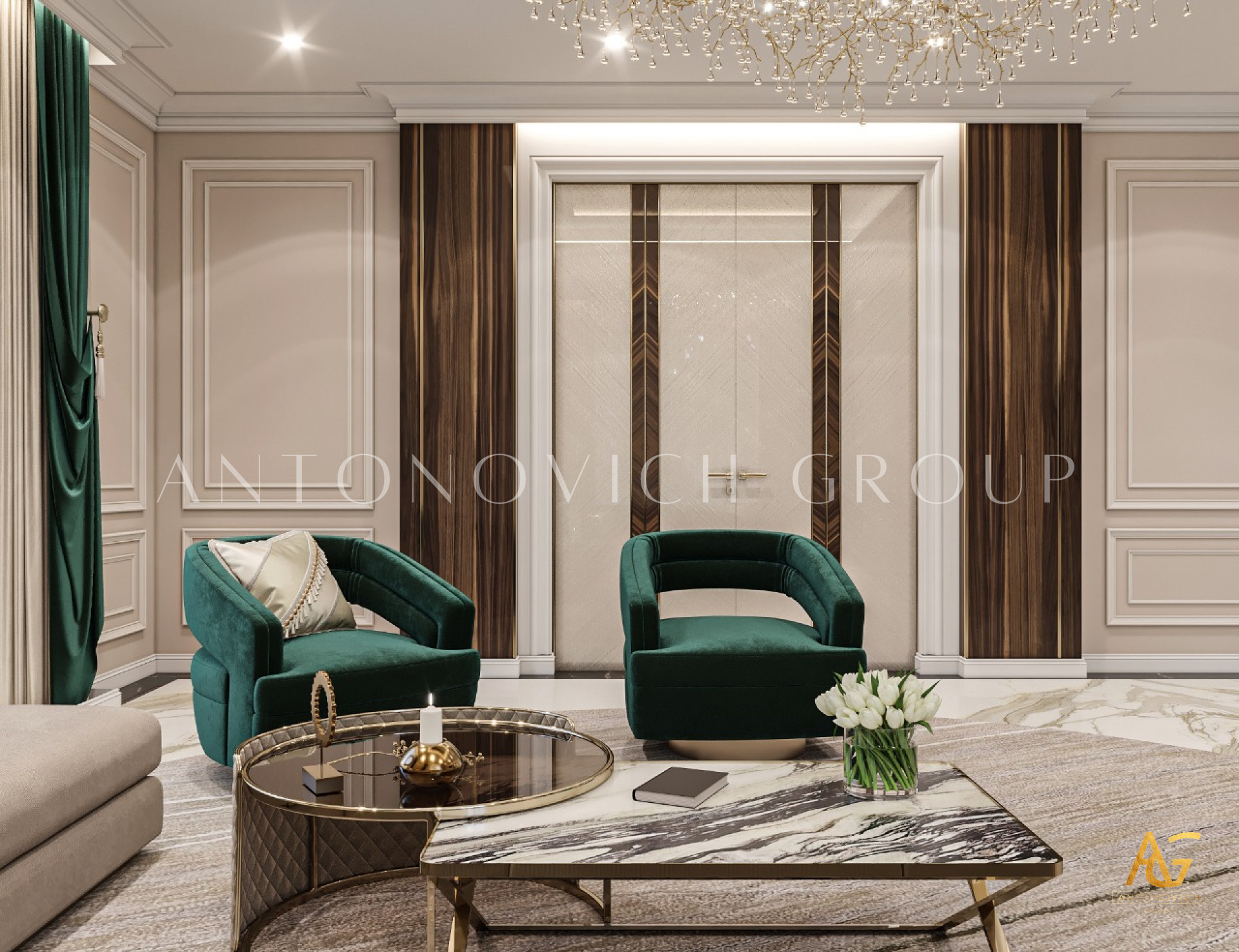To complete the luxuriousness of the interior, Antonovich Group always chooses the best lighting arrangement. Chandeliers are usually custom-made for the spacious and elegant interior design. Touches of gold always complement a very nice combination of emerald green, creams, and whites which has been perfectly well executed in this living room. And to be able to achieve sophistication in style a wonderful furniture and lighting arrangement is perfectly elevated into a customized circular-shaped carpet with the finest texture and premium class materials.
