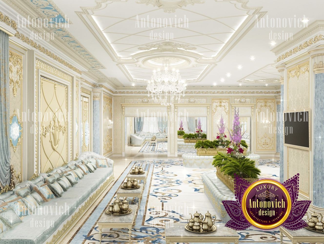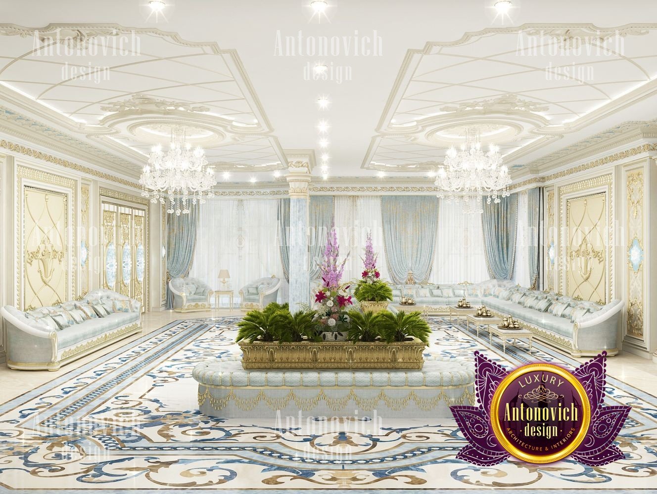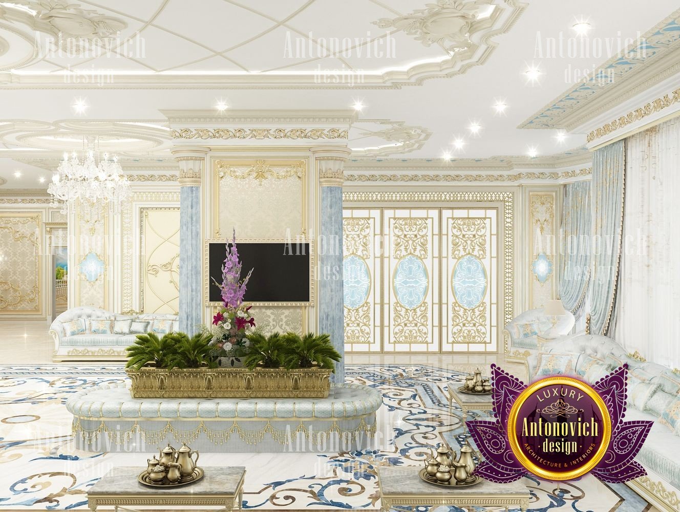 It can be repeated indefinitely that the living room is the most important room in the house. But these are not just words. It is here that all the main events in the house take place. Here welcoming guests. In this room whole family gathers. And the designers task is to create the most comfortable and thus aesthetically beautiful atmosphere. The interior design of this living room was designed for one of the elite apartments in Dubai UAE. The classical style became the basis of the project, and the Luxury Antonovich Design studios designers made it individual and exclusive. The complexity of the problem consisted in the fact that space is relatively small, and the owner of the apartment wanted to get the full set of necessary attributes of an aristocratic house. The authors of the project very successfully selected the color scheme and furniture for the interior of the living room. The biggest part of space is occupied by the dining zone which is located at the window. This is the best way to demonstrate the hospitality and friendliness of the owners of the house. A beautiful table made of natural wood, painted in milky white, is surrounded by soft chairs with a noble bearing. The chairs are upholstered in luxurious textiles with printed damask patterns. And their delicate outlines of the backs give the interior a refined and elegant charm. A large window is covered with translucent tulle of milky shade. They are framed by chic curtains made of silk velvet in lilac tones. Special attention deserves the decor of the walls in the interior of the living room. Here wood paneling is filled with beautiful silk wallpaper. They are complemented by exquisite sconces and art paintings with special illumination. Every detail in the interior makes sense and its philosophical significance. green landscape design, gypsum decor design, gypsum interior decorators uae, hall interior design ideas