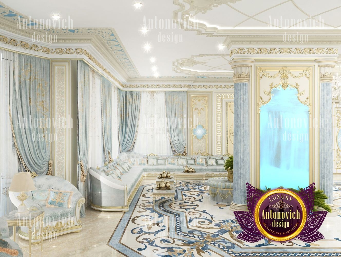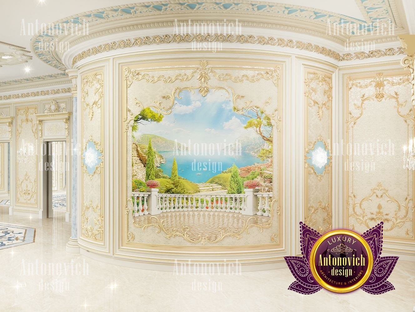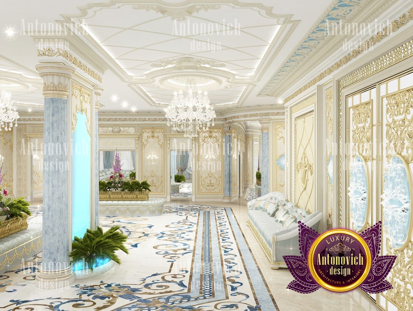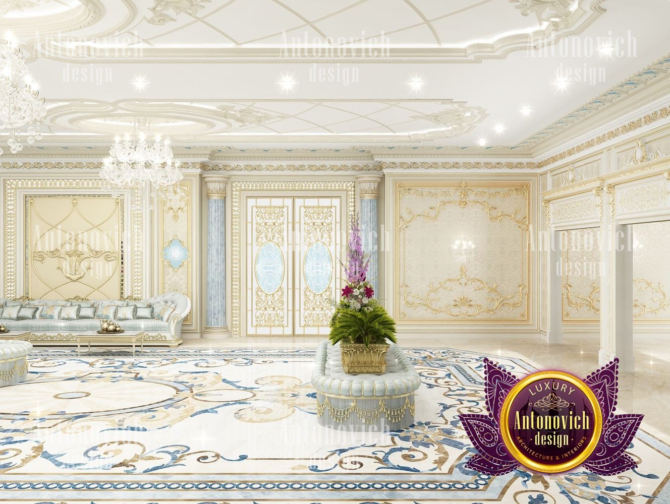 It can be repeated indefinitely that the living room is the most important room in the house. But these are not just words. It is here that all the main events in the house take place. Here welcoming guests. In this room whole family gathers. And the designers task is to create the most comfortable and thus aesthetically beautiful atmosphere. The interior design of this living room was designed for one of the elite apartments in Dubai UAE. The classical style became the basis of the project, and the Luxury Antonovich Design studios designers made it individual and exclusive. The complexity of the problem consisted in the fact that space is relatively small, and the owner of the apartment wanted to get the full set of necessary attributes of an aristocratic house. The authors of the project very successfully selected the color scheme and furniture for the interior of the living room. The biggest part of space is occupied by the dining zone which is located at the window. This is the best way to demonstrate the hospitality and friendliness of the owners of the house. A beautiful table made of natural wood, painted in milky white, is surrounded by soft chairs with a noble bearing. The chairs are upholstered in luxurious textiles with printed damask patterns. And their delicate outlines of the backs give the interior a refined and elegant charm. A large window is covered with translucent tulle of milky shade. They are framed by chic curtains made of silk velvet in lilac tones. Special attention deserves the decor of the walls in the interior of the living room. Here wood paneling is filled with beautiful silk wallpaper. They are complemented by exquisite sconces and art paintings with special illumination. Every detail in the interior makes sense and its philosophical significance. green landscape design, gypsum decor design, gypsum interior decorators uae, hall interior design ideas