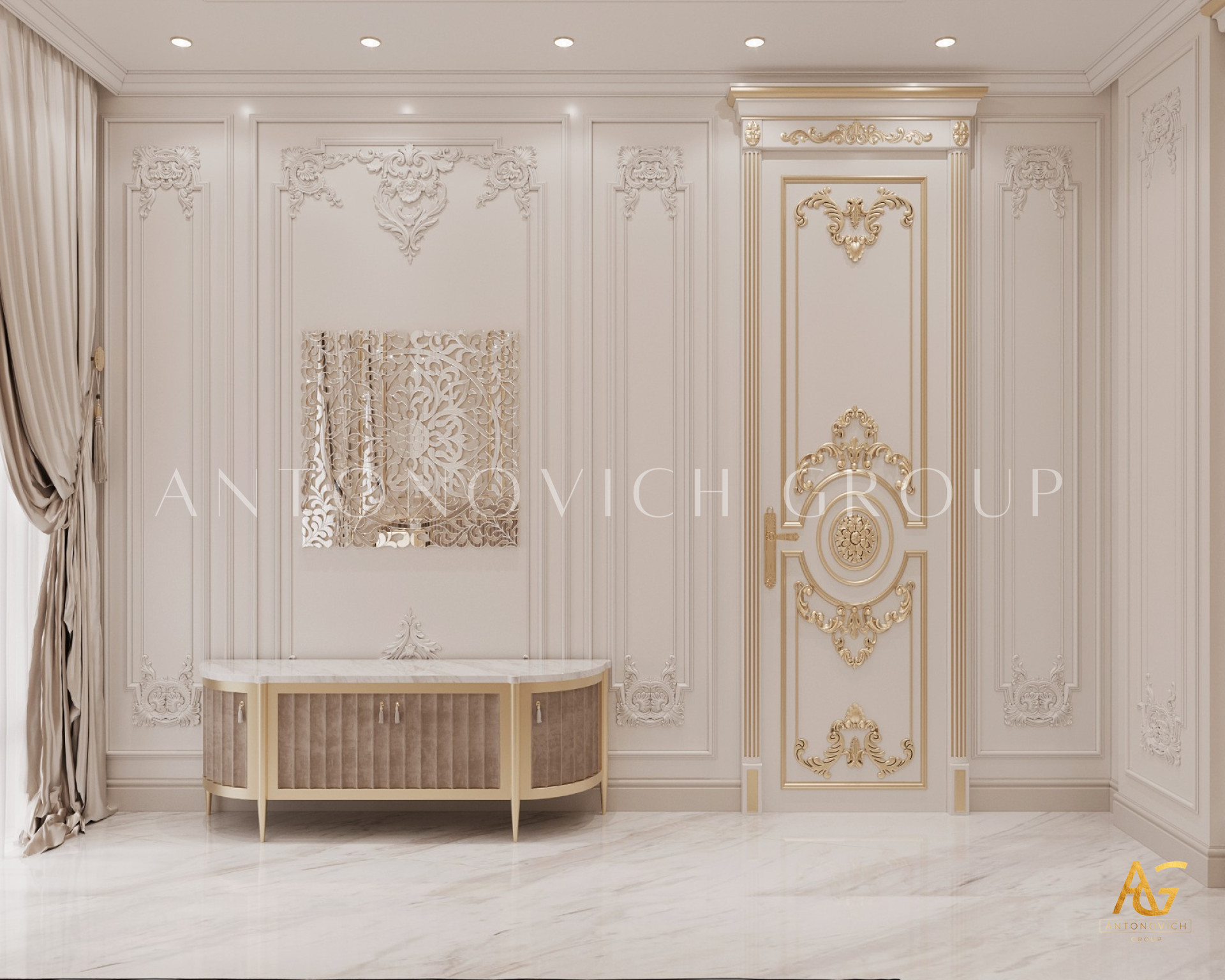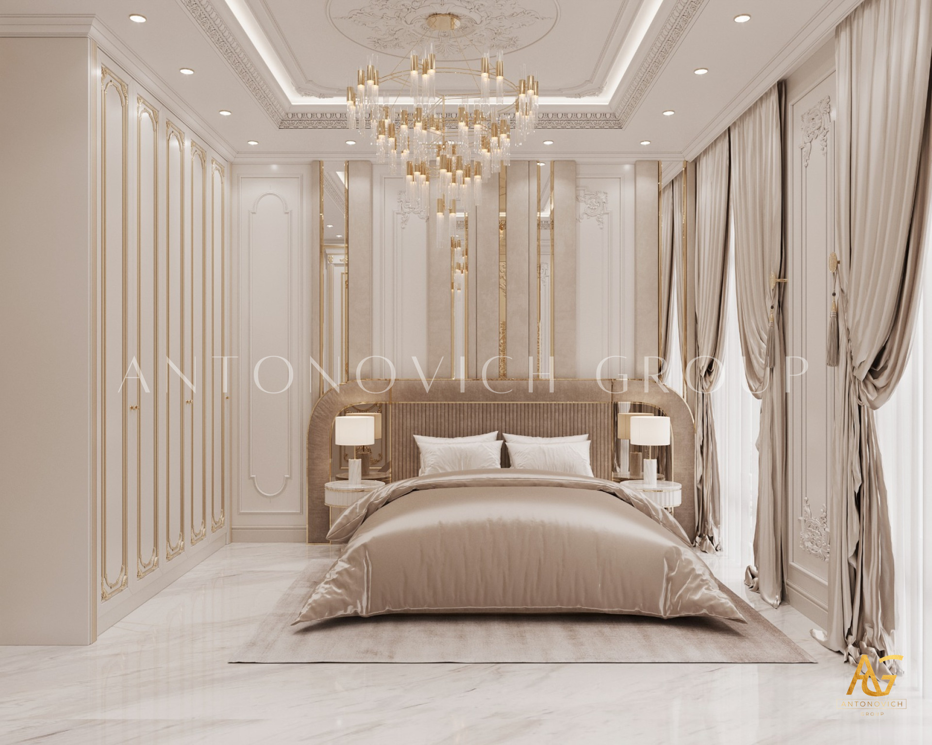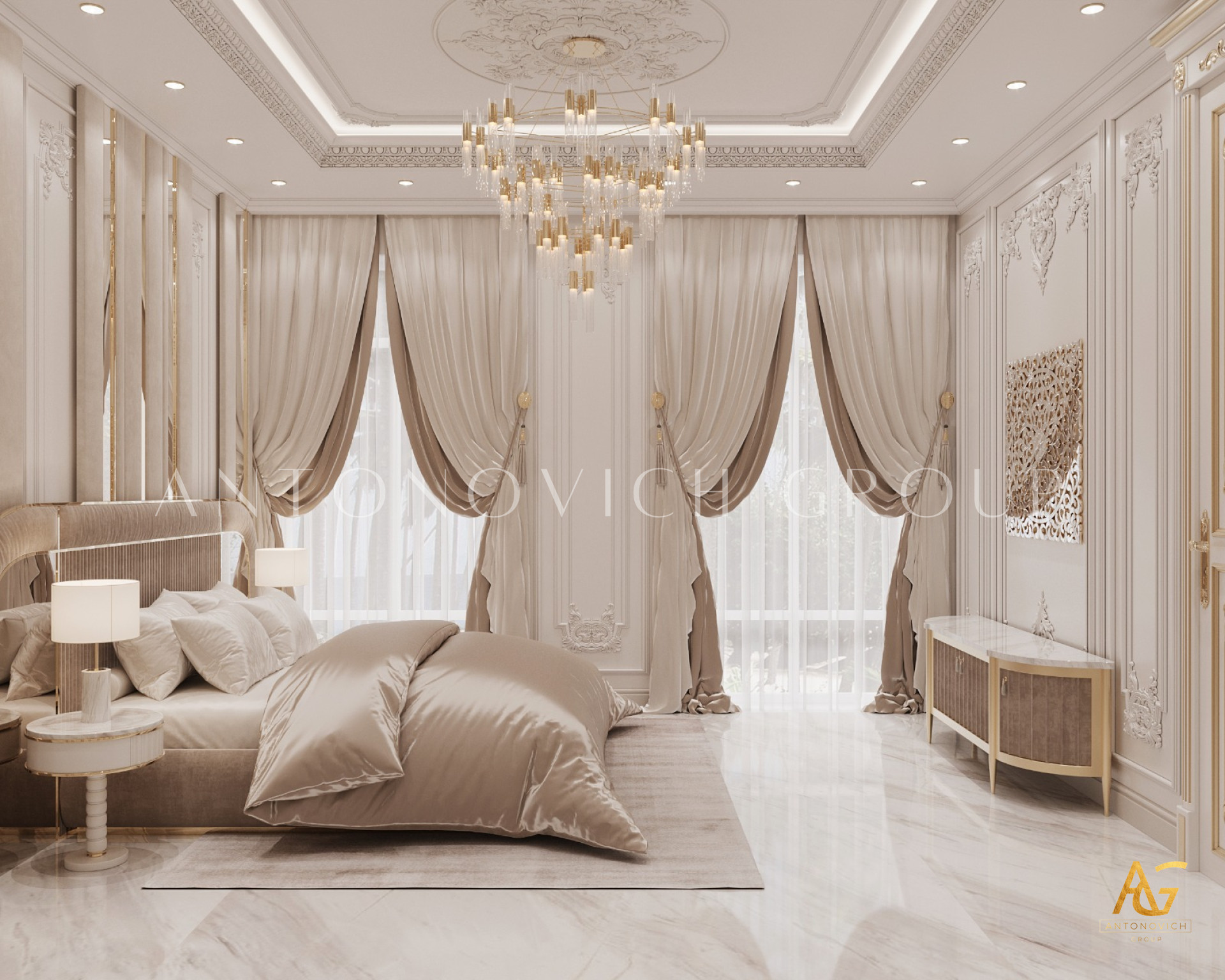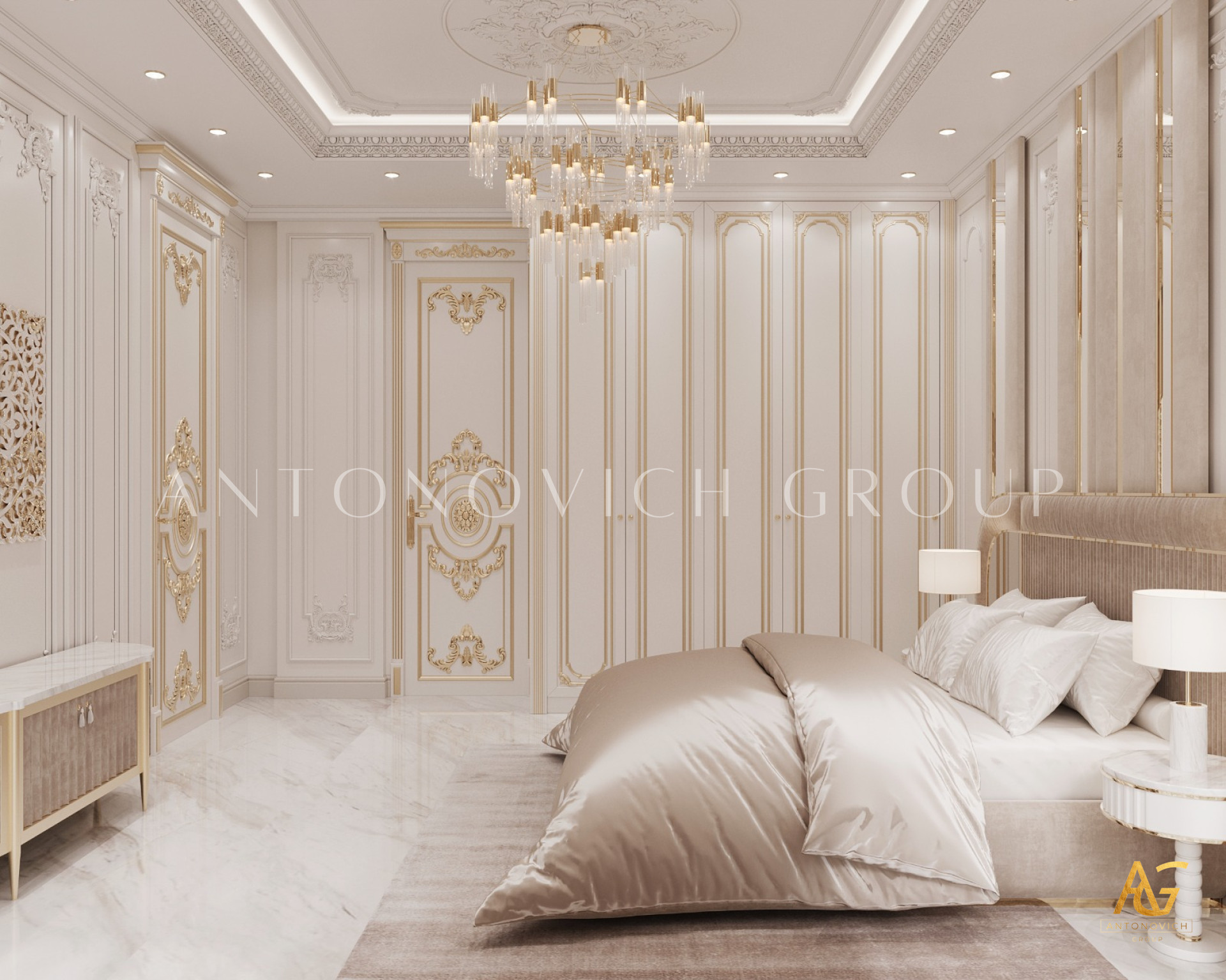 Many people have dreamed of living in a luxurious metropolis, and most people want to live in one. The brilliant interior designers of Luxury Antonovich Design have created a concept where luxury meets modernism in this luxury bedroom interior design in UAE. Dubai is a luxurious place, and having an interior design like this will set you apart from the crowd. With their lovely elegant detailing, the exquisite cabinets and television rack are truly beautiful. The chandelier is whimsical, giving it an abstract appearance.