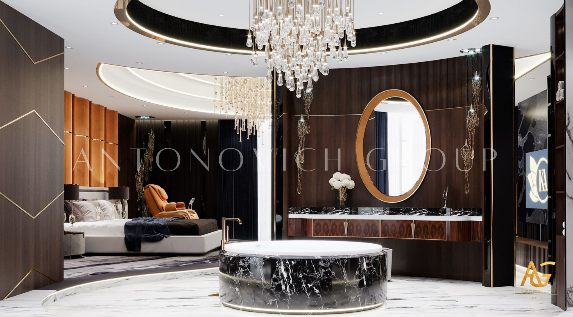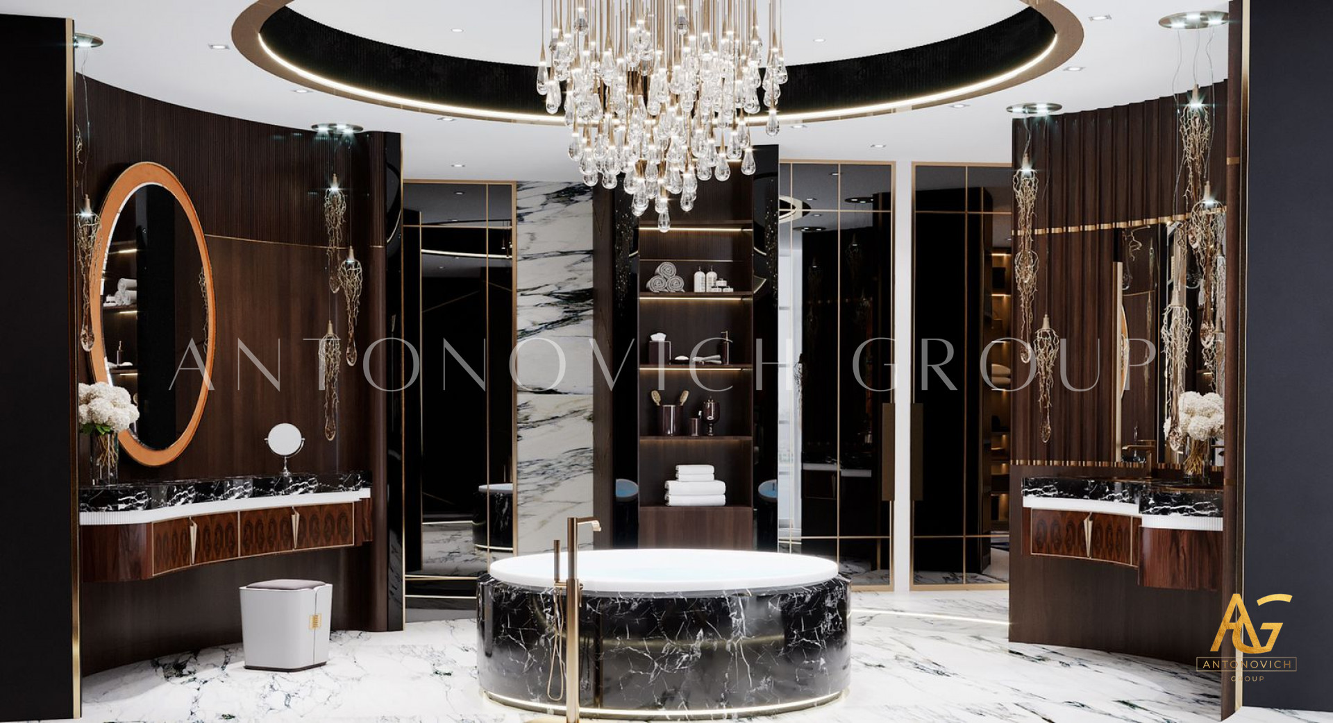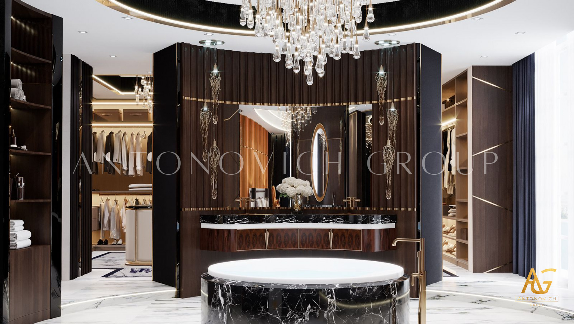 Master bathrooms are an extension of the master bedroom, which is frequently connected with a walk-in closet. Antonovich Group has introduced the highest level of interior design execution for luxury bathrooms. That even in the master bathroom, advanced technology can be installed and controlled by a smart home system. Another exciting decoration included in the Antonovich Group for the master bathroom is the electric fireplace, which has become the focal point of the entire space.