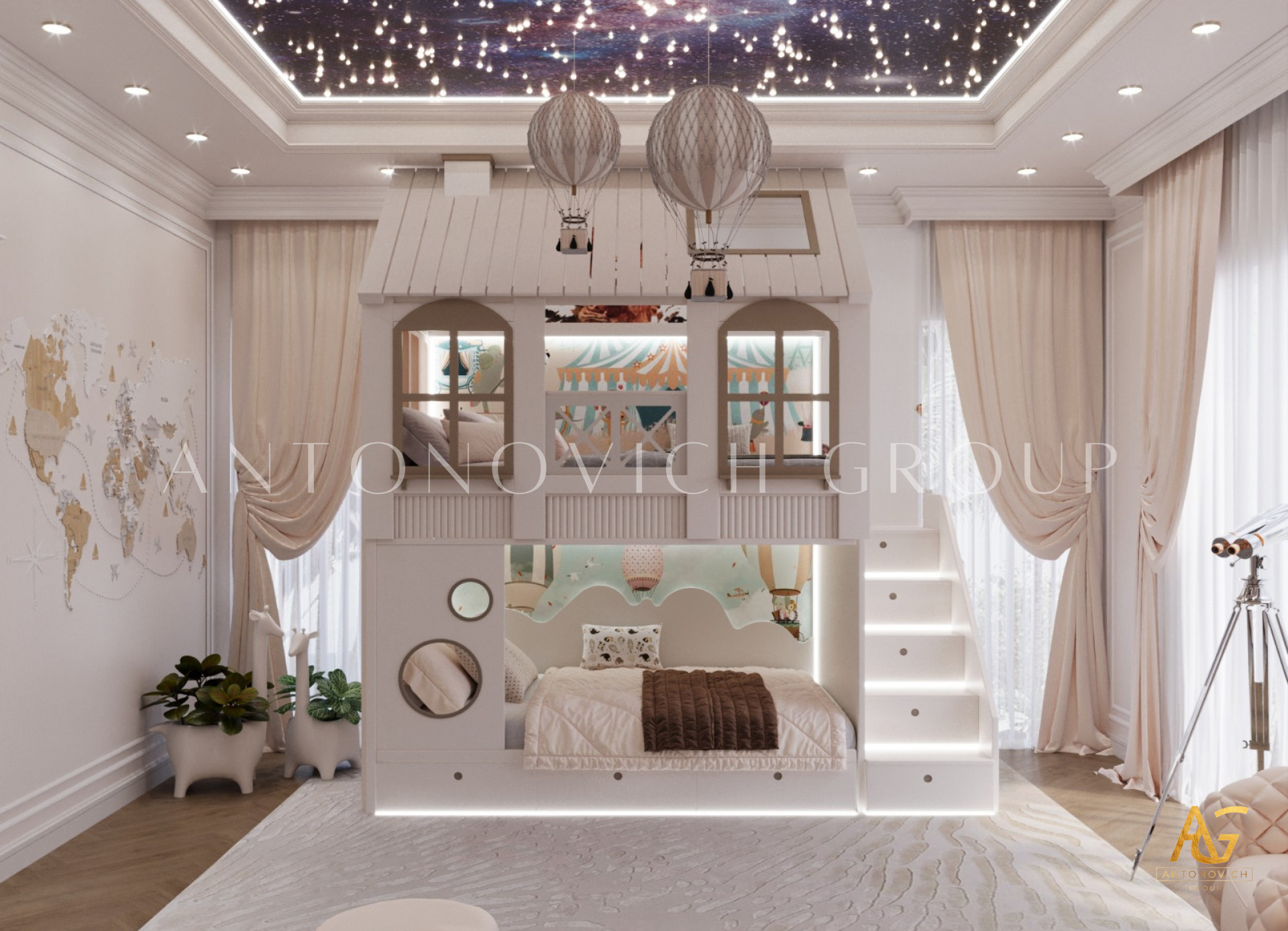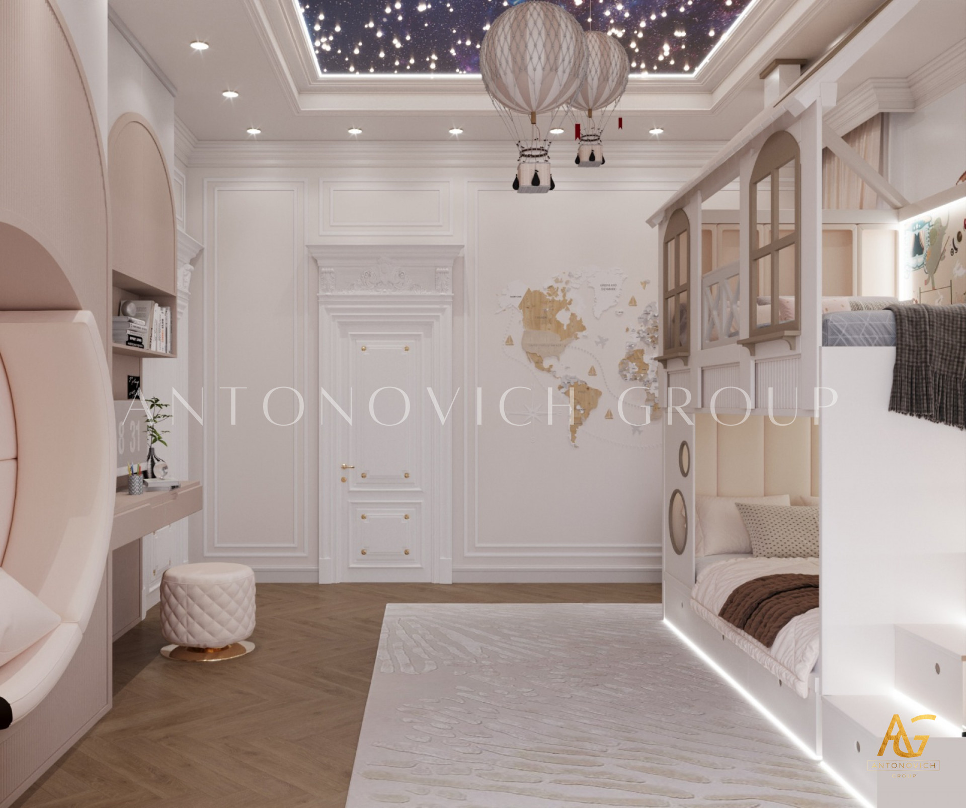 As one of the biggest construction companies in Dubai, Antonovich Group continues to push the boundaries of interior design with their latest project - a breathtaking modern kids bedroom that combines functionality, creativity, and luxury.