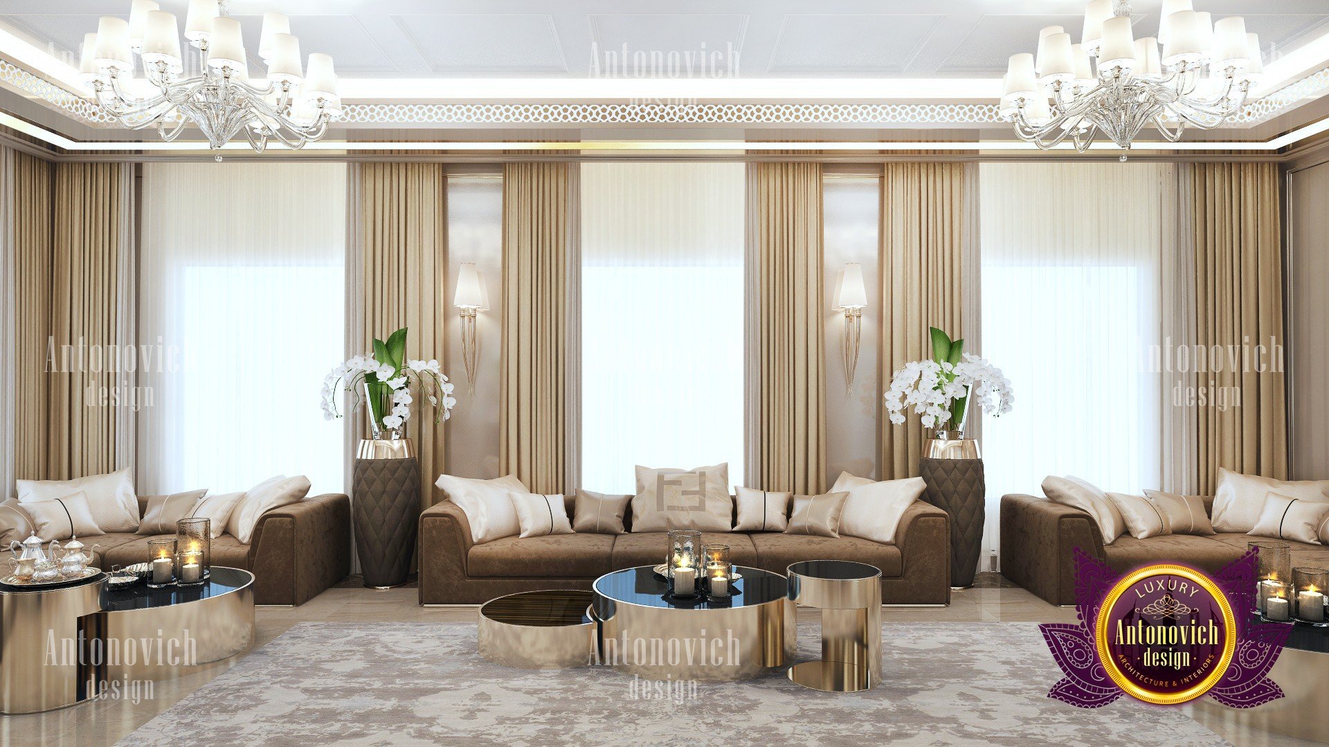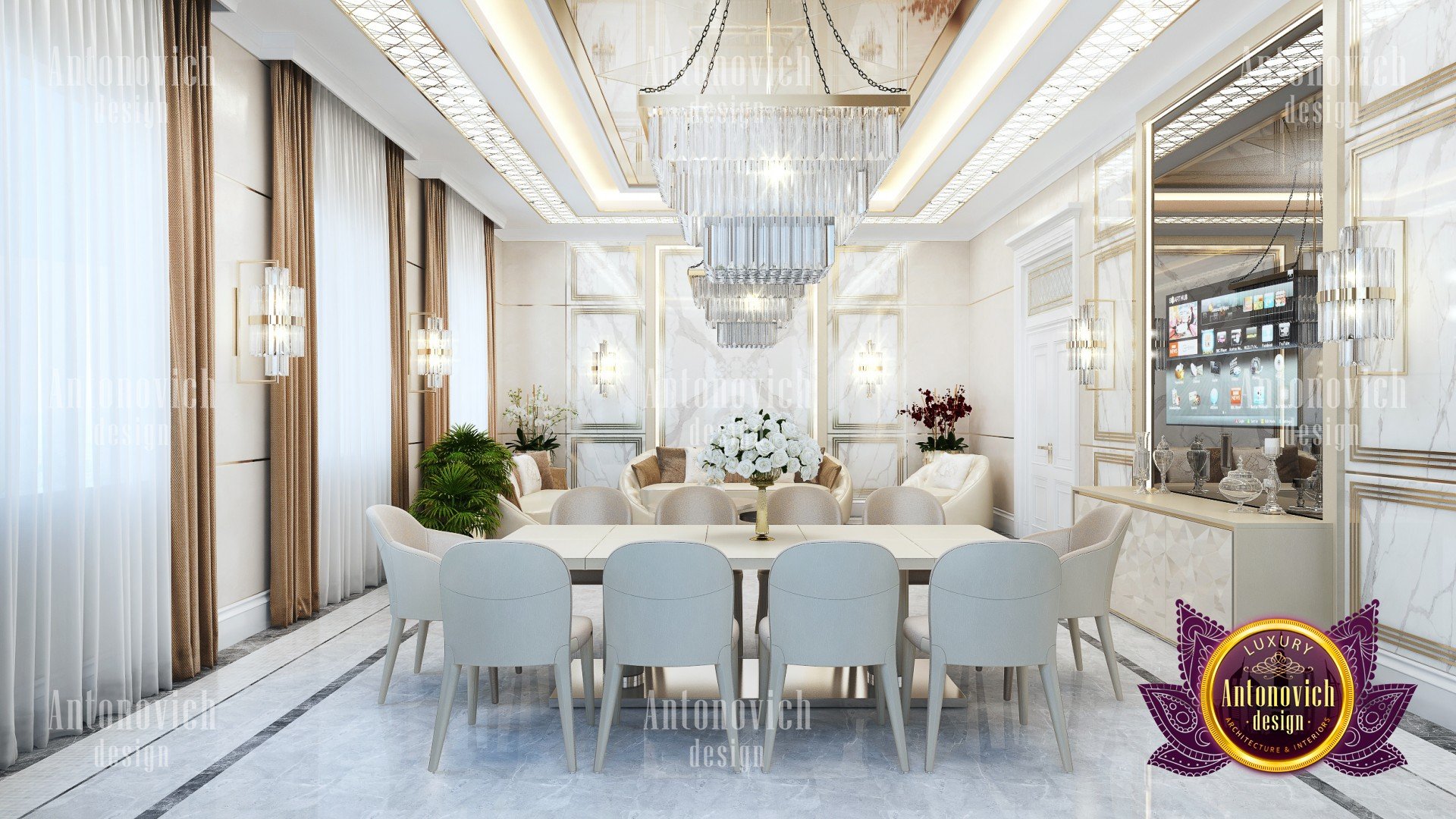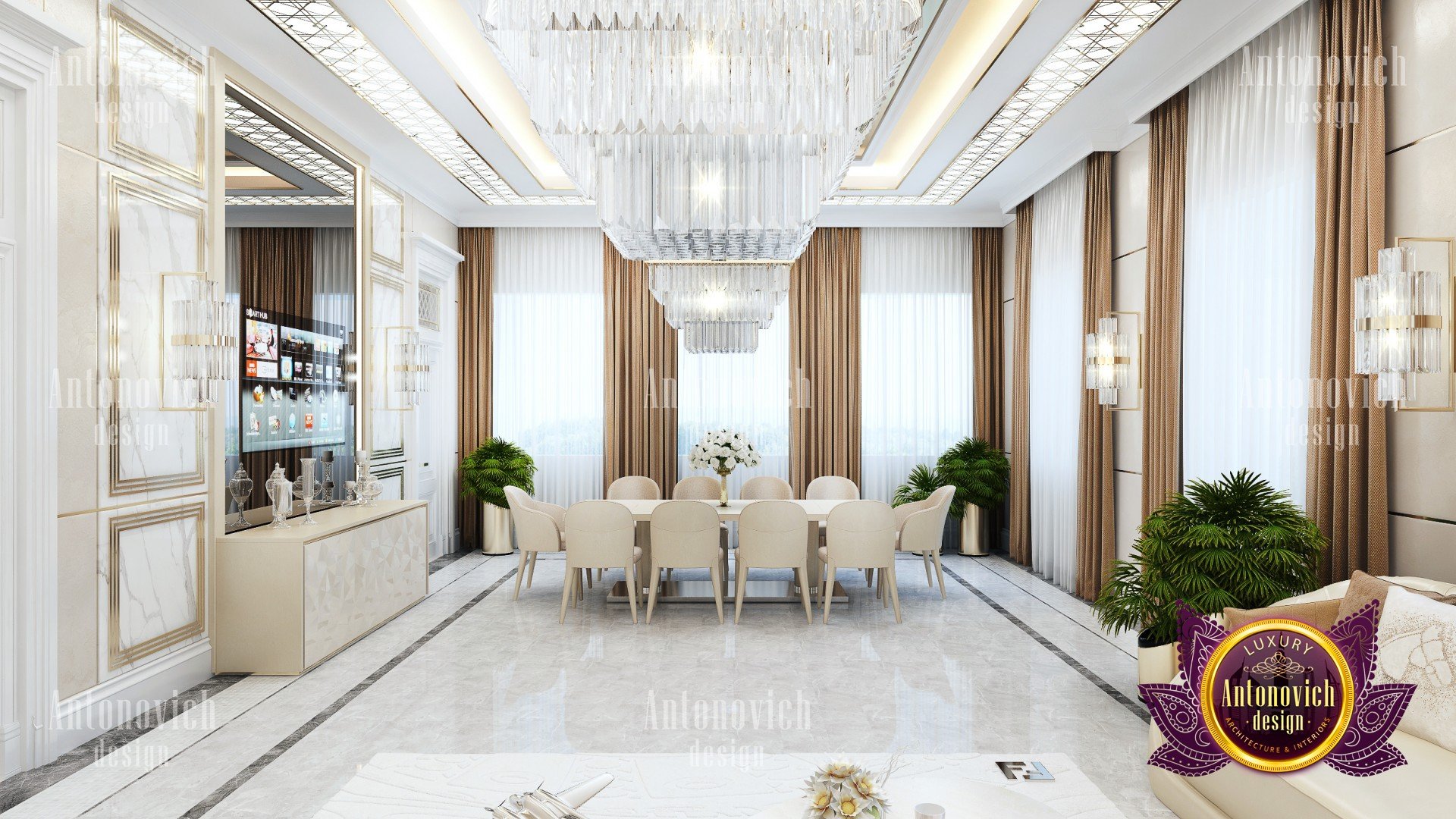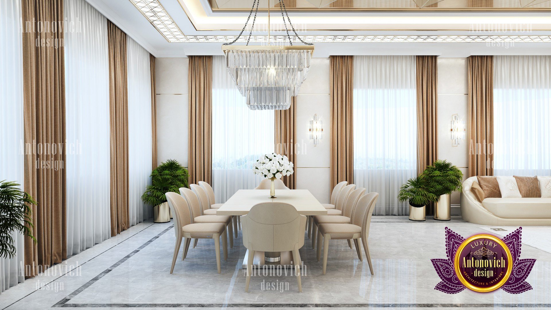 The kitchen design is deluxe and clean, highlighting the luxurious interior of the living room. Interior Designers Dubai aimed to create original geometry space. To do this, they used creative solutions in the decoration of floors and ceilings. Carved patterns on the marble floor define the boundaries of each zone. Panoramic windows are draped with silk curtains in a modern style. Direct folds of curtain frames show a beautiful landscape this passes a sufficient amount of daylight.