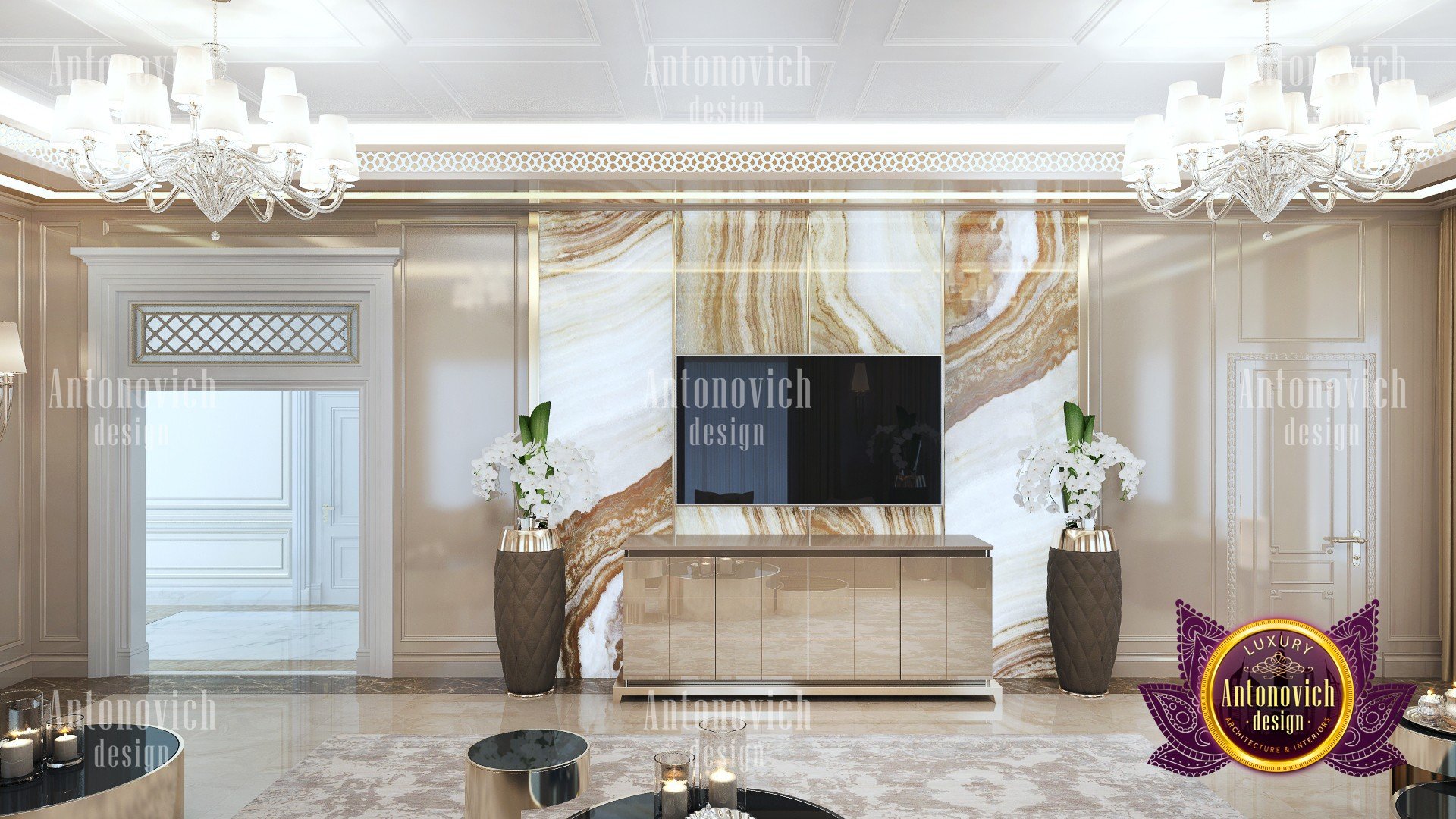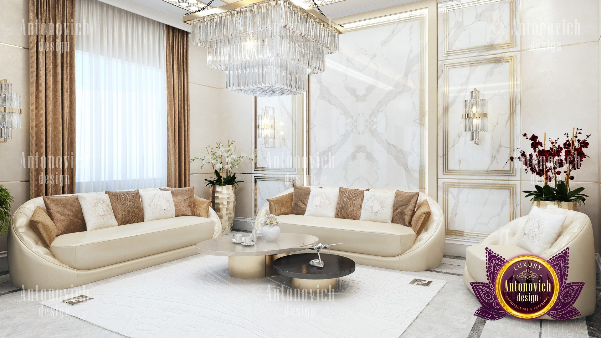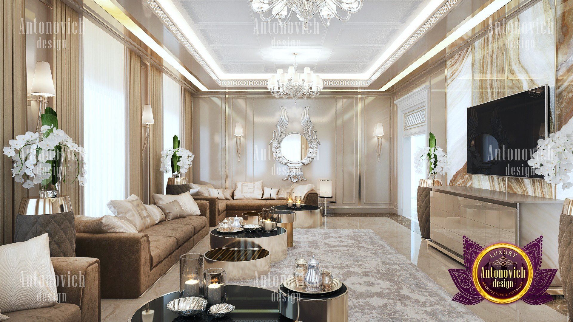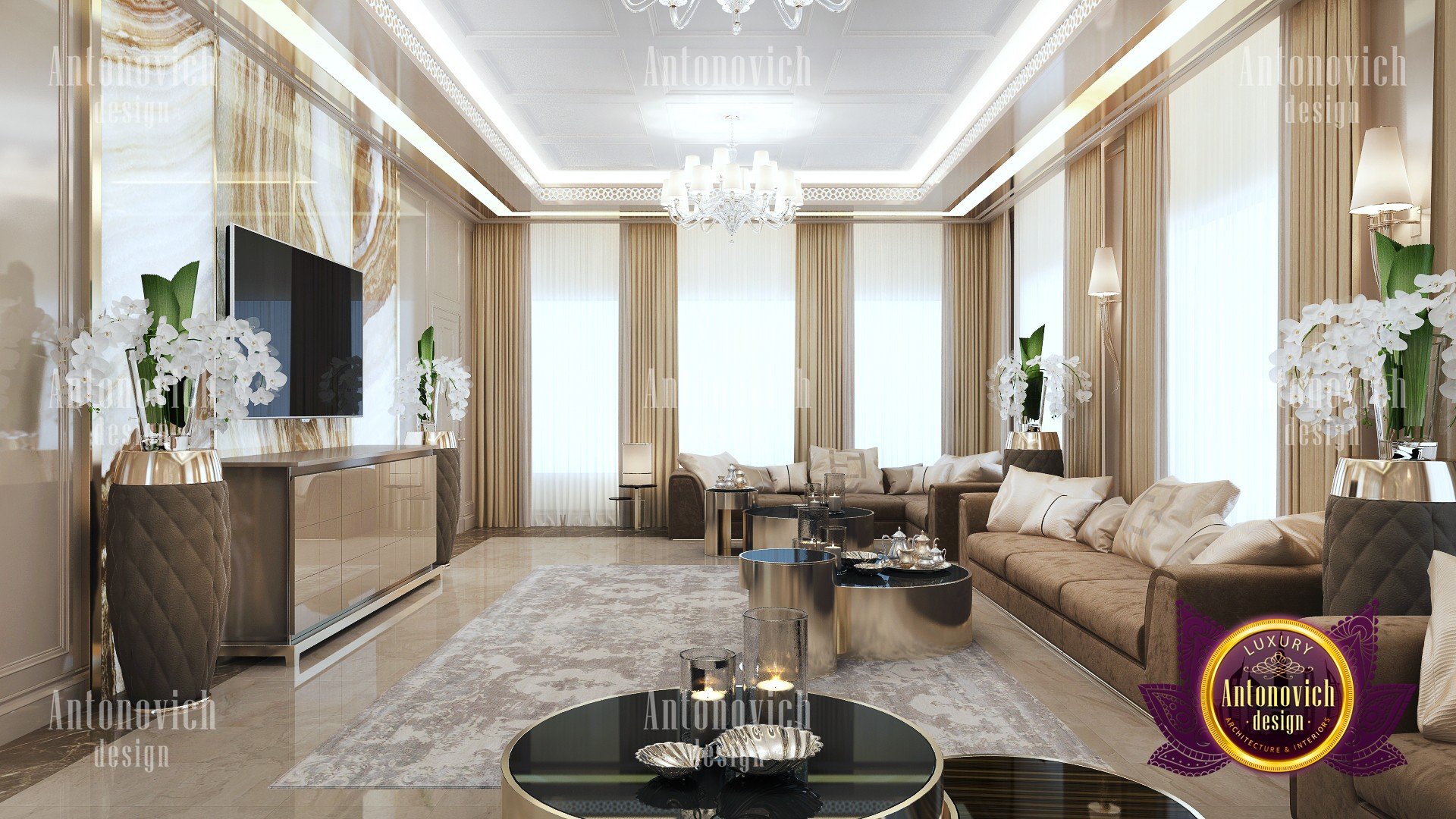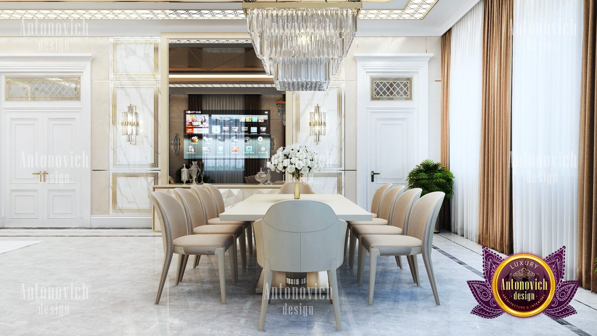 The kitchen design is deluxe and clean, highlighting the luxurious interior of the living room. Interior Designers Dubai aimed to create original geometry space. To do this, they used creative solutions in the decoration of floors and ceilings. Carved patterns on the marble floor define the boundaries of each zone. Panoramic windows are draped with silk curtains in a modern style. Direct folds of curtain frames show a beautiful landscape this passes a sufficient amount of daylight.