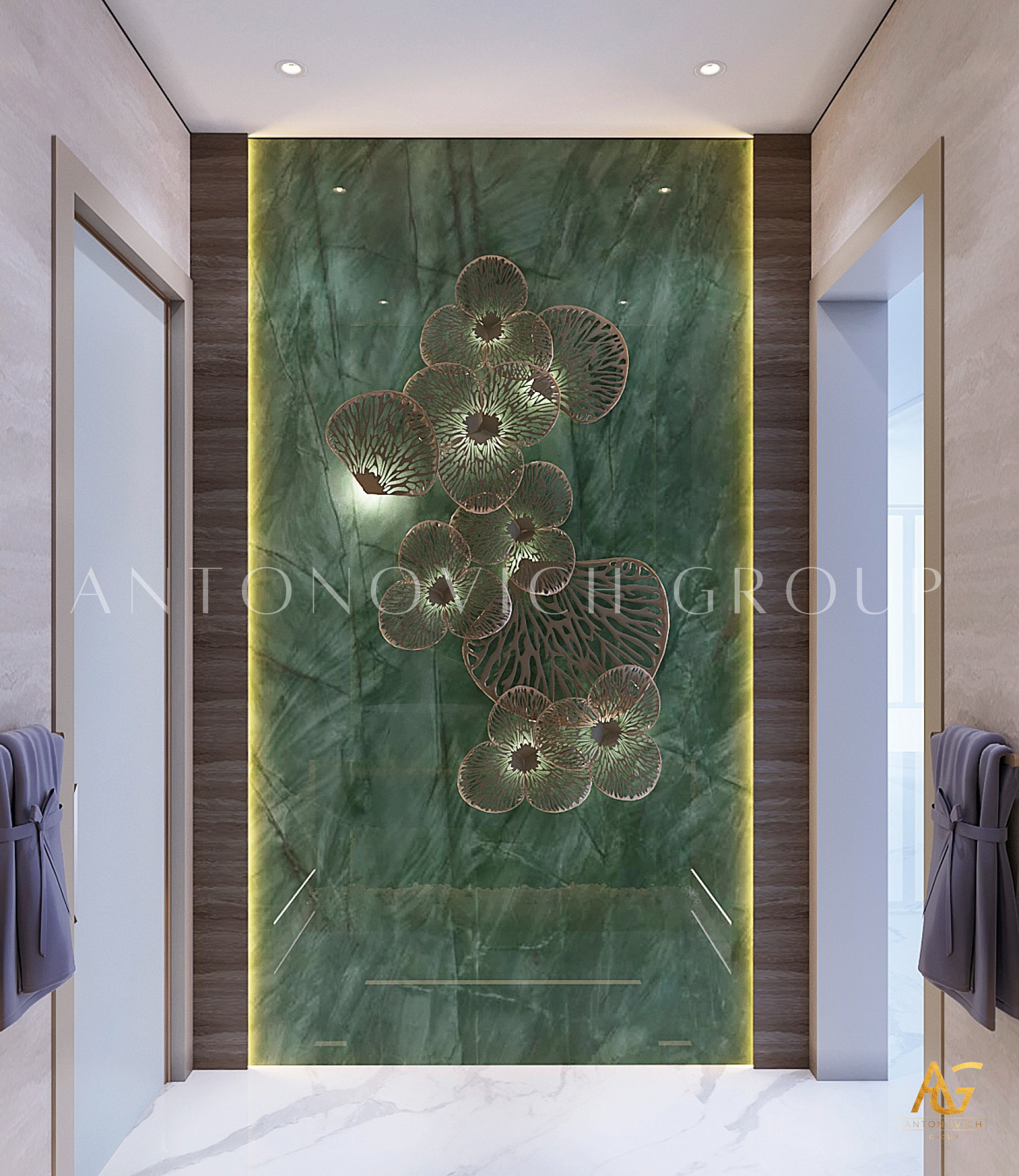 ففي مشروع التصميم هذا ، لا يوجد مكان للتفاهات ، فكل سنتيمتر مربع مليء بالديكورات الفاخرة. باب المدخل مغطى بالمنحوتات المذهلة مع اعدادات الإضاءة الإضافية تجعل تصميم الحمام الداخلي أكثر إشراقًا ورائعة.