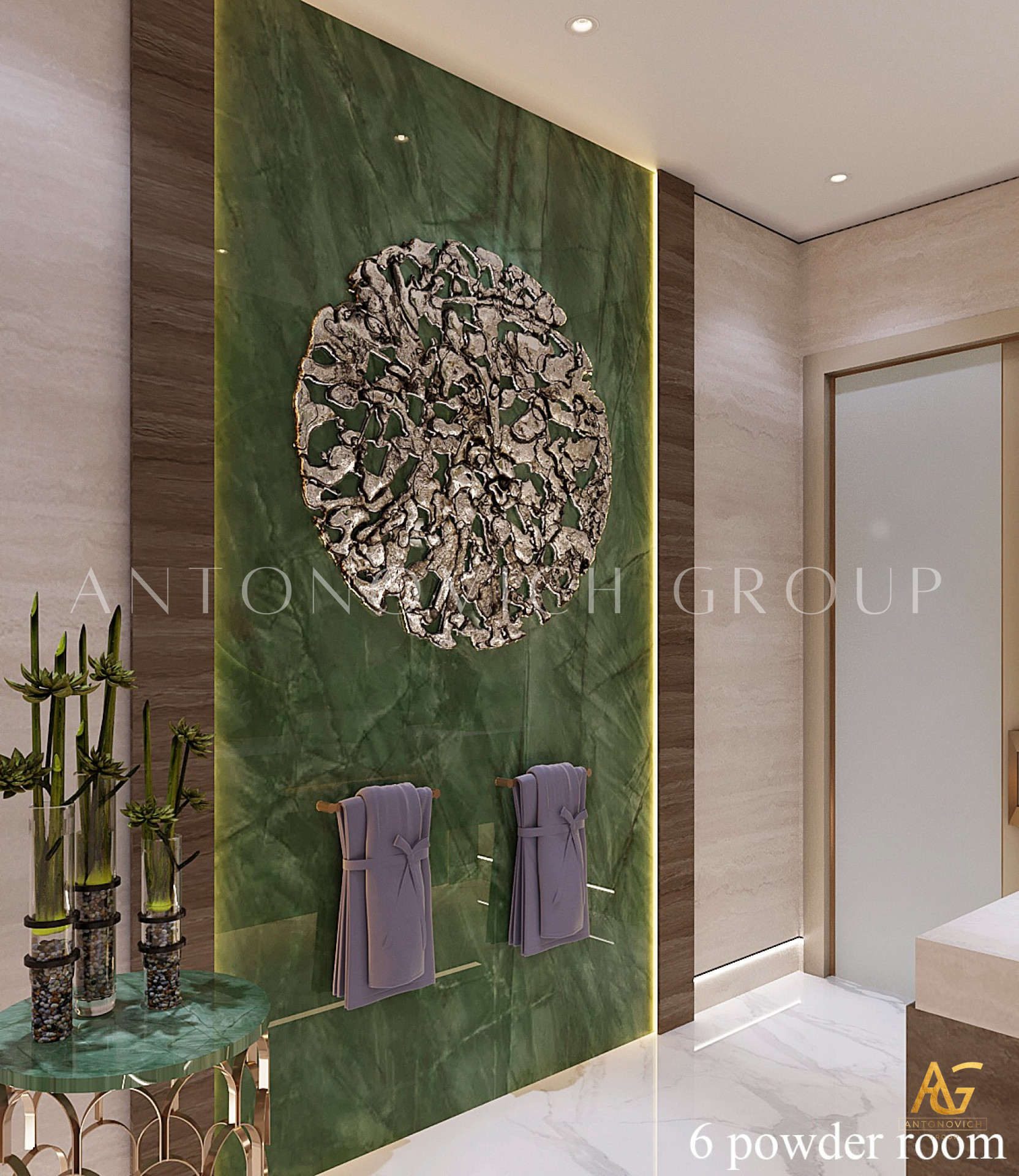 ان التصميم الداخلي الفاخر لمنزل النخبة يعكس مدي ذوق وثراء اصحابه . ويظهر هذا من خلال التصميم الداخلي من مصممي الديكور في لاكشري أنتونوفيتش ديزاين في كل غرفة من غرف المنزل بما في ذلك الحمام الكبير ذو النافذه المذهلة . فان كل عنصر من عناصر الديكور في الحمام يبدو مترابطا ليكمل الصورة الفنية . فيوجد بانيو كبير بجوار النافذة مزين بستائر جميلة من الحرير بدرجات ألوان ذهبية. وعلي الجانب الاخر نجد كابينة دش مصنوعة من الزجاج المصنفر بخطوط ذهبية التي تبدو مذهلة مع زخرفة الجدران المزينة بفن الفسيفساء .