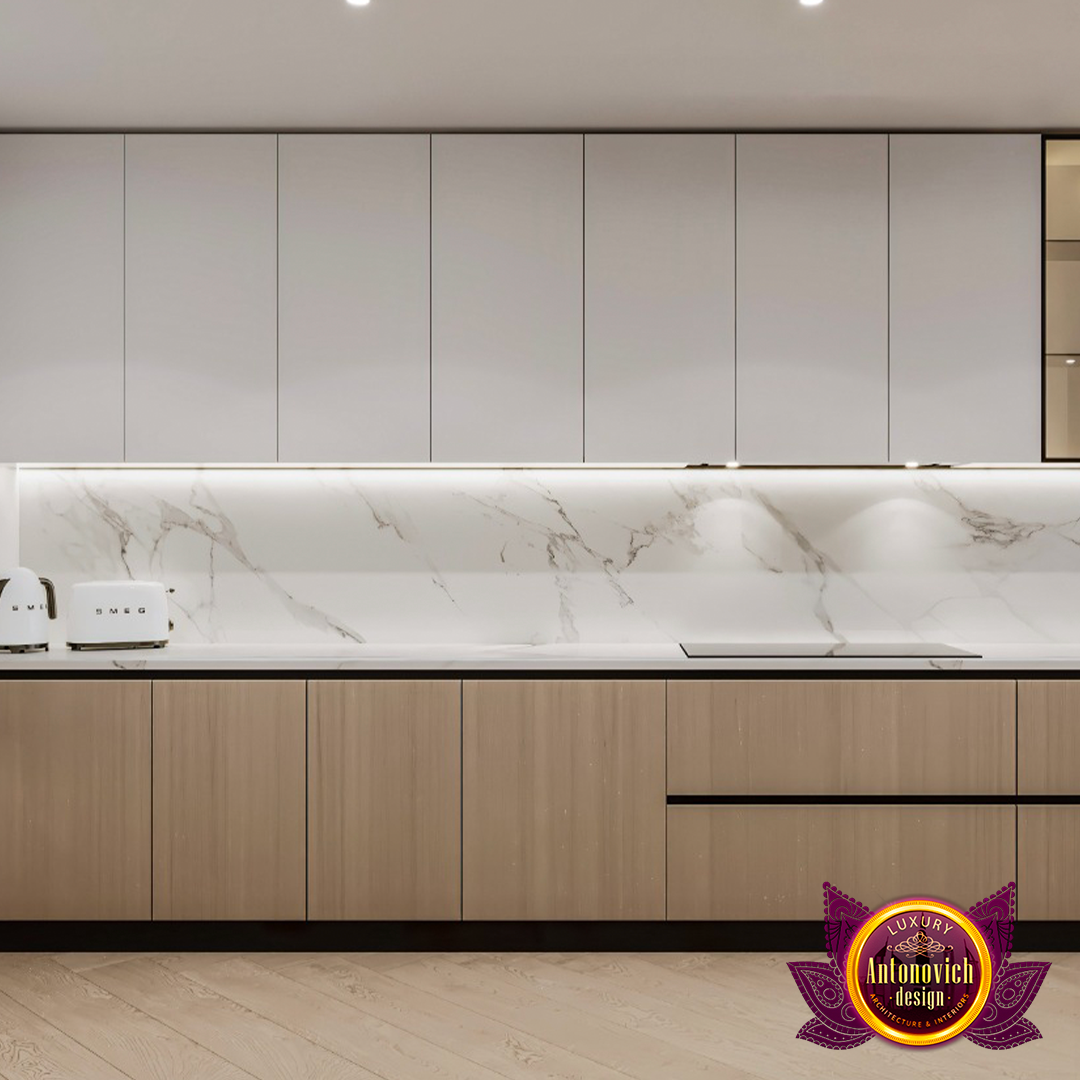 الكراسي والطاولات رائعة، والمساحة مزينة بتفاصيل فاخرة في كل زاوية. الرفوف والخزائن متقنة الشكل؛ انظر تصميم خزانة دبي لأفكار مرتبطة، مما يمنح ديكور مطبخ فخم دبي إحساساً مميزاً. التصميم العام فريد، له لون وبنية جميلان. درجات البني الفاتح الممزوجة بالبني الأغمق تخلق مزاجاً هادئاً ومريحاً في التصميم الداخلي للمطبخ الفاخر. الألوان مهنية أيضاً، والميزات التفصيلية الرائعة ستشجعك على الطهي لفترات طويلة في هذا المطبخ. هذا المزاج مناسب لشخصية فاخرة؛ اللون الفاتح مع لمسة بيضاء مناسب لمن يقدّر القطع المصقولة وتخطيطات عائلية مثل غرفة أطفال مريحة. كما نقدم أفكار مكتب منزلي في دبي للمساحات الصغيرة، ولأفكار منزلية أوسع اطلع على تصاميم بنغالو معاصرة، وأيضاً حلول للمناطق الخارجية مثل منطقة الشواء الخارجية. الجودة الرفيعة للثريا تجذب الانتباه؛ يكاد المكان يشعر وكأنك في غرفة فندقية! للمناطق الرطبة المتناسقة، انظر أفكار تصميم حمام وردي.
