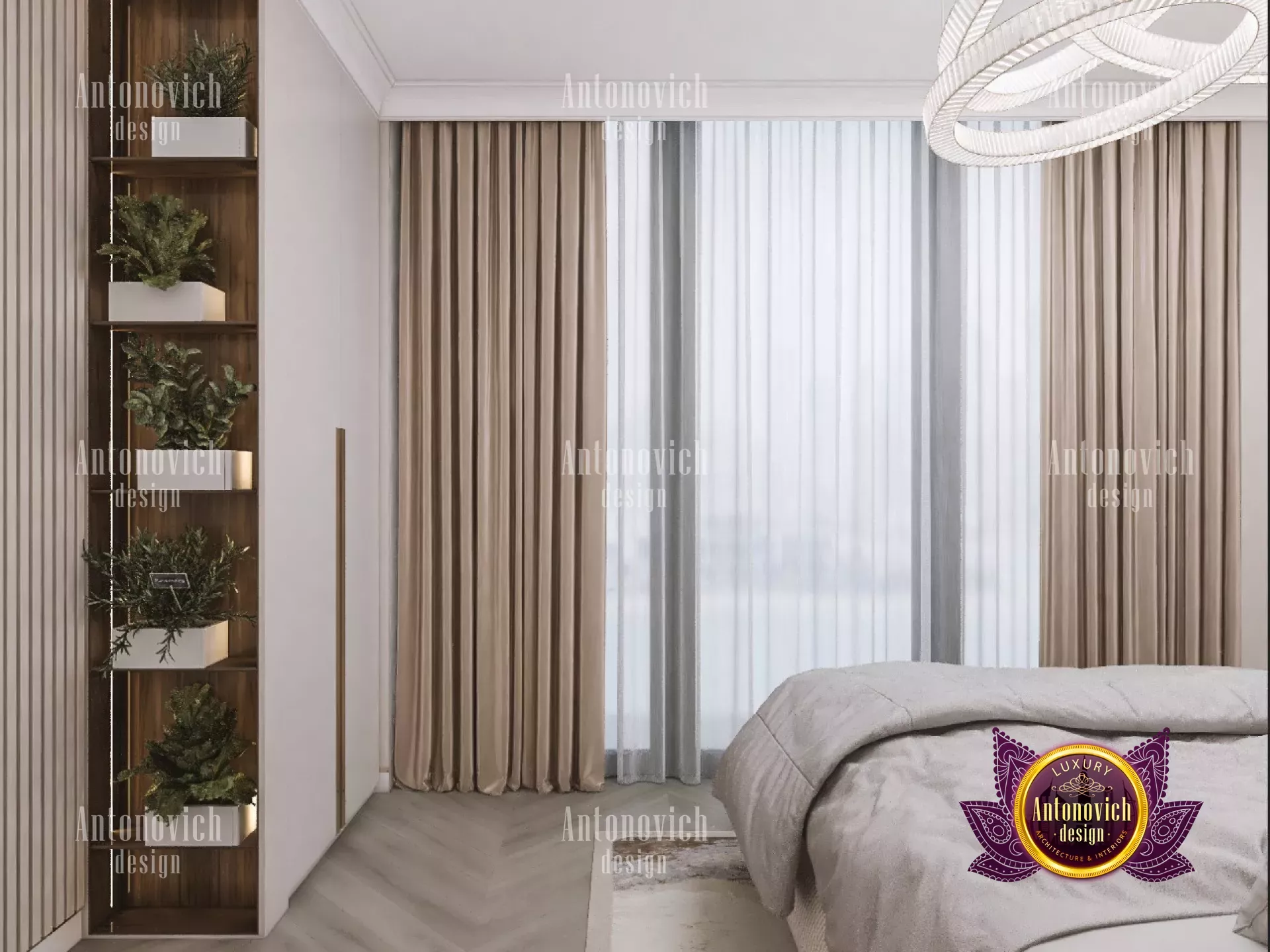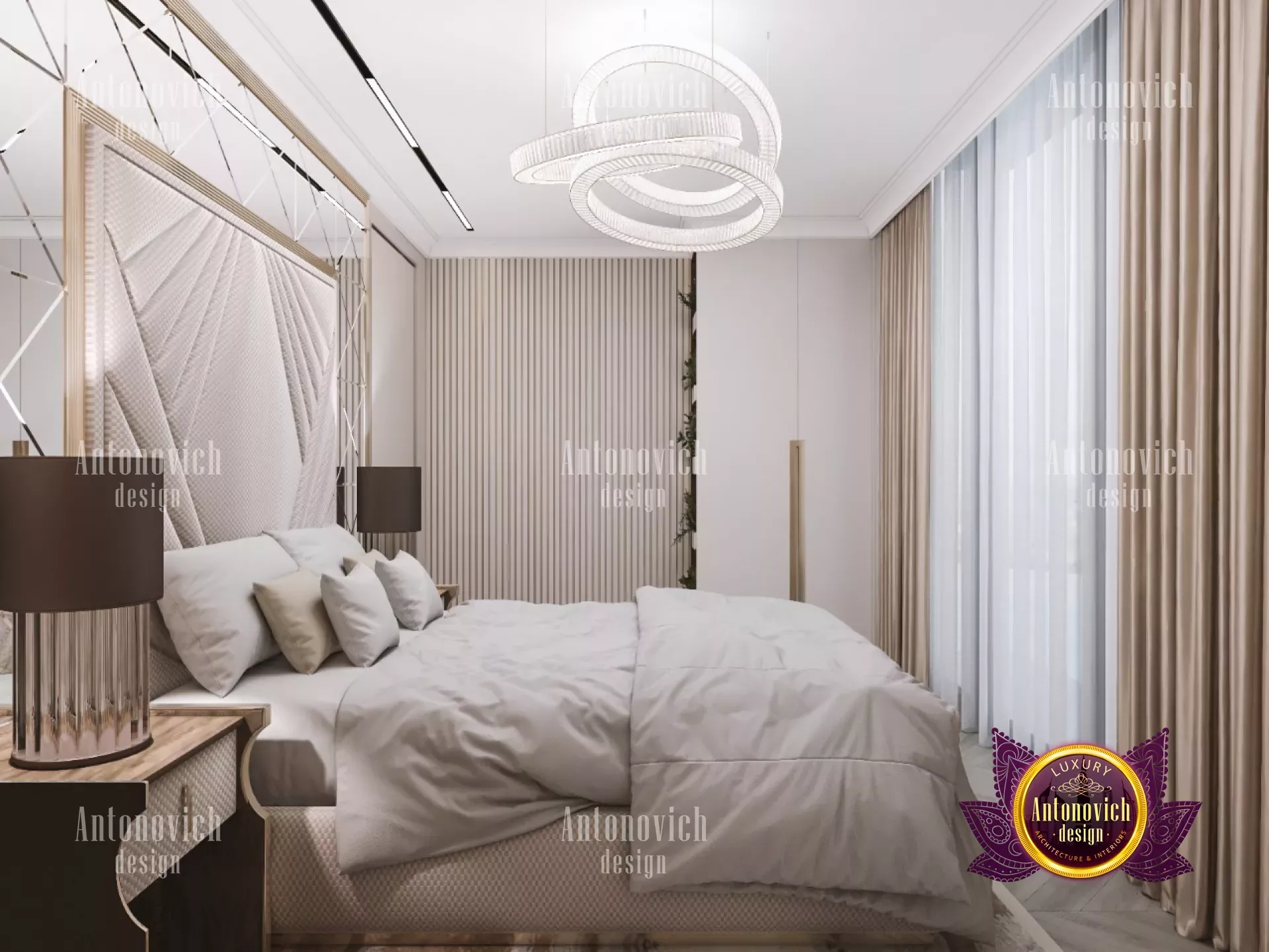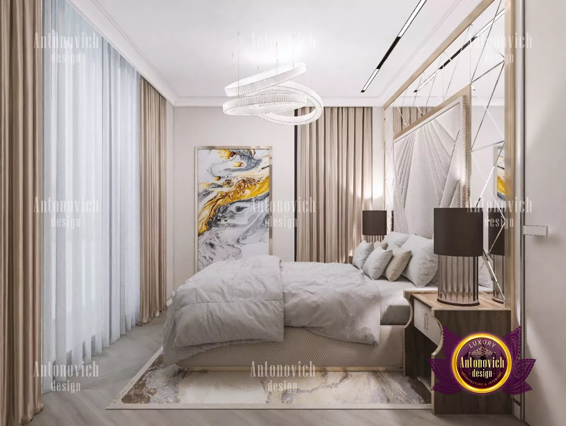 لا توجد إضاءة واحدة تناسب كل المساحات. الثريات الكبيرة تتنوّع في الأشكال والأحجام. قد يُعلّق ثريا متعددة الإضاءات فوق درج مفتوح، بينما تستفيد ردهة فندقية من عدد من الثريات البارزة. ربما تحتاج مساحة مفتوحة إلى نظام إضاءة كبير لملء الفراغ. في هذا المشروع لتصميم غرفة نوم فاخرة في دبي، اخترنا إضاءات كبيرة وجريئة تناسب الطابع الفاخر. للمزيد من الإلهام لغرفة النوم، اطلع على فكرة التصميم الداخلي الإبداعي لغرفة النوم.