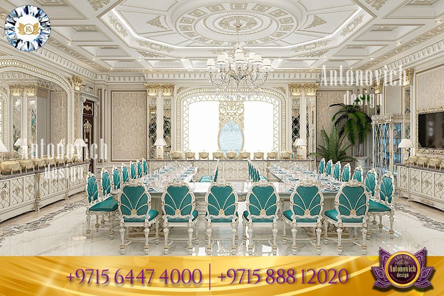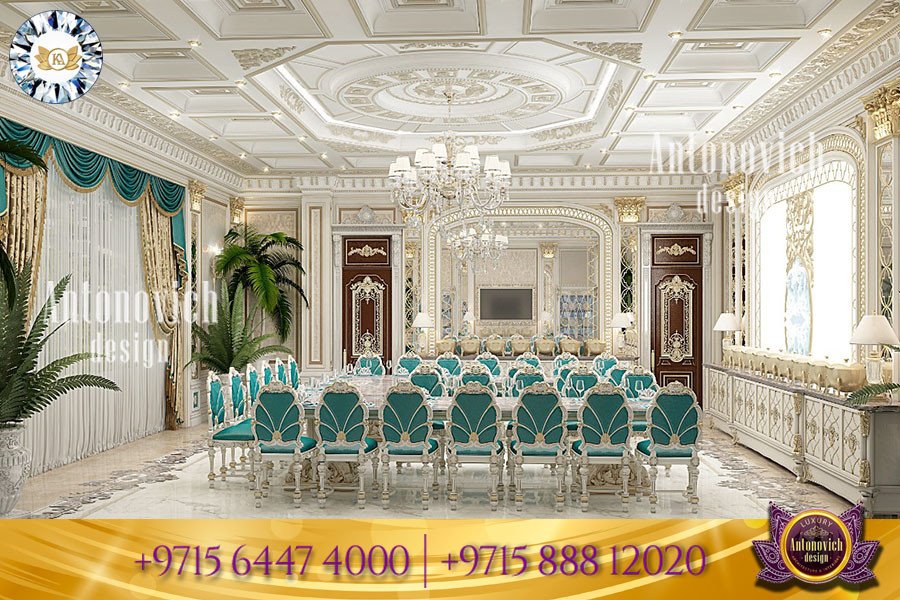 ما يجعل هذه الغرفة مميزة هو كيف حقق الطاولة لمسات أناقة فائقة عبر تصميم مخصص وأثاث مخصص على شكل حرف U يسمح باستيعاب عدد أكبر من الضيوف. الجدران والسقف احتويا تفاصيل فنية راقية من نقوش دقيقة وتصميمات جبسية بلمسات ذهبية. في محور تشكيل السقف وضعنا ثريا بارزة محاطة بتصميم سقف بثريا وإضاءات موضعية موزعة بعناية. ولأفكار حول الواجهات الخارجية، شاهد تصميم واجهات استثنائي. لمخططات متكاملة ومساحات مدمجة، اطلع على تصميم مطبخ وغرفة طعام فاخرة.