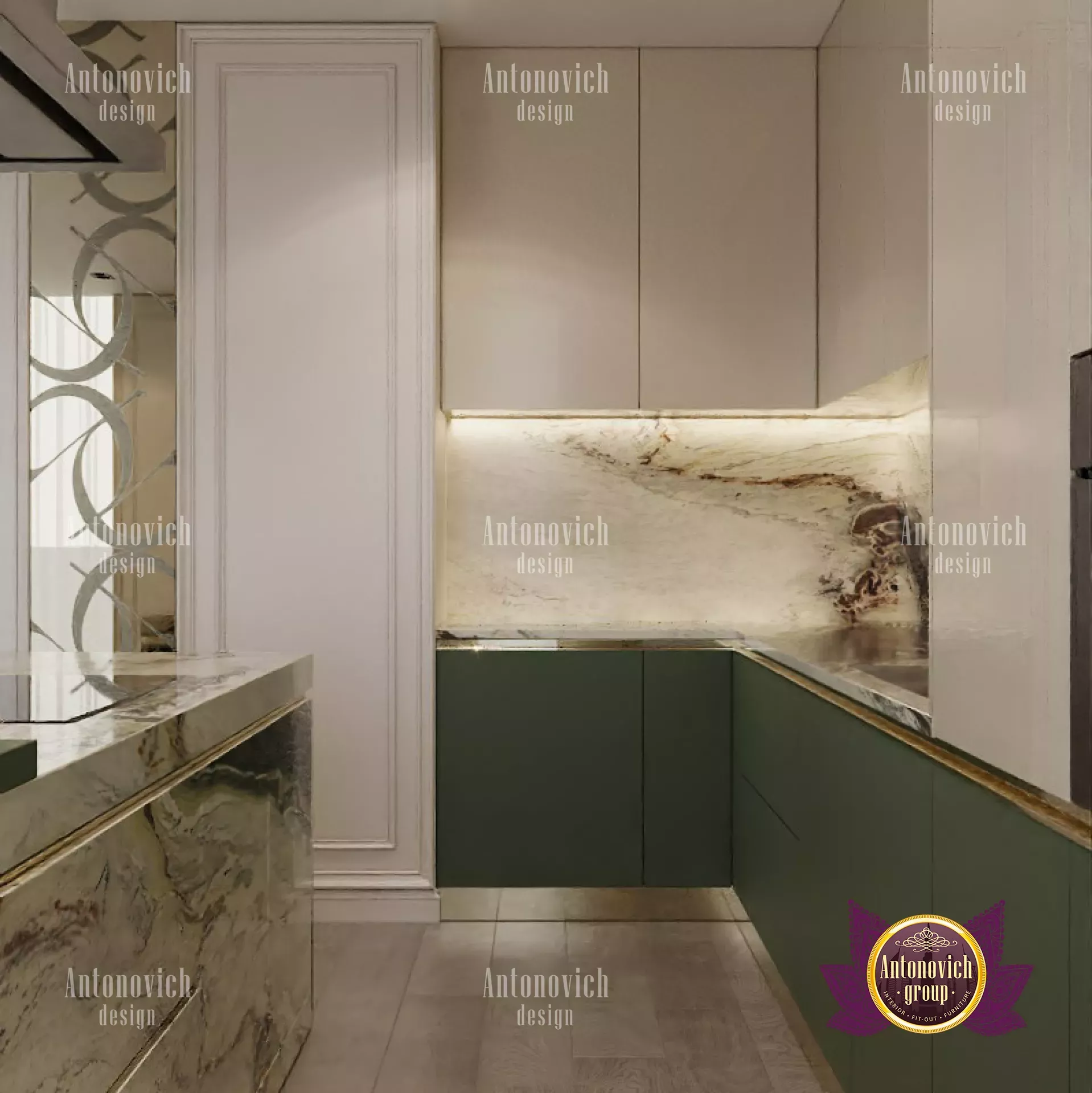 التصميم المخصص للخزائن رائج للغاية الآن؛ استخدم الألوان الداكنة والزجاج المدخن والمعادن العصرية لإضفاء طبقات وتعقيد على الخزائن، وفق خبير تصميم داخلي. انظر أيضاً إلى العمارة والتصميم الداخلي لاستلهام تكامل المواد والمساحات. اعتباران آخران لتجديد تصميم مطبخ عملي فخم دبي هما القشرة الداكنة والأخشاب ذات الحبوب الدقيقة. في السنوات الأخيرة ازداد ميل تصاميم المطابخ البسيطة مع آليات الضغط لفتح الخزائن، لكن التصميم يتجه الآن نحو المقابض المزخرفة الجميلة. أضف سجاداً مصنوعاً يدوياً لتحديد المناطق وتلطيف الصوت.