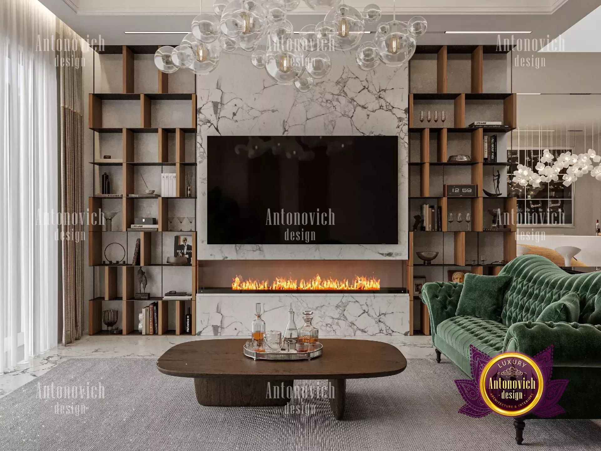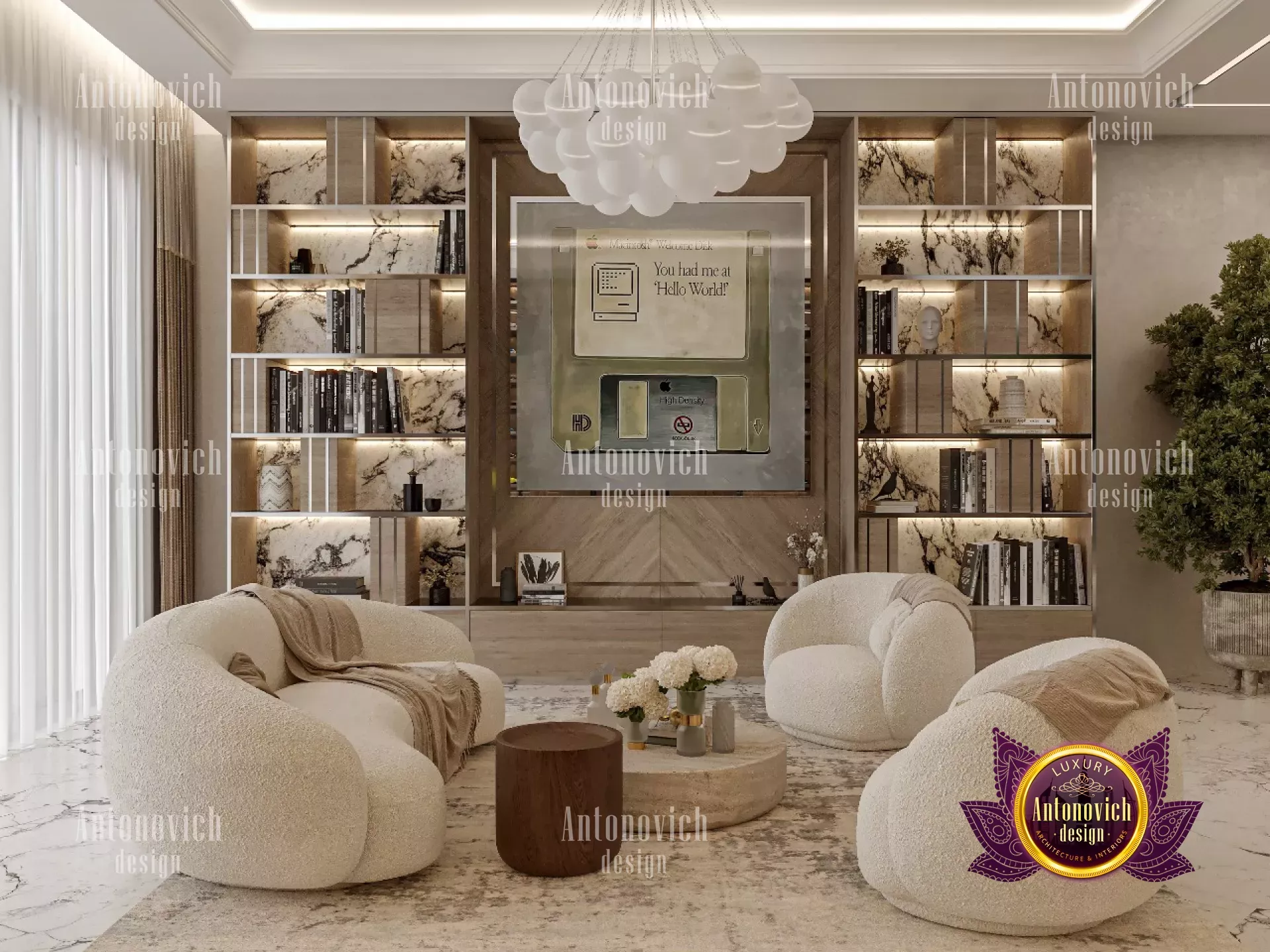 تصاميم غرف معيشة فاخرة مع تصميم داخلي راقٍ مصممة لأيام استرخاء مثالية. تصميم داخلي لغرفة المعيشة فاخرة يتضمن رف تلفاز كبير يتسع لكتب وأوانٍ وزينة وغيرها من القطع. يُظهر التلفاز في مساحة واسعة تضيف لمسة فخامة إلى هذا التصميم الداخلي الفاخر. أسفل التلفاز خزائن لوضع بعض متعلقاتك، وتضم منطقة المعيشة طقم أريك مرتب لتسترخي بعد يوم طويل. الطاولة المستديرة تتناغم مع الأريكة، والأعمال الفنية المستخدمة كـ لوحات حائط ديكور تضيف طابعًا مميزًا لهذا التصميم الداخلي لغرفة المعيشة الفاخرة. الجو العام يعكس أناقة وراحة بالغة.