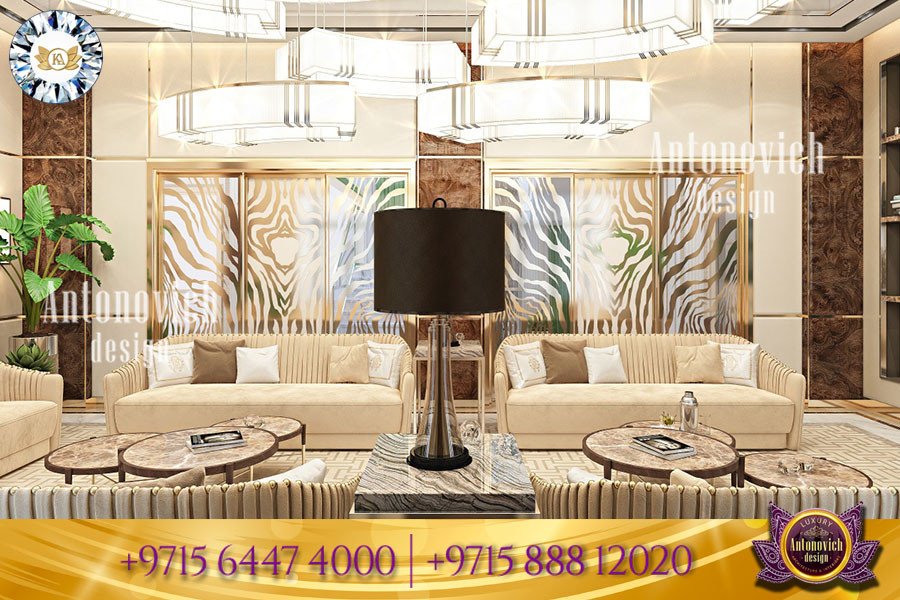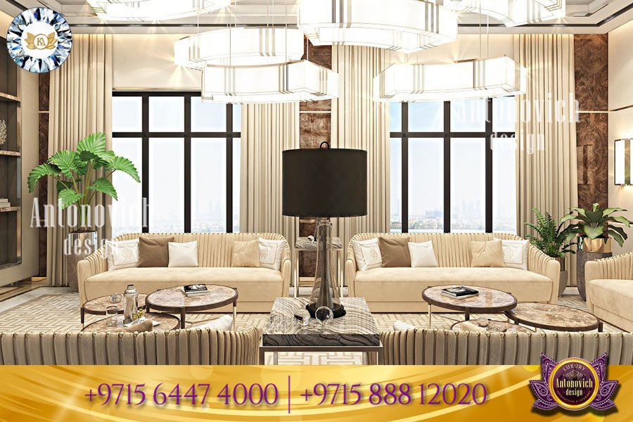 ننصح باعتماد ألوان حيادية للجدران والمواد الأساسية لتمكين فريق التصميم من إبراز الإبداع في تفاصيل الأثاث والديكور. يُنصح بتصميم سقف ملفت مع ثريا مميزة ضمن عناصر إضاءة ونجف فاخر، حيث يضيف تركيب ثريا مصممة بحسب الطلب بريقاً متكاملاً وإضاءة مثالية للمساحة. كما يكمل سجاد فاخر لغرفة الجلوس الإحساس بالدفء والراحة ويزيد من أناقة الأرضيات.