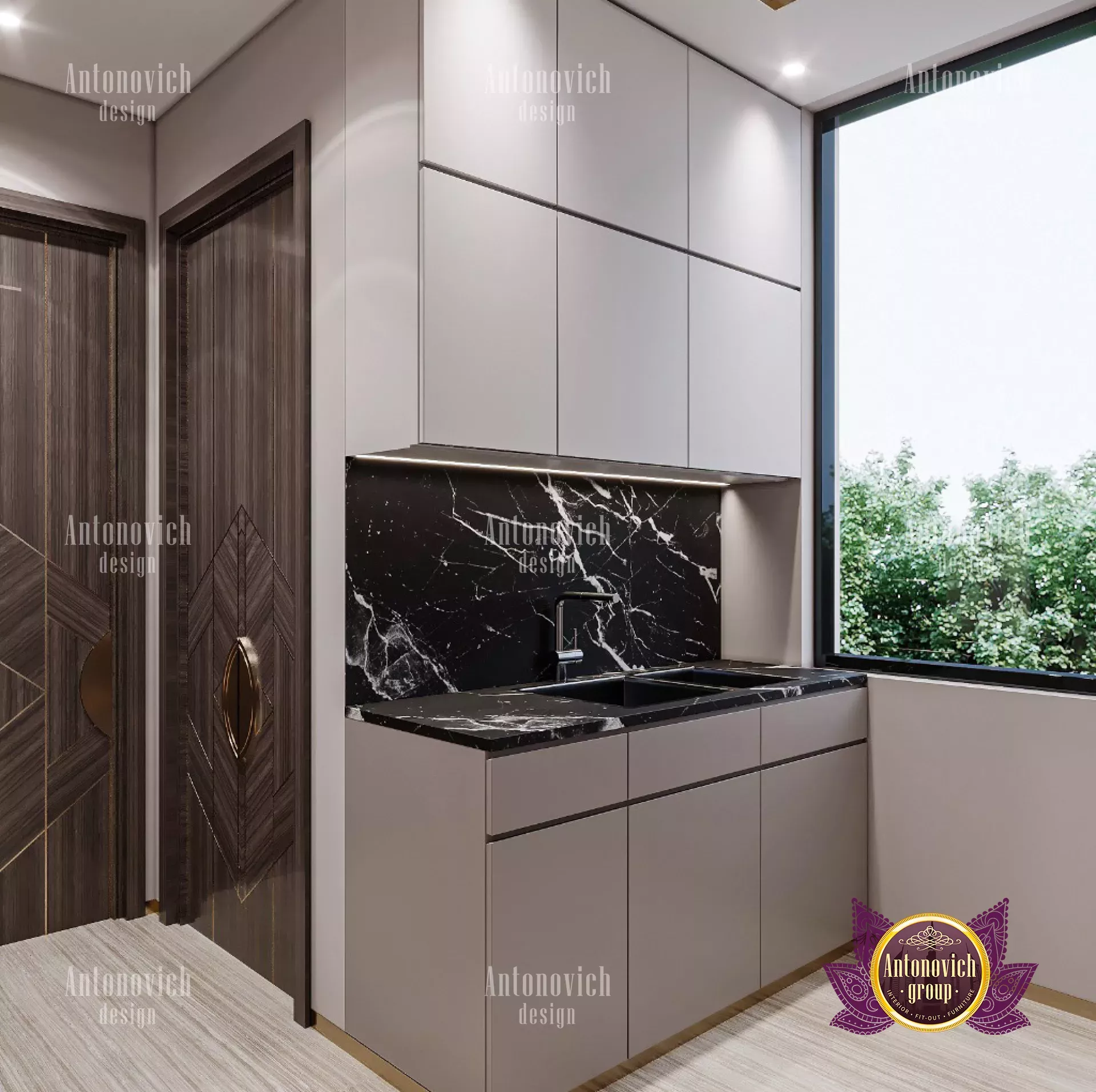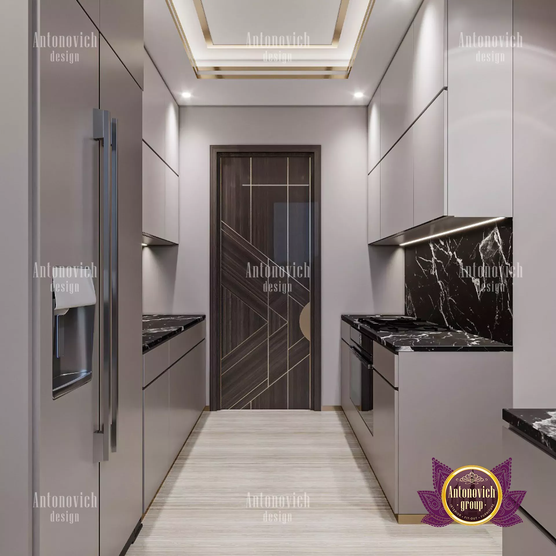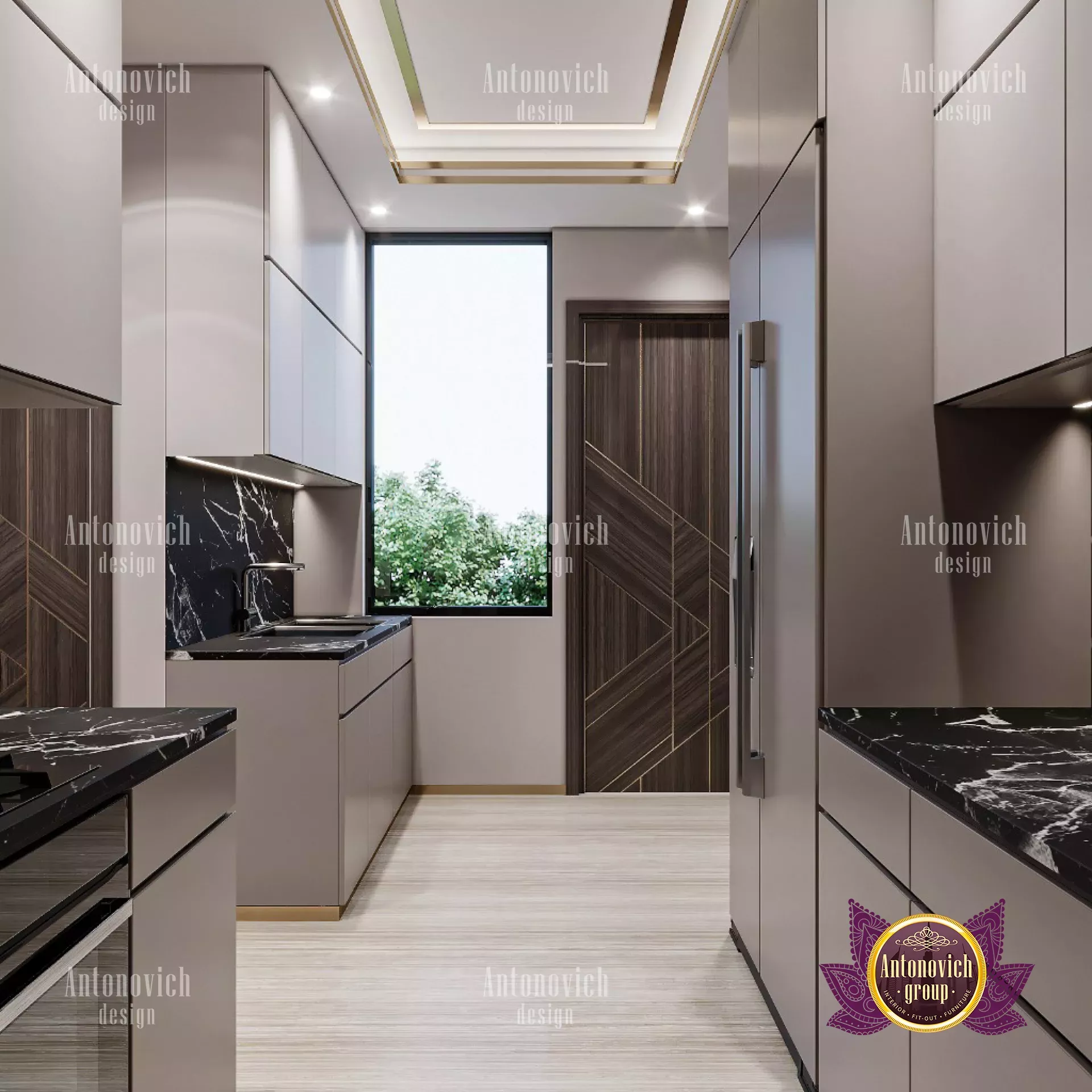 يجب أن يدمج المخطط الداخلي للمطبخ الفاخر كل العناصر اللازمة للطهي السريع والتنظيم الأنيق. ضمنت أنطونوفيتش ديزاين (Antonovich Group) أن يكون كل عنصر في الغرفة منظمًا بذوق ورقي في هذا التصميم الداخلي للمطبخ. في التصميم الداخلي للمطابخ الفاخرة تظهر أنماط مبهرة، وتزيد أرضيات مطبخ فاخرة ذات النمط المركزي من جاذبية المساحة. وللاطّلاع على حلول الأرضيات المتقدمة راجع تصميم احترافي للأرضية. ينسجم التصميم مع تصميم سقف مطبخ فاخر والأرضيات، بينما تضيف الثريا لمسة فخمة بحد ذاتها. تتكرر عناصر زخرفية تذكّر بتصميم المجلس الملكي الداخلي (royal majlis interiors)، مستمدة إشارات دقيقة من المساحات الرسمية الأخرى. بقية الغرفة، بما في ذلك الحوض والطاولة الطويلة، توازن بين الألوان الداكنة والفاتحة. للاطلاع على أفكار للمساحات المعيشية المتكاملة، راجع دليل غرفة معيشة فاخرة حديثة. المنطقة الرائعة مزينة بأثاث أنيق، كما أن تصاميم الأثاث الخاصة بالمطبخ الفخم تظهر على الجانب الآخر من الغرفة؛ الطاولات والخزائن والكراسي جميعها عناصر جميلة تُكمّل الفكرة العامة.