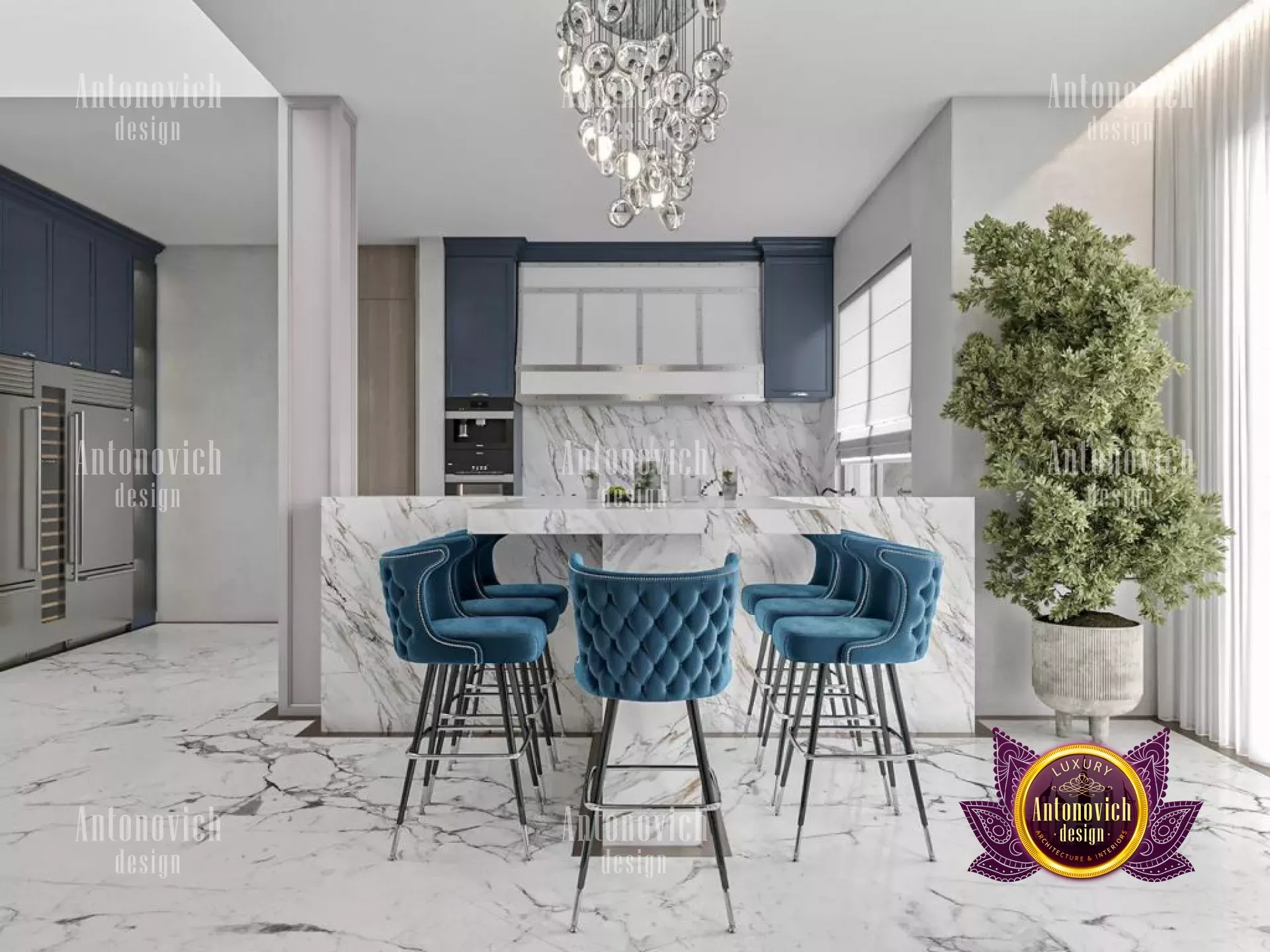 يمكن للألوان الزرقاء أن تضفي دفئاً ومرحّباً على المكان عند الحاجة. هذه المساحة حُيِّيت بكراسي طعام مبطنة ذات ألوان جذابة، ما يمنحها «عامل دهشة». كما أن السطح الرخامي مقاوم للخدش، مما يجعله متيناً وسهل التنظيف وملائماً لتصميم غرفة طعام لعائلات مع أطفال. من الممكن أن تكون مقاعد غرفة الجلوس في تصميم داخلي دبي حيادية أو ذات طابع مبهر. مهما كان النمط الذي تختاره، من الضروري وجود مقاعد مريحة جداً مثل كراسي طعام مريحة وعصرية. إذا كانت منطقة الطعام ملاصقة للمطبخ، نسق ثيم المطبخ لتحقيق انتقال سلس؛ ففكرة دمج مطبخ ومنطقة طعام تضمن انسيابية الحركة. اطّلع على تصميم المطبخ الفاخر لمزيد من الإلهام. لا تنس إتمام الشكل بكرسي أنيق لمزيد من الراحة والفخامة. اختر الأدوات والتجهيزات من MERONI Catalog 7 لتشطيبات راقية، أو استعرض مجموعة Cavour Bestof. غرفة الطعام هي المكان الذي تجمع فيه الأسرة والأصدقاء لعشاء العطلات واحتفالات أعياد الميلاد والوجبات اليومية. عند غروب الشمس ستقضي وقتاً طويلاً في غرفة الطعام، لذا اختر قطعة إضاءة تتجانس مع محيطك.