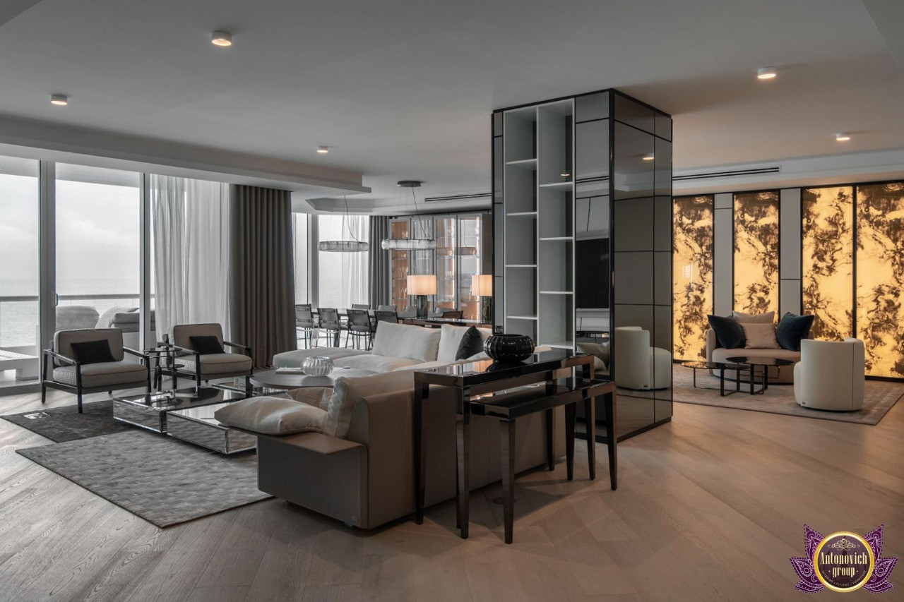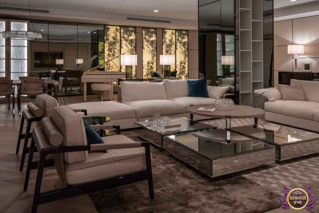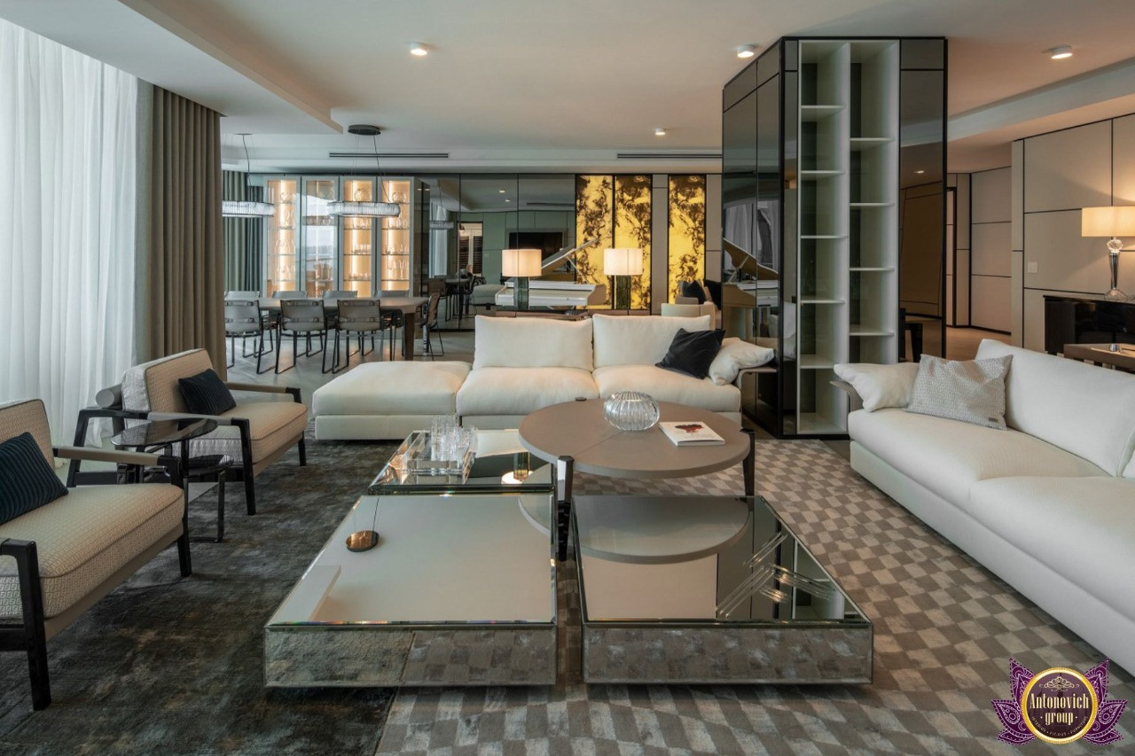 التفاصيل التصميمية فائقة الدقة وجميلة للغاية. ديكور أنطونوفيتش ديزاين (Antonovich Design) لهذا الصالون الفاخر اعتمد أفضل قطع الأثاث. يمكنك العثور على كثير من هذه القطع في متجر أثاث فاخر، حيث تتميز الكراسي والطاولات بتصميم أنيق وجودة صلبة. تضم المجموعة أيضاً قطعاً من كتالوج MODENESE GASTONE. تناسب الظلال الراقية هذه التحف الفريدة، كما أن التركيبات في هذا الديكور الفاخر لغرفة المعيشة مصممة بحرفية عالية. في كل زاوية، ستجد قطع فن متميزة تتناسق مع تصميم الصالات الداخلية غرف معيشة دبي.