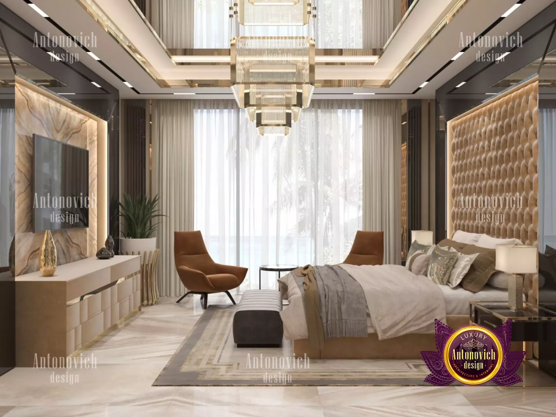 أنيق وفاخر بكل معنى الكلمة. يجمع هذا التصميم الداخلي لغرفة النوم الفاخرة أثاث غرف نوم فاخرة مخصص لضمان تفوق الغرفة على التوقعات. النغمات تبقى بنية فاتحة، مما يمنحها هالة عصرية جذابة. لضمان اتساع إضافي، تضم الغرفة طاولات وكراسي فاخرة. الثريا أيضًا مميزة وعصرية للغاية. توضع المرايا بشكل استراتيجي مع أشكال وأنماط مميزة. إن كنت تبحث عن أفكار أو تريد تحسين غرفة نومك لتصبح أكثر أناقة وفخامة، فأنت في المكان المناسب؛ اطلع على نصائح تصميم غرف النوم الحديثة للحصول على إرشادات تنفيذية. هذه غرفة أنيقة وعصرية! المساحة الشاسعة مصممة ومنسقة بذوق رفيع. هي عمل فني بحد ذاتها. شهد العديدون براعتهم في تحقيق أفضل تصميم غرفة نوم بألوان بنية وذهبية. غالبًا ما يتعاونون مع مهندس استشاري لصقل التفاصيل الهيكلية والفنية. خدماتهم في التصميم الخارجي تضمن تناسق المنزل بأكمله. راقب كيف يترابط الأسلوب الداخلي مع واجهات المنزل الحديثة الفاخرة لمظهر خارجي متناغم. وبالنسبة للمشاريع الفخمة جداً، يمكن الاطّلاع على أمثلة تصميم داخلي للقصور. كما يقدّمون خدمات توريد متخصصة بما في ذلك توريد أثاث للبحرين. بقوة التصميم وبهائه، يكمل تناغم اللونين البني والذهبي بعضهما البعض. هذا التصميم الداخلي المذهل خيار رائد للعديد من الأسر الراقية.