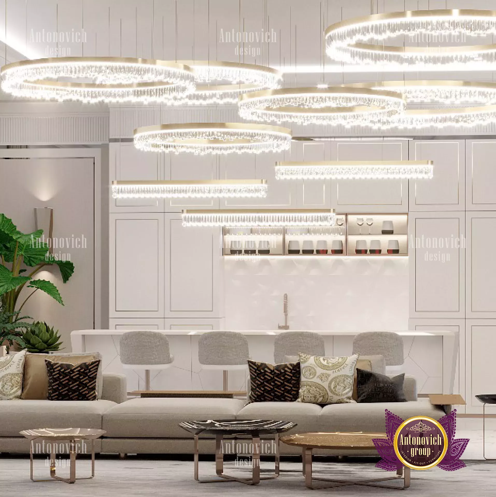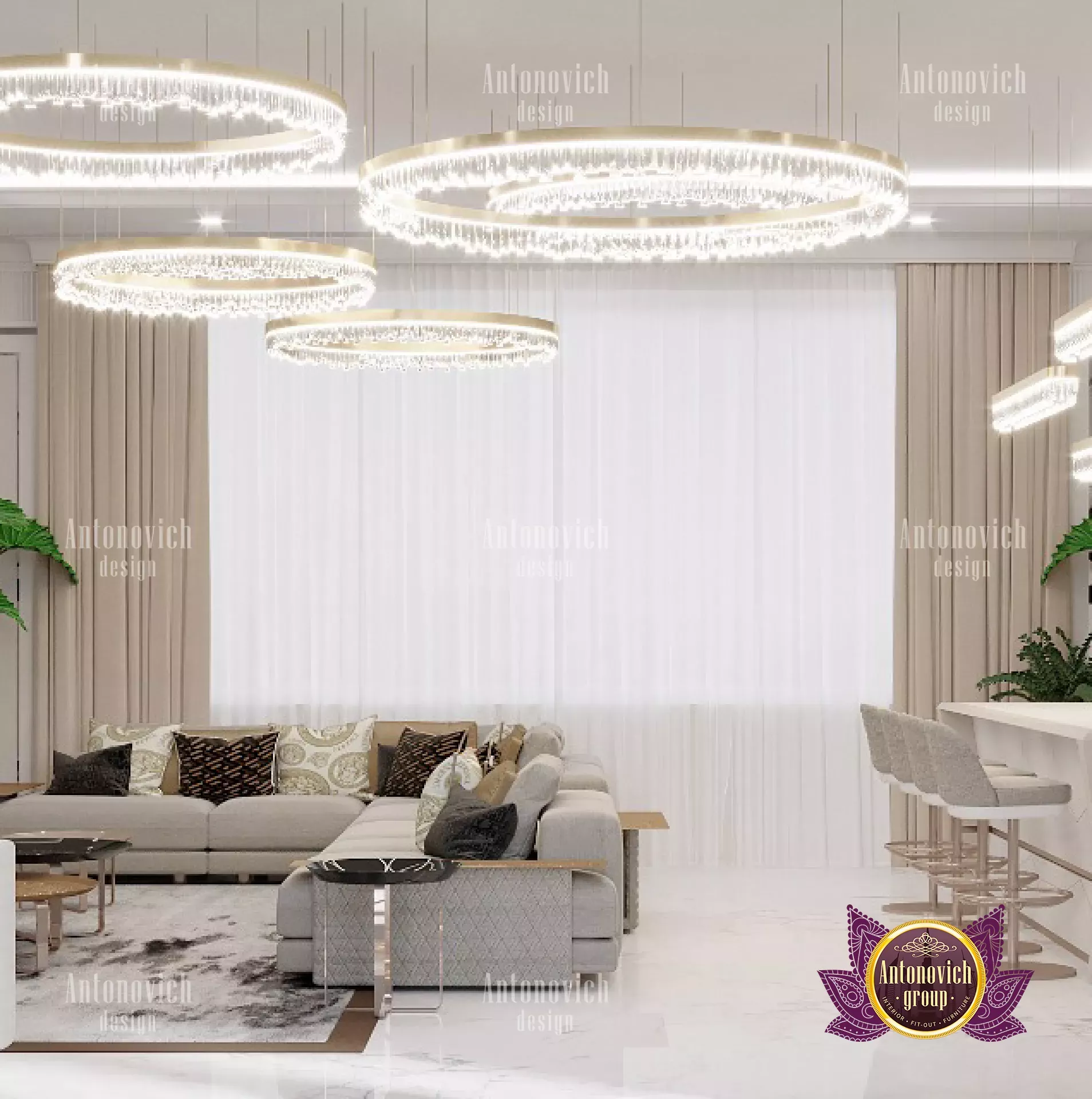 تتضمن هذه التصاميم إضاءات ملفتة مثل الثريا بالسقف وأباجورات في كل زاوية، ما يعكس اهتمامًا بإضاءة غرفة المعيشة الفاخرة. يتسلل ضوء طبيعي كثير عبر نوافذ كبيرة، لينسجم مع ديكور غرفة المعيشة الفاخر. من أهم سمات هذه الشقة الستائر؛ ستائر لغرفة المعيشة الفاخرة تضيف طابعًا أنيقًا وحميمًا. تفضيل التباين بين الأبيض والبني شائع لأن ألوان غرفة المعيشة باللونين الأبيض والبني تمنح الغرفة عمقًا ودفئًا. ولزيادة البُعد التصميمي، يمكن إضافة جدران 3D وديكور جبس لخلق ملمس واهتمام بصري.