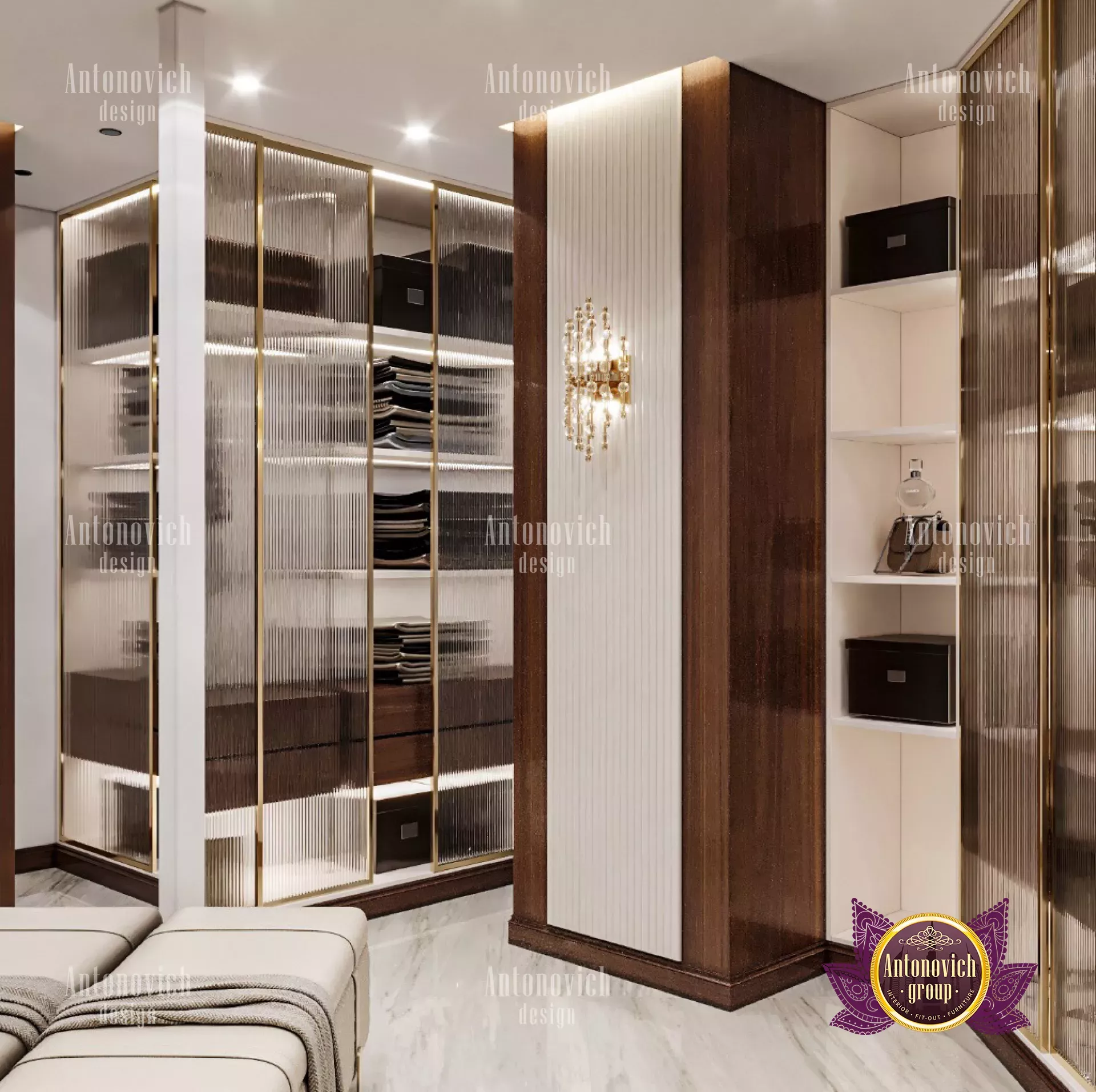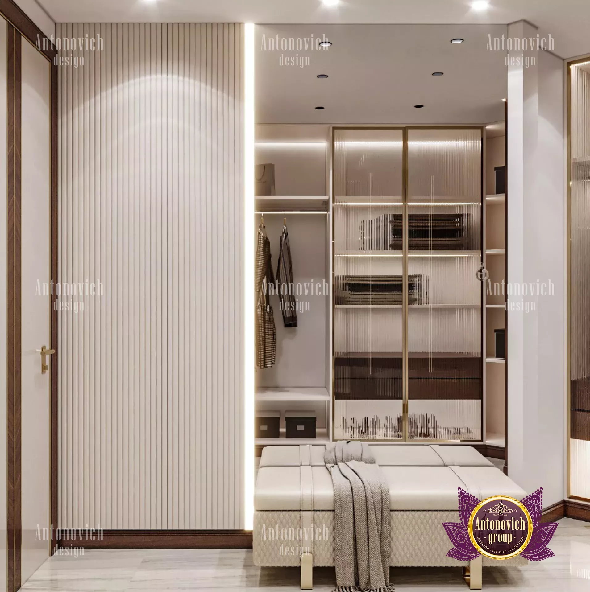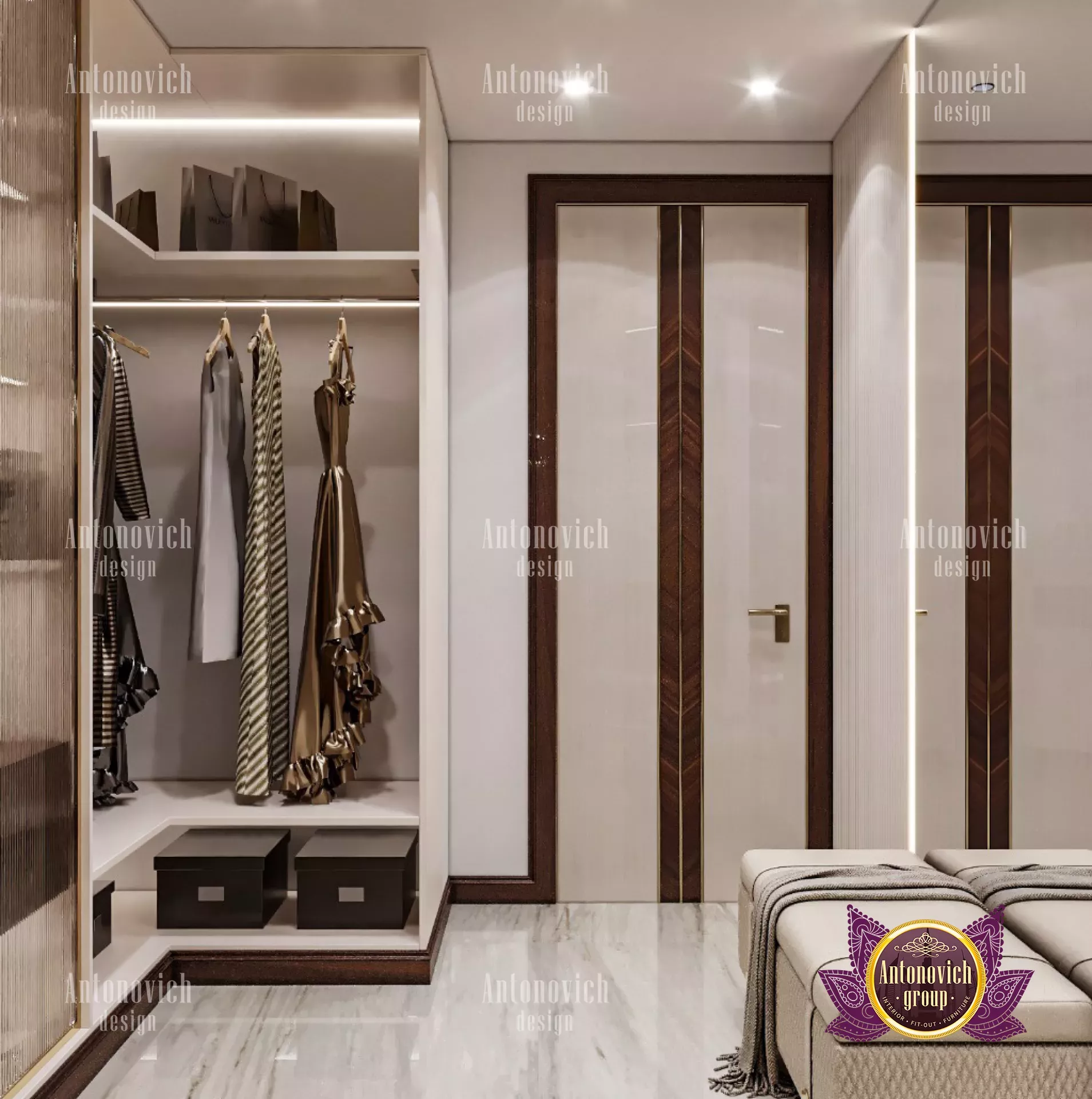 هذه الغرفة منجزة فنياً، تمنح مزاجاً راقياً ومتناغماً. لمسات بيضاء جميلة والتصميم الداخلي متميزة. لن تمل أبداً من ارتداء ملابسك داخل النمط الداخلي لهذا المنزل الفاخر. الأثاث مترف، والأسلوب الراهن هو محور تصميم غرفة الملابس الفاخر. نفس المقاربة تنطبق على تكليفات أخرى، بما في ذلك التصميم الداخلي العصري، وكذلك تصميم كيه تي الحصري.