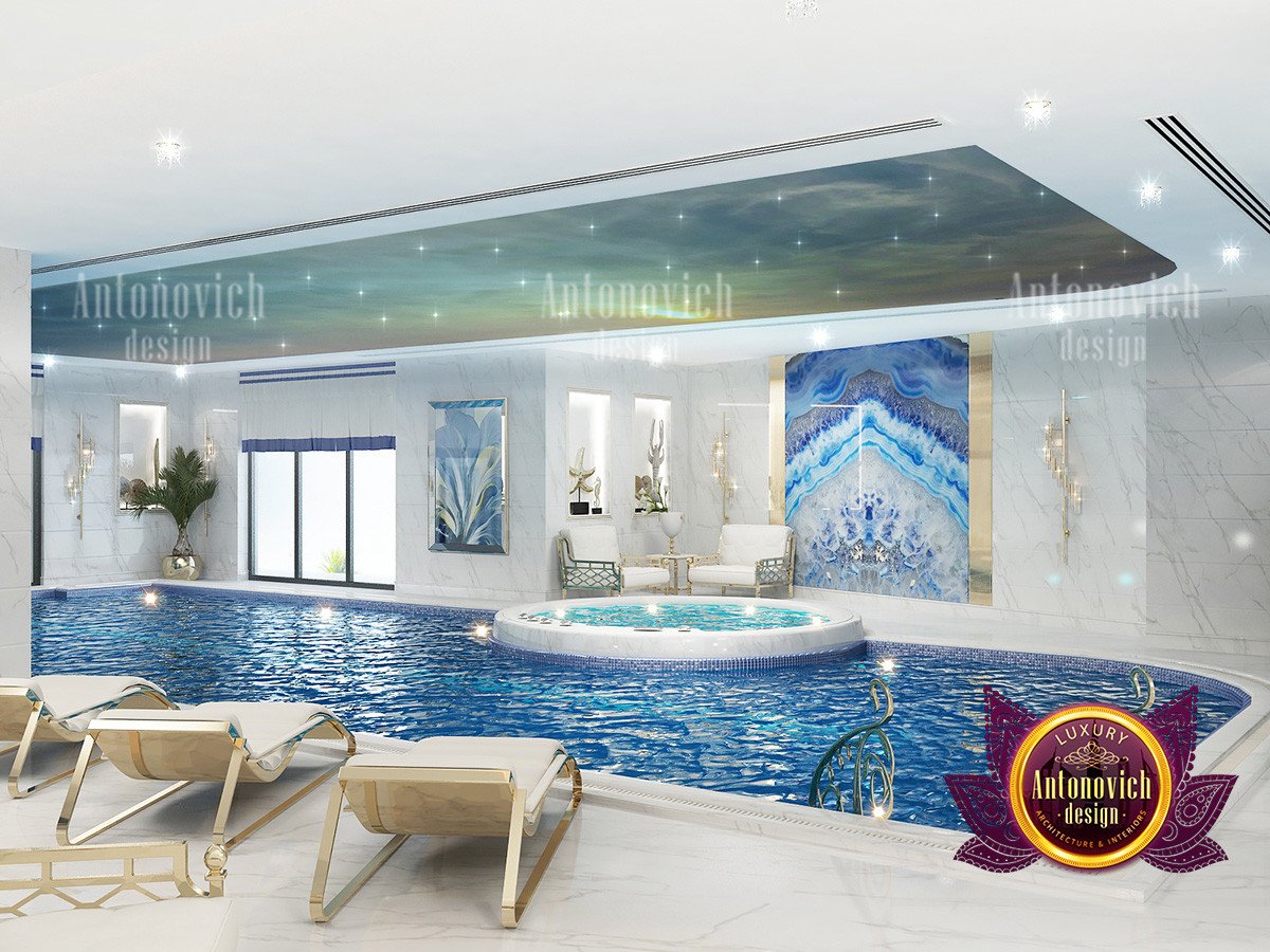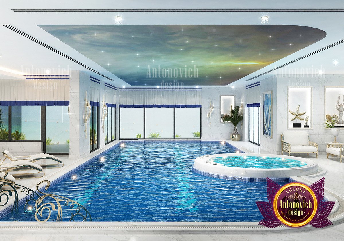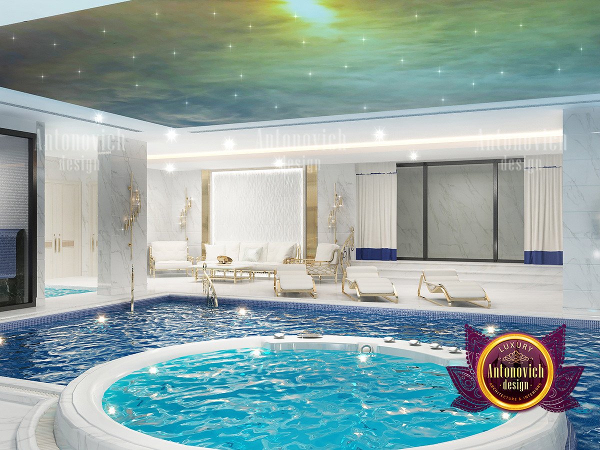 تحدث عن السقف اليدوي الصنع الجميل! هذه العناصر المصنوعة يدوياً أنيقة في كل زاوية، والإضاءات المنبعثة من الماء تشكل إضاءة تحت الماء للمسبح وهالة ساحرة. هذا الأسلوب يحتوي على كل ما تحتاجه لامتلاك تصميم مسبح داخلي مميز؛ السقف المذهل الشبيه بالسماء هو حلم للجميع، بألوانه الجذابة وتصميمه الشبيه باللوحة، مع خيارات تصميم ثريات فاخرة تكمل المشهد. الجدران أيضاً لا تُغفل: هذه تشطيبات رخامية لمسبح داخلي بتدرج رمادي راقٍ تضفي انطباعاً فاخراً على التصميم الداخلي للمسبح. نستخدم مواد فاخرة لمسابح داخلية ونقدم تخطيط مسبح داخلي فاخر يوازن بين الجمال والوظيفة. كما نقدم خدمات داخلية تكميلية مثل تصنيع خزائن ملابس مخصصة ومفاهيم مطبخ متناسقة مفهوم مطبخ مودرن يتماشى مع التصميم العام.