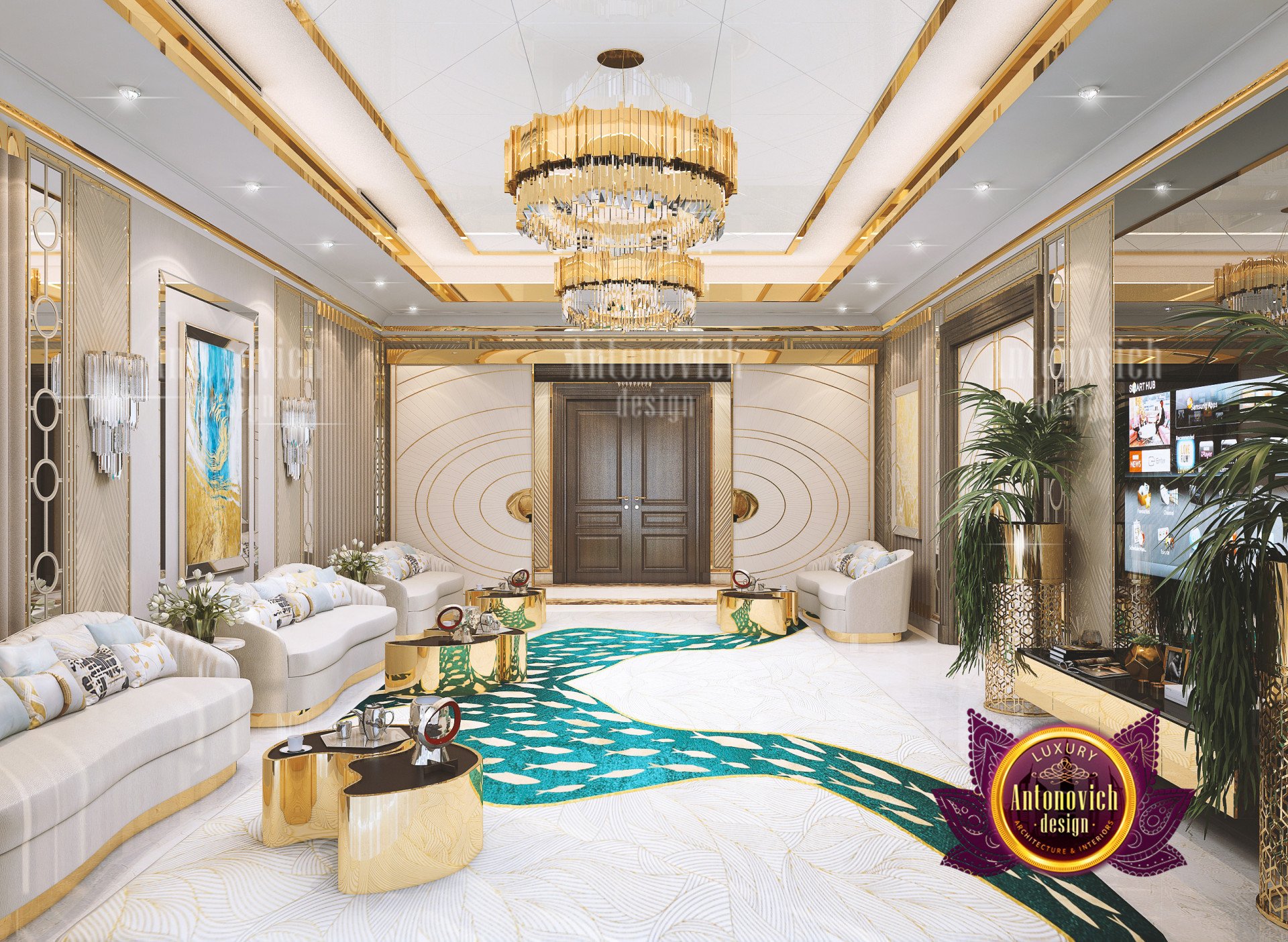 العنصر الأبرز في هذا التصميم الداخلي الجميل هو أرضية بلون التيـل. التصميم التجريدي الراقي بألوان التيـل صُمّم بذوق فخم. تضيف تفاصيل الرخام المزيد من البذخ إلى الديكور الداخلي للغرفة. إلى جانب ذلك، يمنح الطابع المرح للأرضية إحساساً بالغنى والترف. تُنفّذ هذه الأفكار بالأدوات والتقنيات المناسبة لتقديم الأفضل في التصميم الداخلي الفاخر.