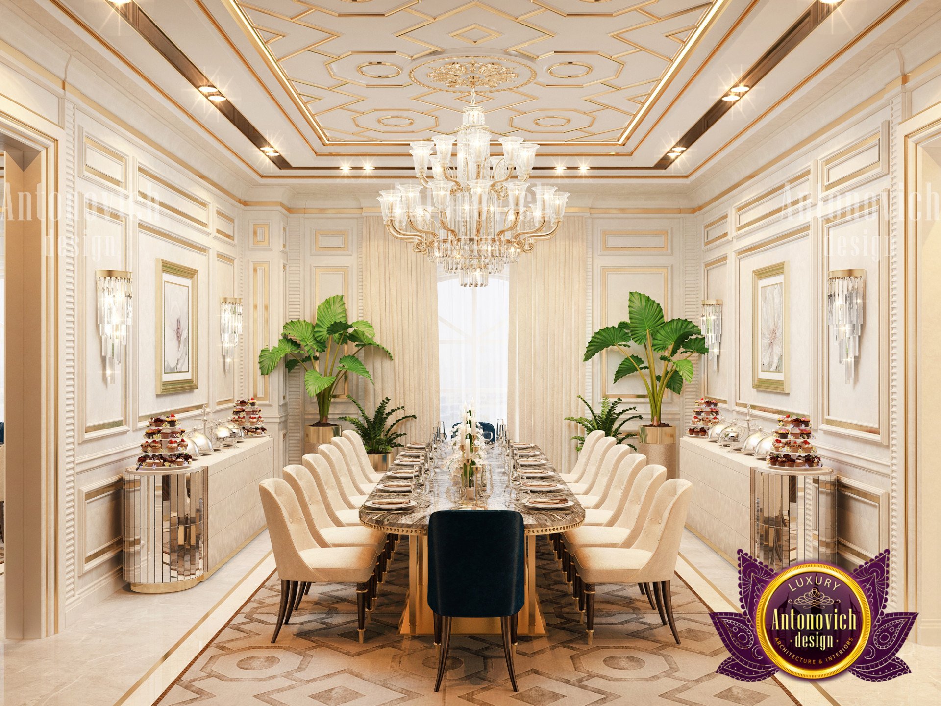 - أرضيات رخامية: كما ترى، الأرضيات الرخامية لغرفة الطعام تبدو غنية تماماً. بدل وضع سجادة فقط، أدمجنا نقوش رخامية مخصصة متناسقة مرتبطة بموقع طقم الطَّعام. هذا يخلق لعبة بصرية متقنة وتخطيطاً أرضياً متزنًا. الطبعات النباتية المتماثلة تضفي حيوية وأسلوباً لا يقاوم. للمراجع حول تنظيم المساحات، انظر أفضل مخططات المنازل ٢٠٢١.