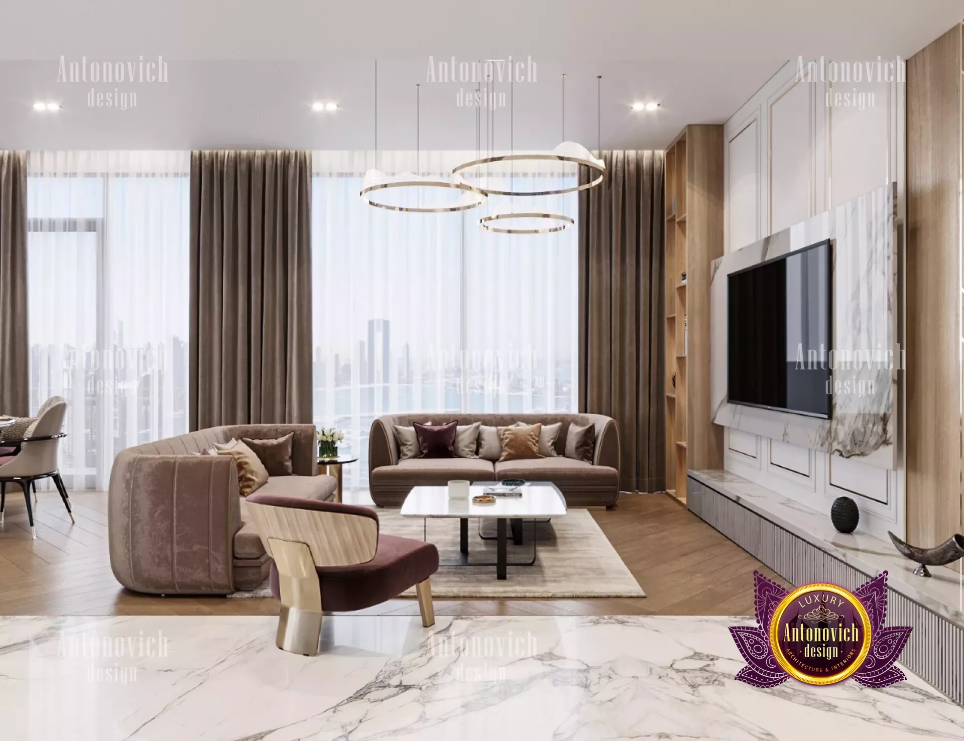 تتمتع هذه المساحة بأجواء فخمة. استخدمت أنطونوفيتش ديزاين (Antonovich Design) أفضل القطع في تصميم هذه الغرفة الفاخرة. تتميز الكراسي والطاولات بالتصميم الأنيق والراحة. تكمل الدرجة اللونية الخلابة العمل الفني المبدع، والتجهيزات في هذا التصميم مُنفذة بعناية فائقة. تنتشر الأعمال الفنية المتميزة التي تكمل التصميم الداخلي في دبي في أرجاء المكان. الإضاءة مميزة للغاية. بالنسبة لتصميم غرفة المعيشة الفاخرة، تناسب الثريات المدهشة التي تشبه قطرات الماء الأنيقة. يمتزج في هذا المنزل الفاخر أنماط مبهرة تتناغم مع التصميم العام لصالة المعيشة. ستلاحظ إبداعات أنطونوفيتش ديزاين التفصيلية إذا راقبت المساحة بعين ثاقبة. تبدو كإقامة بفخامة فنادق خمس نجوم حيث فُحص كل تفصيلة بعناية. يمكنك أيضاً استعراض مشروع تجديد فيلا بجزيرة النخلة لأفكار التجديد. لمزيد من خيارات الأثاث والمفروشات تصفح المتجر الأكبر للأثاث في دبي. المخمل خيار أنيق للمنزل؛ ينقل إحساساً فاخراً للمطلعين على تصميم غرفة المعيشة الفاخرة. في هذا التصميم، يُستخدم لون المخمل كلوحة تمييز بينما الألوان الأساسية هي البني والرمادي. تعمل هذه الألوان الثلاثة بتناغم لخلق طابع حيوي وصناعي يناسب التصميم الفخم لغرفة المعيشة.
