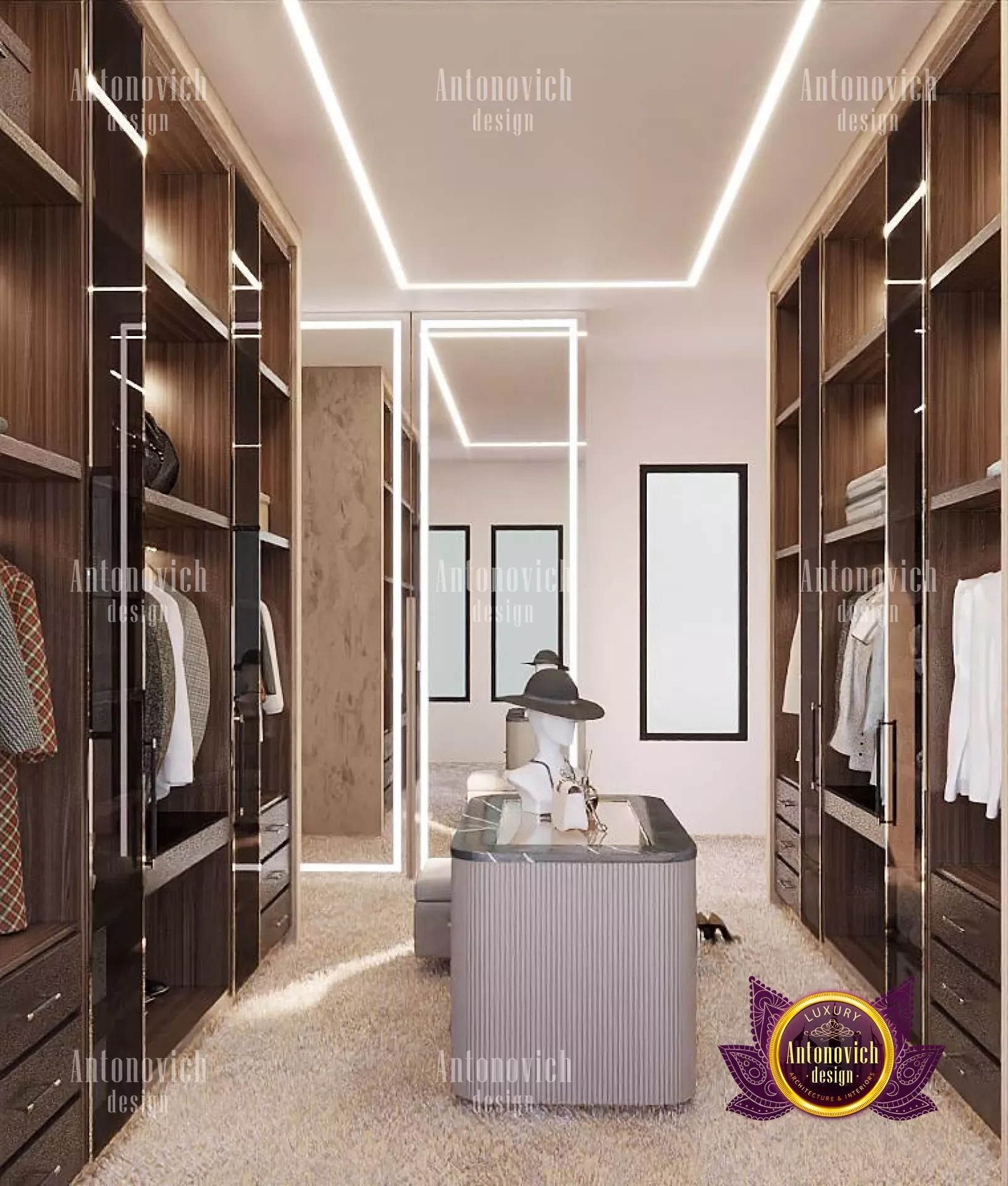تضم هذه الغرفة الجميلة عناصر خشبية تمنحها مظهرًا أنيقًا، مع لمسات تختصر الفخامة والحداثة. في عام ٢٠٢٢، باتت النغمات الترابية والمحايدة مطلوبة، ولذلك يفضل الكثيرون اعتماد تصميم كلاسيكي فاخر للمنزل. عملت أنطونوفيتش ديزاين وفريقها من أفضل المصممين على اختيار أجود المواد والأثاث المتاح في الإمارات لتنفيذ هذا المشروع. ستجد عناصر كلاسيكية فاخرة في السرير والجدران والأثاث، وهو مثال آخر على تصميم داخلي مودرن في الإمارات يُظهر توازنًا بين الراحة والرفاهية. تعاونت أفضل شركات التصميم الداخلي في الإمارات لإبراز هذا الطابع الأنيق، ومن أبرز معالمه ثريا كبيرة صُنعت بتفاصيل متميزة من قبل مصممين مرموقين في الرياض. كما تناسبه قطع مثل تأثيث المرايا الدائرية وتستفيد التصاميم أيضاً من معايير تصميم المجلس الملكي. المساحة في هذه الغرفة واسعة بما يكفي للعمل من المنزل، وتضم سريرًا وكنبًا مع رف أنيق. لعروض خزانة ملابس مخصصة، راجع دليل خزانة المشي الفاخرة للرجال. يشتمل أفضل تصميم غرفة نوم فاخرة على كل ما يلزم لصنع مساحة فريدة تفخر بعرضها يوميًا؛ ولمشاريع تحفية فنّية اطلع على تصميم منزل فاخر عالمي.