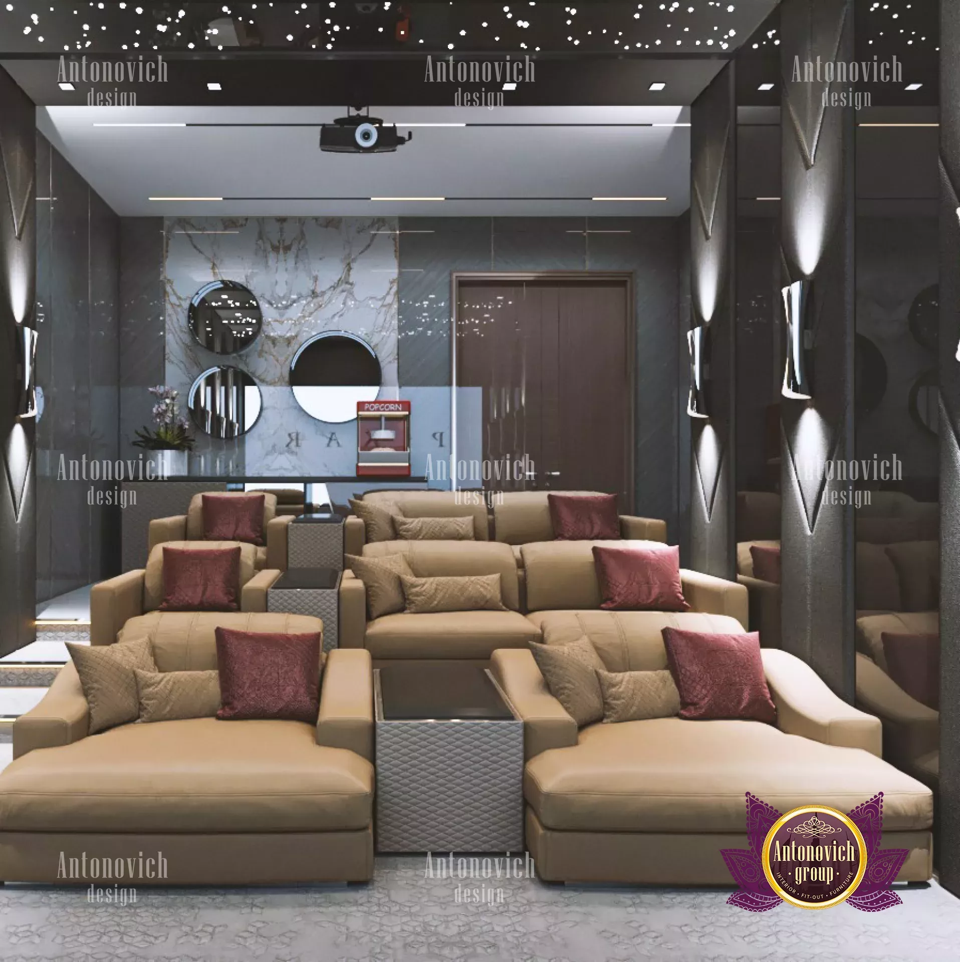 يستحضر تصميم هذه السينما المنزلية أجواء دور العرض الفاخرة، فالموضوع مصمم ببراعة وأناقة. تم اختيار كراسي مريحة قابلة للتعديل تشبه الـlazy boy لتجربة مشاهدة استثنائية. يعمل الأسلوب المستخدم في التصميم الداخلي على جعل الغرفة نصف مظلمة دون فقدان الراحة. بالرغم من كونه داخل منزلك، فإن هذا المسرح سيشبه قصور السينما الفاخرة، ويمكنك مشاهدة أفلامك المفضلة ولعب الألعاب بنفس الجودة. الغرفة تتجاوز مجرد أريكة وشاشة؛ لتحقيق ذلك يجب التحكم في الضوء الخارجي وبناء صورة بحجم مناسب. اتبع هذه الإرشادات لبناء تصميم مسرح منزلي عالي المستوى. لأفكار تشطيب متقنة، راجع تصميم حمام فاخر. للمساحات الكبيرة، استكشف تصميم فلل في أستراليا لمعايير مشابهة في المساحة والتشطيب. لتنسيقات المساحات المجاورة، اطلع على ديكور غرفة طعام في دبي. أنطونوفيتش ديزاين (Antonovich Design) ترفع باستمرار المعايير في كل تصميم سينما منزلية فاخرة من خلال نهج صارم للحلول الداخلية والتنفيذ. يختار فريقنا أفضل المواد والتجهيزات والأثاث لتقديم تجهيزات سينما منزلية عالية الجودة ويطبق استراتيجيات تصميم مبتكرة على كل مشروع.