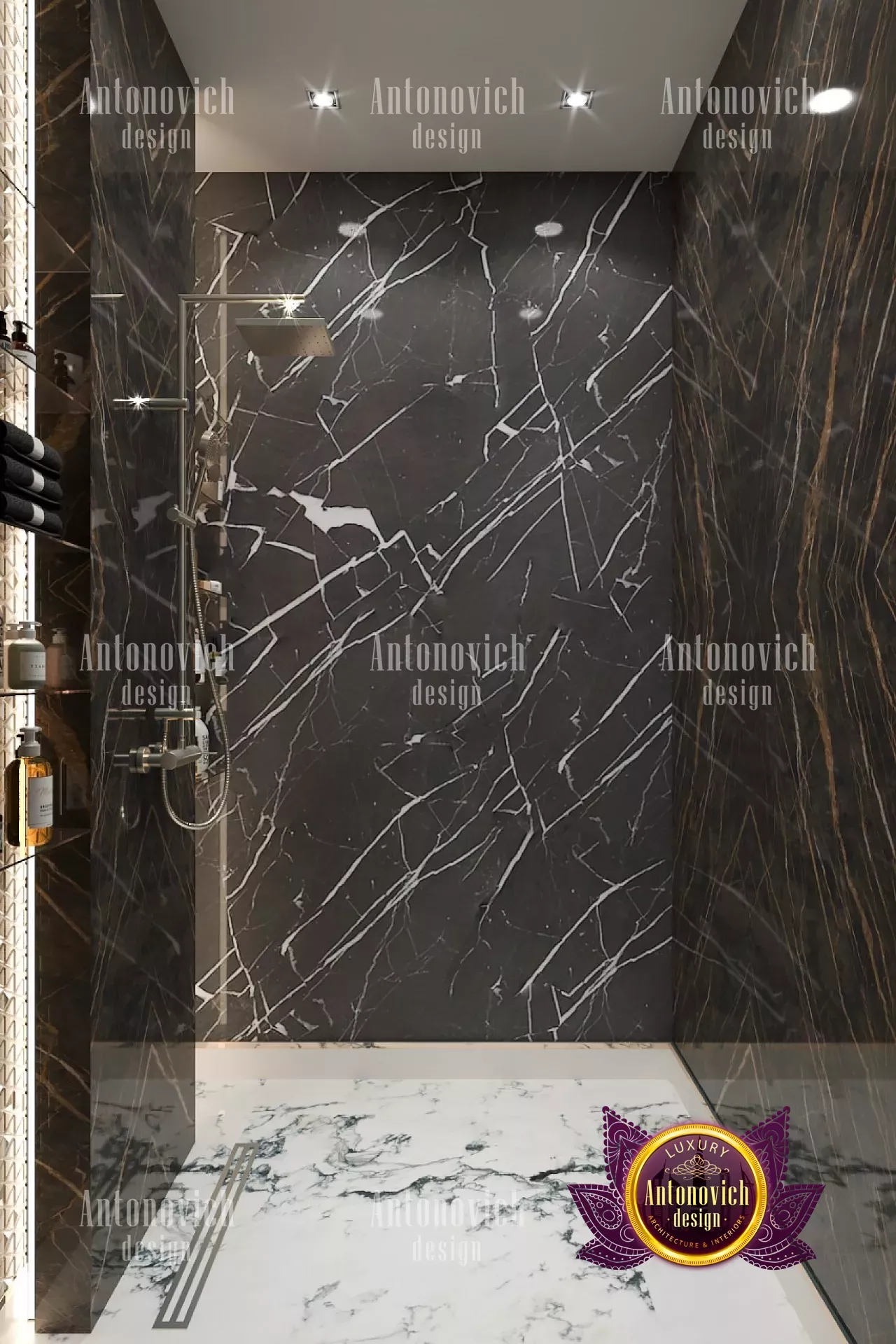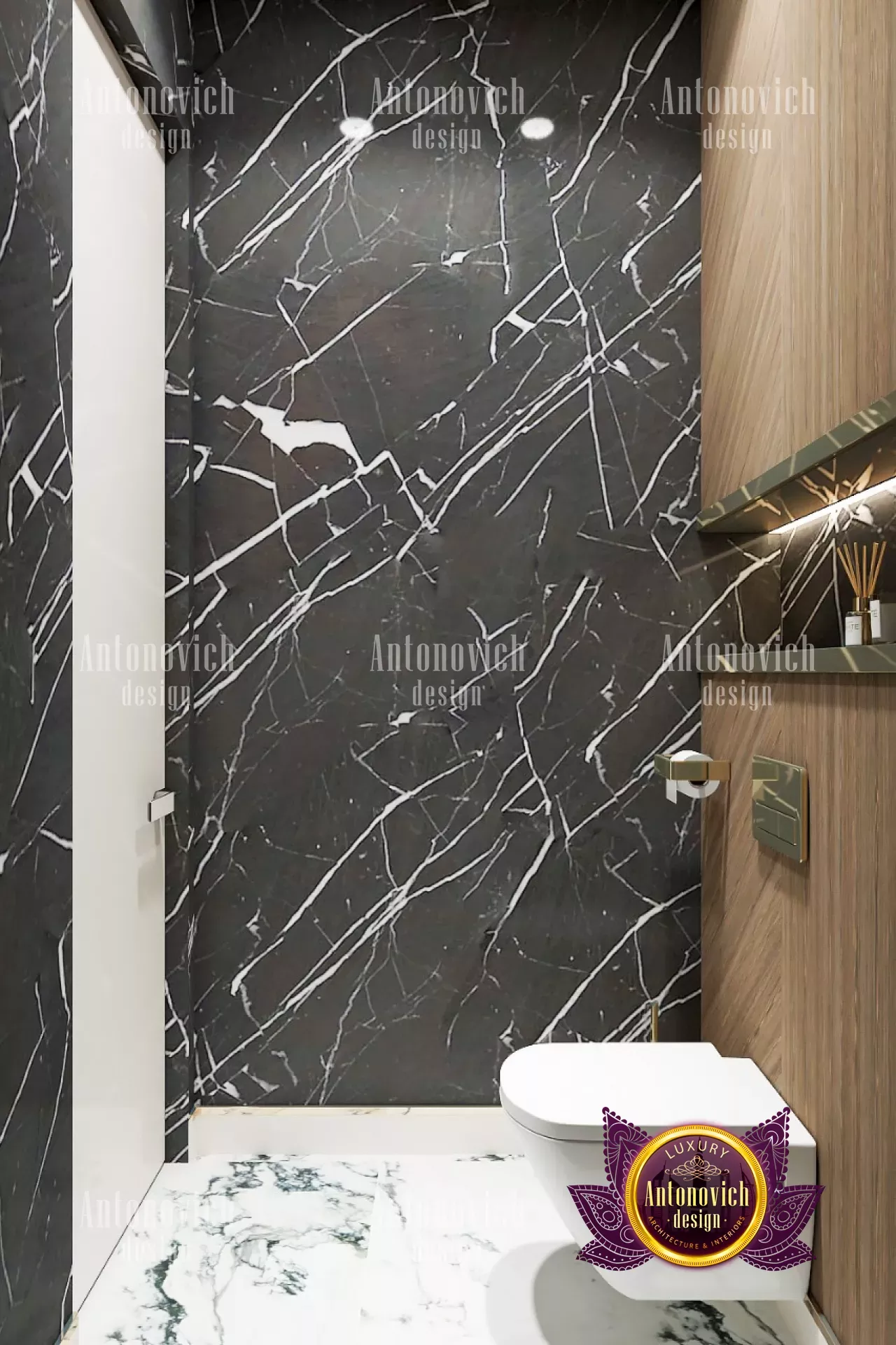 في دبي، الفخامة مطلب واضح، وتستحق أفضل تصميم حمام فاخر في دبي. تلعب الألوان البنية دورًا بارزًا في هذا الحمام، بينما تتناغم قطعتان رئيسيتان ذات نقش مركزي مع أرضيات راقية؛ لذا تُعد أرضيات رخام للحمام الفاخر من العناصر التي تعزز المظهر العام. المقاعد والحوض بتشطيب غني وتصميم رائع يبرزان حرفية القطع. البني بدرجاته مزيج ناجح في التصميم الداخلي. النمط الجميل والنغمات الذهبية والبنية تمنح المكان شعورًا فخمًا للغاية. كما أن الإضاءة المختارة تضيف تأثيرًا مميزًا؛ إضاءة حمام بلمسات ذهبية تبرز تفاصيل التصميم. كما أن التخطيط الداخلي يتضمن مساحة رفوف متناغمة مع الجدران تُكمل المظهر العام للمكان.