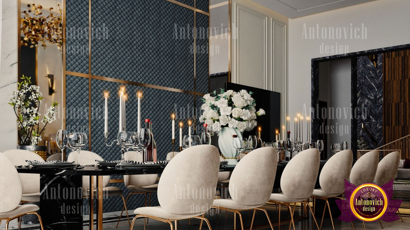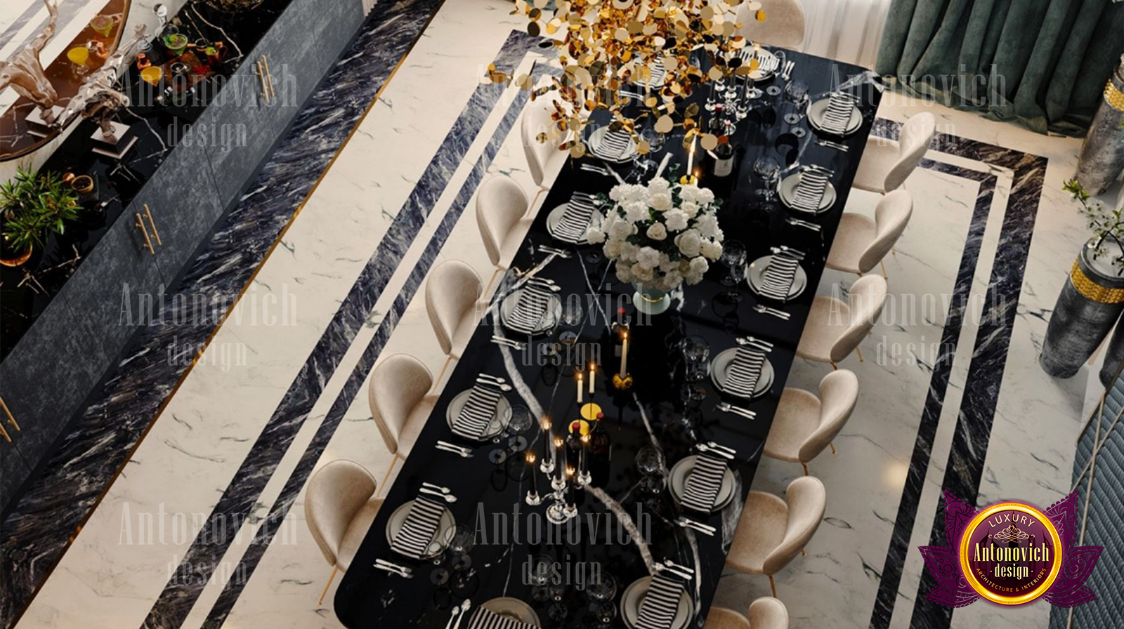 عندما نتحدث عن التصميم الداخلي الفاخر، من الضروري أن يتناسب التصميم مع شخصيتك. كل زاوية هنا مصممة بلمسة عصرية وتفاصيل رائعة. تُطبّق هذه النصائح في مساحات بأحجام مختلفة، لكن ينبغي تجنّب الأسقف المنخفضة إذا كنت لا تريد لضيوفك الشعور بضيق. جميع التصاميم من أعلى مستويات الجودة وتتمتع بأسلوب فريد. اطّلع أيضاً على تصميم داخلي فاخر لبنتهاوس. لضمان أروع تصميم منزلي فاخر، ضمنت شركة أنطونوفيتش ديزاين (Antonovich Design)، إحدى أبرز شركات التصميم الداخلي في دبي، تناغم الألوان في هذا الابتكار الأسود والذهبي. اختبر أناقة الأثاث الإيطالي. تنسّق باقة الزهور الكبيرة، التي تعمل كمركز طاولة وطول ممدود، تقريباً على طول الطاولة. مراكز الطاولة الزهرية سهلة التنفيذ وتتغير كثيراً، ما يمنحك فرصة لتجديد المظهر أسبوعياً؛ لذا فهذه طريقة فعّالة لإعادة تشكيل ديكور غرفة طعام فخم في دبي بلمسة بسيطة؛ ويمكنك تطبيق أفكار تصميم غرفة الطعام الفاخرة هذه في غرفة نوم مريحة لفيلا فاخرة أيضاً.