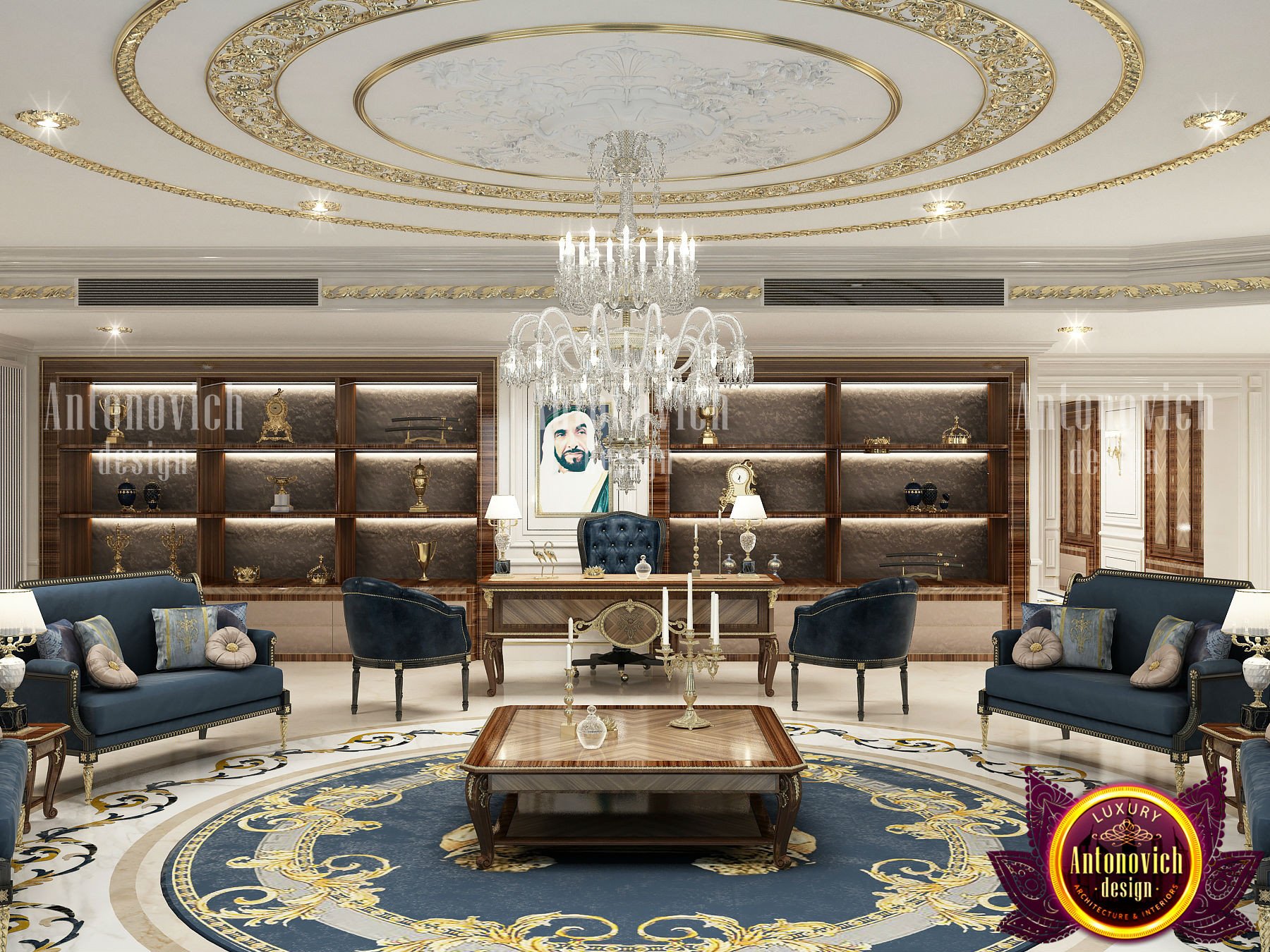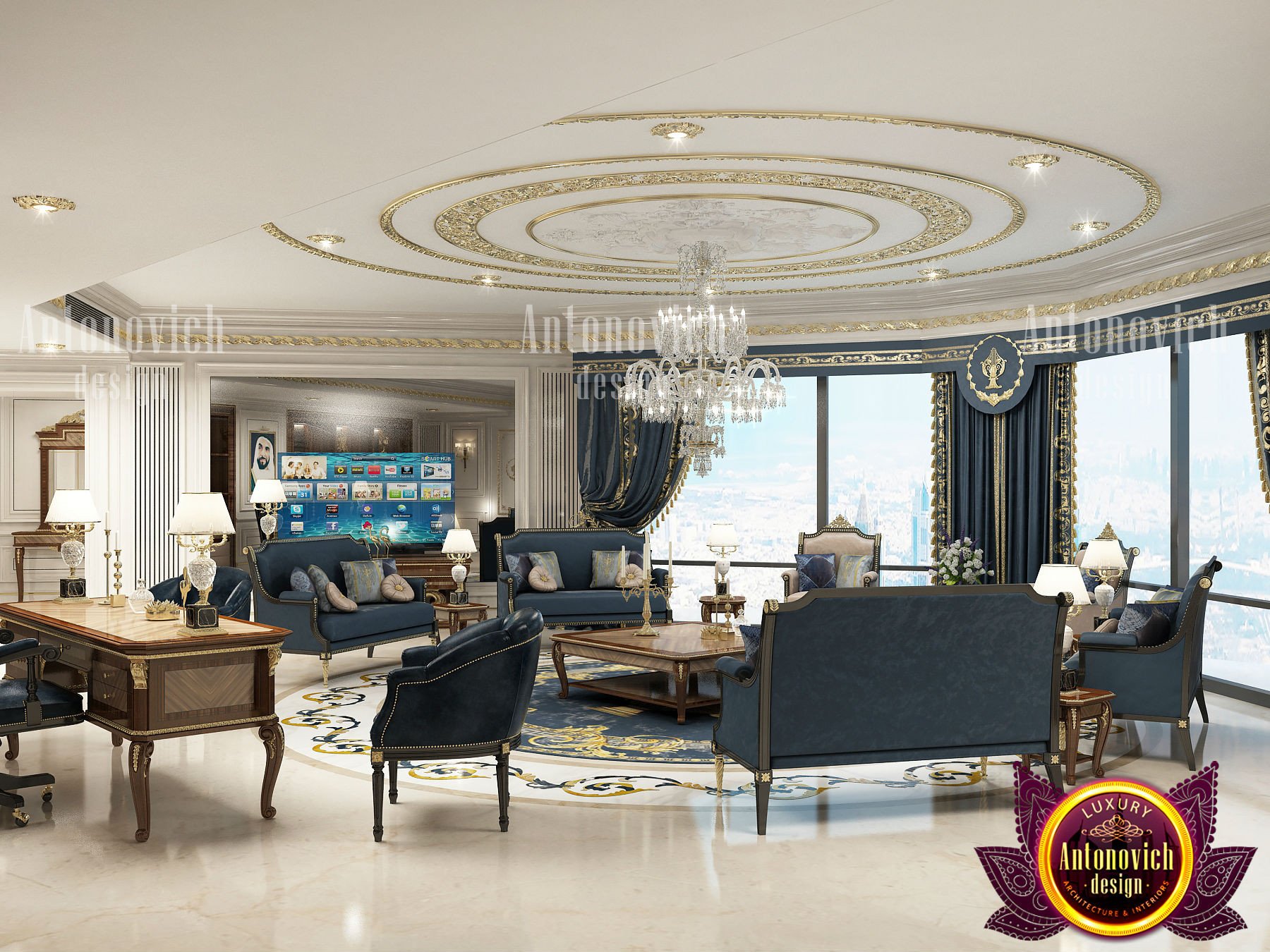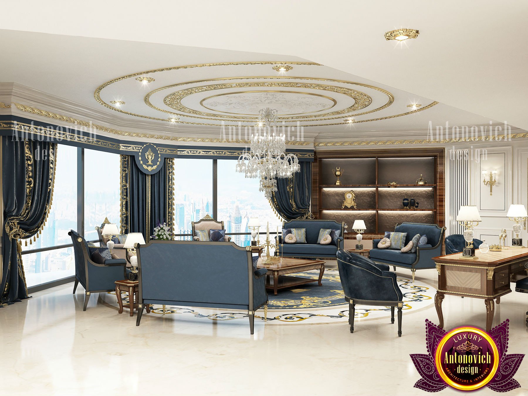 تتباين الدرجات الدقيقة من الأبيض والبني بانسجام مع الأزرق الملكي لفرش الأرائك والكراسي في منطقة الاستقبال. ولتفادي الفراغات المملة، وُضِعت عناصر زخرفية مدروسة في نقاط محورية، أما العنصر البصري الأبرز فكان النوافذ البانورامية الكبيرة المزينة بستائر حريرية فاخرة تتناغم مع تنجيد الأثاث. هذه خيارات التشطيب تستوحي من تصميم صالات السبا والصالونات الفاخرة، لتعزيز الأجواء الهادئة والرقي.