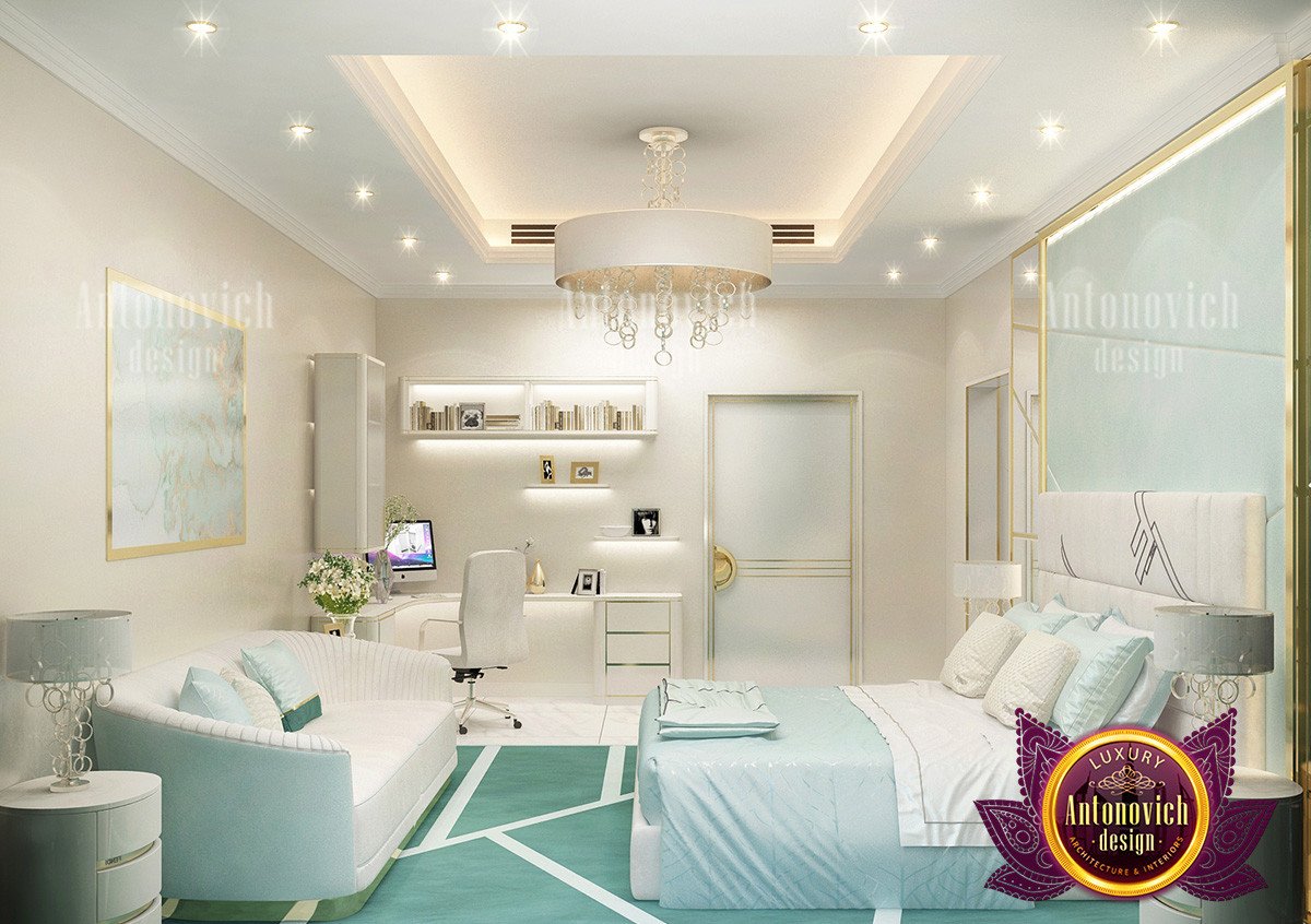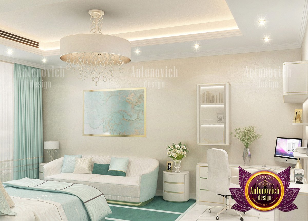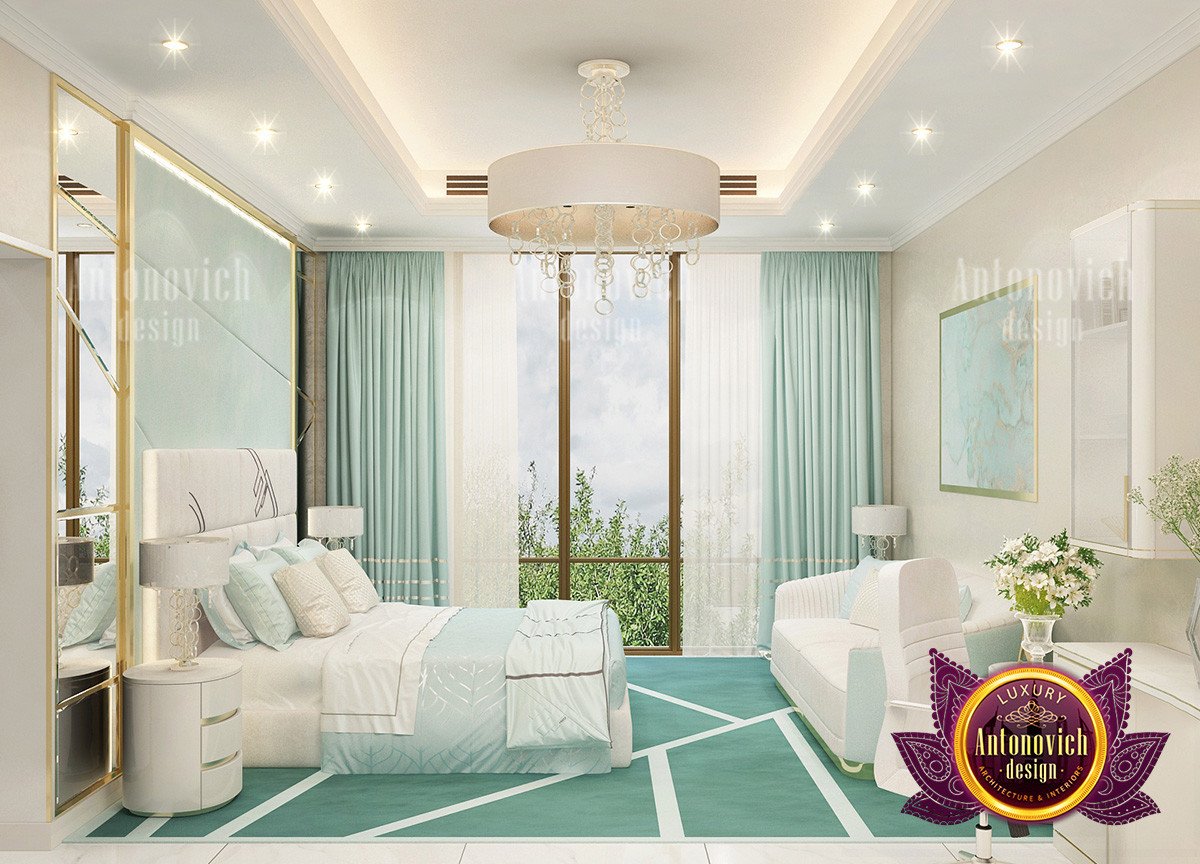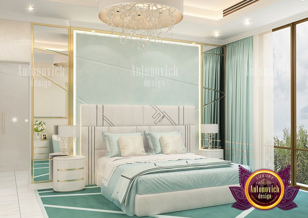 السرير كبير ولوح الرأس تصميمه تجريدي للغاية. اللون الناعم والجميل يجعل الغرفة أكثر قدرة على الإبهار، وتساعد اللمسات الذهبية على إضفاء مظهر أكثر فخامة. الثريا مرحة وفي الوقت نفسه فخمة، والستائر مصممة بلون أخضر فاتح سادة لتمنح الالتفات لبقية عناصر الغرفة مثل الأثاث الجميل المصنوع بأيدي المصممين والحرفيين الموهوبين في أنطونوفيتش ديزاين. كما تبرز تصاميم كاترينا أنطونوفيتش بأمثلة أثاث تضفي طابعاً فريداً على المساحة.