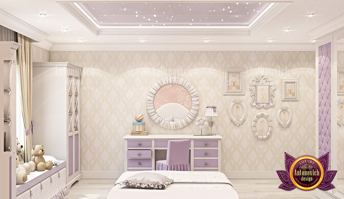 لأميرتكِ الصغيرة، اخترنا سريراً رقيقاً مزيناً بزخارف بنفسجية ولمسات مُبطنة وسقف إنارة حالمي. اخترنا نوافذ بلون أبيض نقي لمنح إضاءة طبيعية معتدلة مع حماية الغرفة من حرارة شديدة. قمنا بتغطية الجدران بنقوش تتناغم مع درجات الغرفة، وأكملنا المظهر بلمسات بنفسجية لإضافة تباين أنيق. أدرجنا بعض قطع الديكور المستوحاة من الأصالة، مثل المرايا وإطارات الصور. غني بالألوان وستائر ثقيلة، هذه الغرفة مناسبة لأميرة صغيرة. ومع أن الستائر الثقيلة قد لا تكون مناسبة تماماً لبيئتنا المناخية، فقد اخترنا ستائر خفيفة مع إضاءة مُدارة بعناية. أضفنا ألواناً للمساحة باختيار درجات باستيلية للجدران والوسائد. ما أروع هذه المواد! أميرتكِ الصغيرة ستشعر بلا شك بتميز إضافي مع هذا الأثاث المُخصّص المزخرف بالتنّجيد وتاج مستوحى من التصميم. نحافظ على مظهر متناسق بطلاء القطع بألوان حيادية عصرية.