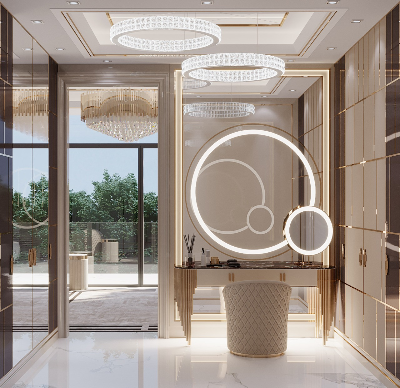 بالإضافة إلى ذلك، يتضمن التصميم الداخلي الفاخر قطع أثاث فريدة لا تُرى إلا في هذا المحيط، مما يخلق خزانة ملابس واسعة بمواصفات عالية. تم تصميم ديكور غرفة الملابس ليلائم كل احتياجاتك أثناء ارتداء الملابس، مع لمسة تصميم دولاب المشي الفاخر التي تجذب الأنظار. هل تبحث عن تصميم غرفة ملابس في أبوظبي؟ استعرض أمثلة تصميم غرفة ملابس في أبوظبي للمقارنة. ستعجبك فكرة الغرفة البيضاء ذات اللمسات الذهبية؛ أفكار غرفة ملابس فاخرة في دبي تظهر كيف يعمل المزيج بين الألوان الفاتحة والبنية الداكنة بفعالية في المنزل الحديث. تعزيز التصميم بالألوان المناسبة يرفع مستوى التصميم الداخلي لخزانة الملابس الفاخرة ويُبرز خطوط الخزائن والتشطيبات. ولتصميم المساحات العملية داخل المنزل راجع تصميم مكتب أنيق للغاية.