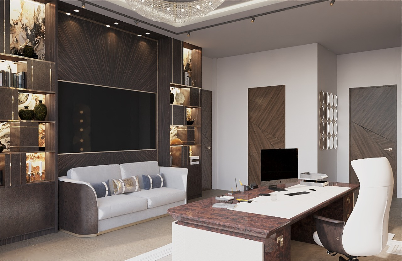 يجمع التصميم البني الدافئ لتصميم المكتب المنزلي الفاخر رفوفاً وخزائناً مميزة لتخزين أدوات المكتب. إلى جانب ذلك هيكل مدهش صُمم لتحسين سير العمل. يمكننا أيضاً تنسيق الغرف المجاورة، بما في ذلك تصميم حمام الضيوف المطابق، ليشعر المنزل بأكمله بالتكامل. نقوم بتنفيذ مشاريع دولية أيضاً، مثل تصميم داخلي لندن؛ كما نقدّم مخطط منزل فاخر 2 للمشاريع الكبيرة، وللمشروعات الضيافية راجع تصاميم خارجية للمطاعم. العناصر التالية يجب أن تتواجد في تصميم مكتب منزلي فاخر: