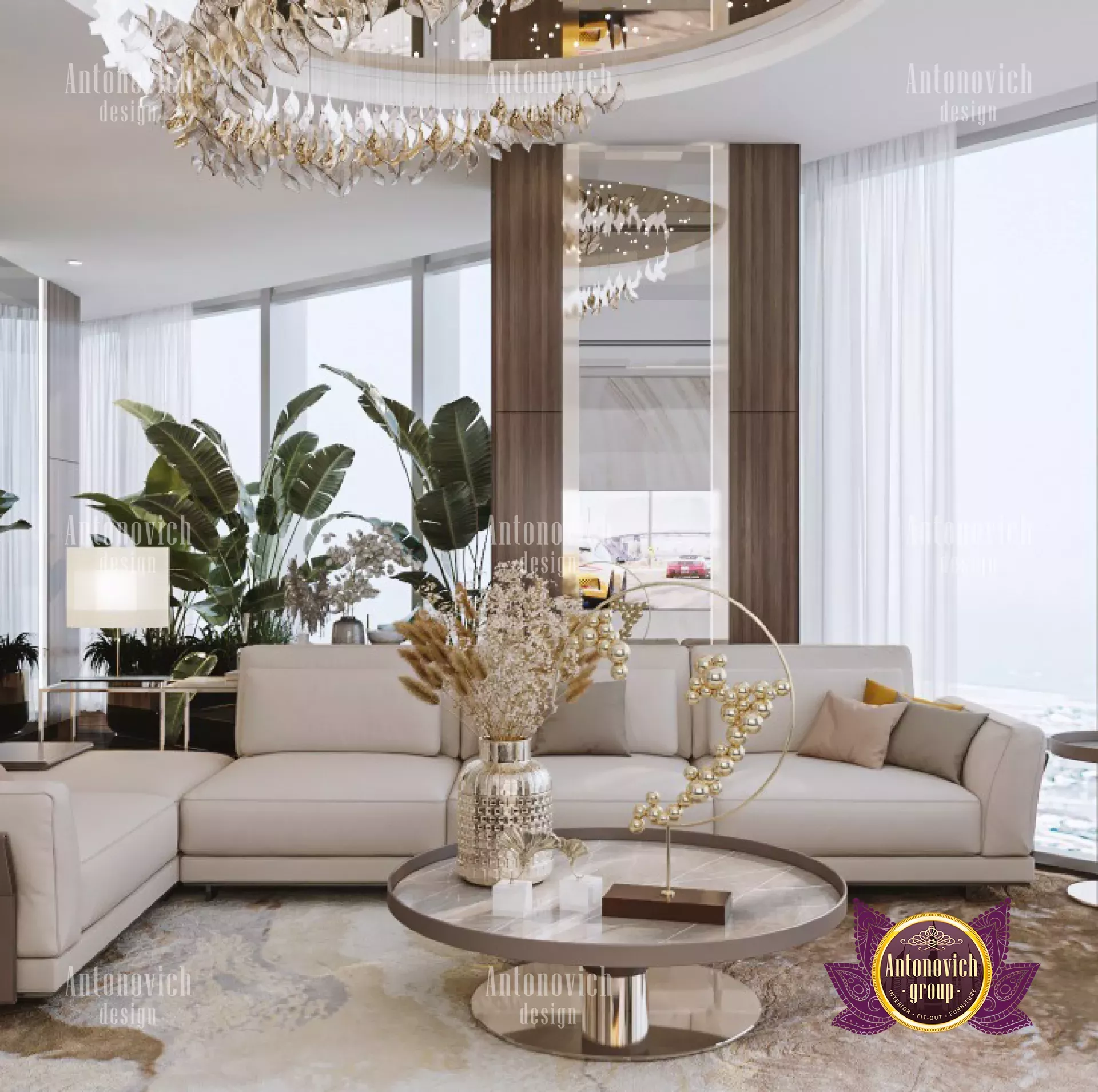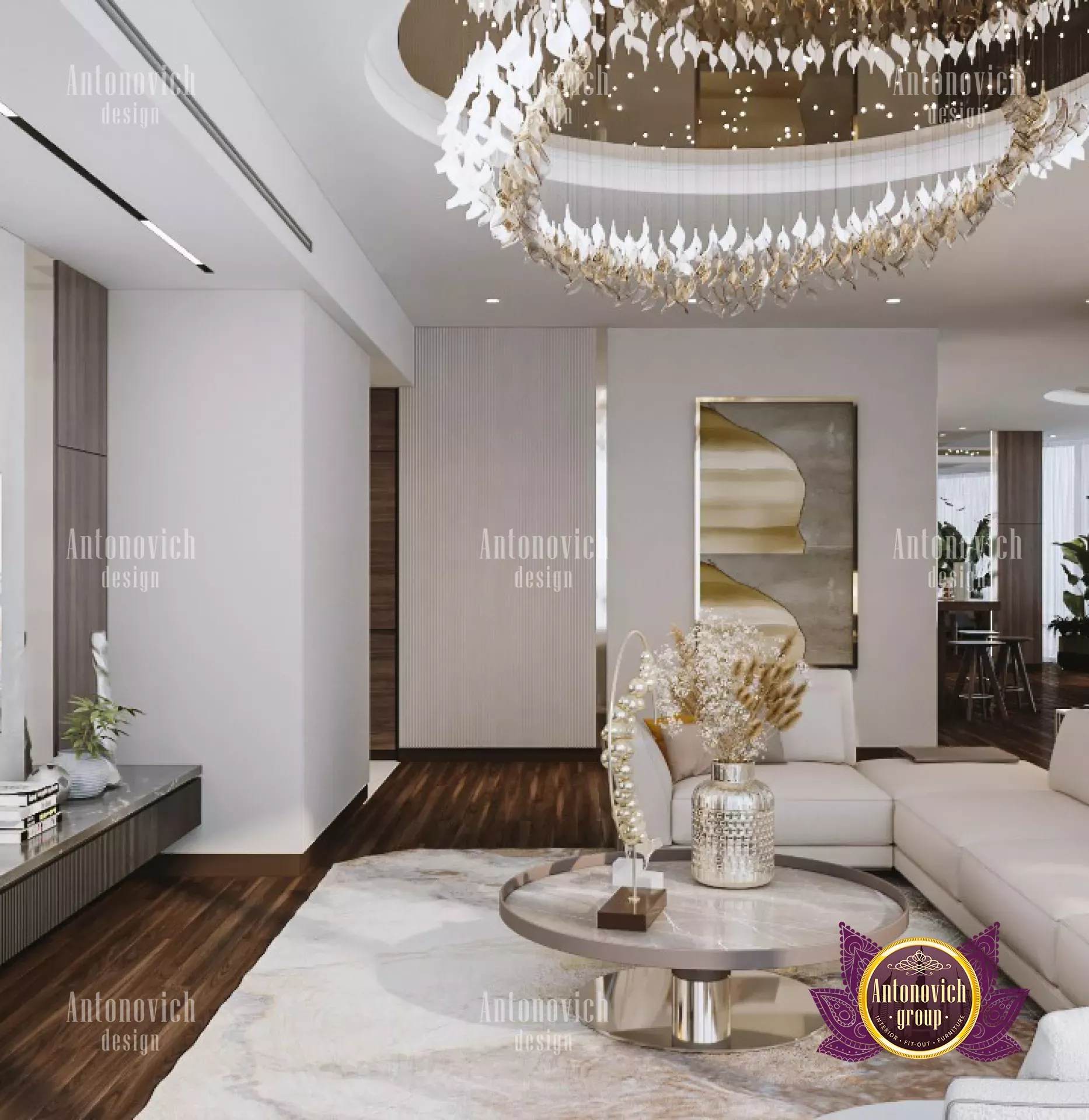 في تصميم المنازل الفاخرة المعاصر، تحظى الثريات بشعبية كبيرة. كما تبرز مجموعة الإضاءة الجديدة. تكشف هذه الصور عن تفاصيل التصميم الدقيقة وعجائب الحرفة. الثريا الكُرية المصممة بدقة تمنح المكان طابعاً ملكياً. عموماً، الألوان داخل الشقة مناسبة لمبنى راقٍ. يخلق التباين بين المزخرف الحلزوني والسلّة الكبيرة والكنبة الأنيقة واللمسات الرخامية مزيجاً رائعاً من الفخامة والأناقة. رغم أن الأسلوب مسألة ذوق شخصي، لا شك في أنك تستطيع تجميل منزلك باختيار النمط الصحيح. في غرفة الجلوس هذه، المساحة الكبيرة للكنبة هي القطعة الأبرز. تستطيع هذه الخطة استيعاب حوالي ١٥ شخصاً. سكن ممتاز للعائلات الكبيرة. ولتجارب الترفيه المنزلي، اطلع على سينما منزلية مذهلة. تجمع الطاولات المركزية بين المربعات والدوائر بتباين بصري مبهر. هناك تصاميم ثريات جميلة تنبض بالحياة في مساحتك. كما جُهّزت ستائر كبيرة مُفصّلة لتغطية النوافذ الواسعة الجميلة. ستُقدّر التصميم الإضاءة المعمارية على السقف. وللأسقف، راجع التصميم الفني لطلاء الأسقف. ميزة بارزة أخرى في هذا التصميم الأنيق هي الأرضية. النمط واللمسة الملموسة كلاهما رائعان؛ له تأثير فني مزخرف وفاخر. أضيفت مجموعة نباتات لخلق جوٍ طبيعي أكثر، وطاولات جانبية صغيرة وعناصر من الخشب الداكن لتأكيد أناقة وشُعْبَة التصميم.