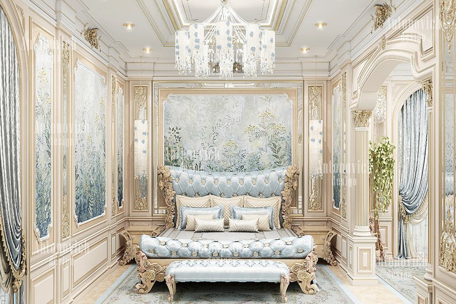 قُمنا بتطوير تصميم غرفة نوم متكامل يتطابق في الحالة والمزاج مع باقي مساحات المنزل. راجع كيف صممنا الجدران والأعمال الجبسية بأسلوب فني أنيق غالباً ما يشمل تفاصيل جدارية مزخرفة. كما يمكنك مشاهدة ديكور غرفة نوم رائع وأفكار أثاث غرف نوم لتحويل المساحة، ونصمم أيضاً غرف نوم بنات أنيقة حسب متطلبات العائلة. ولراحة قصوى اخترنا أسقفاً مضيئة وثريات تحيط الغرفة بإضاءة فاخرة، مع تركيب سجاد أنيق يكمل إعداد التصميم الداخلي.