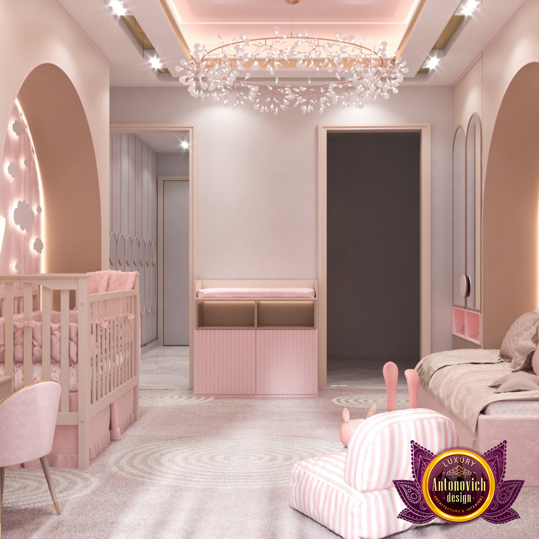 مع هذا التصميم الداخلي الفاخر لغرفة الأطفال، سيشعر أطفالك وكأنهن أميرات! مشروع تصميم غرفة نوم رائع يناسب طفلتين لأنه يحتوي على سريرين متشابهين. إطار السرير الأنيق فريد من نوعه. مرآة كبيرة خلف السرير تمنح الإحساس باتساع المساحة. التصميم الداخلي للغرفة الفاخرة يتميّز أيضاً بمرآيات صغيرة منتشرة على الجدران، ما يمنح الغرفة انطباعاً جميلاً. هذا التصميم المميز لغرفة الأطفال يتضمن رفوفاً وخزائن رائعة. تشطيباته الجميلة مثالية لتصميم غرف نوم فاخرة.